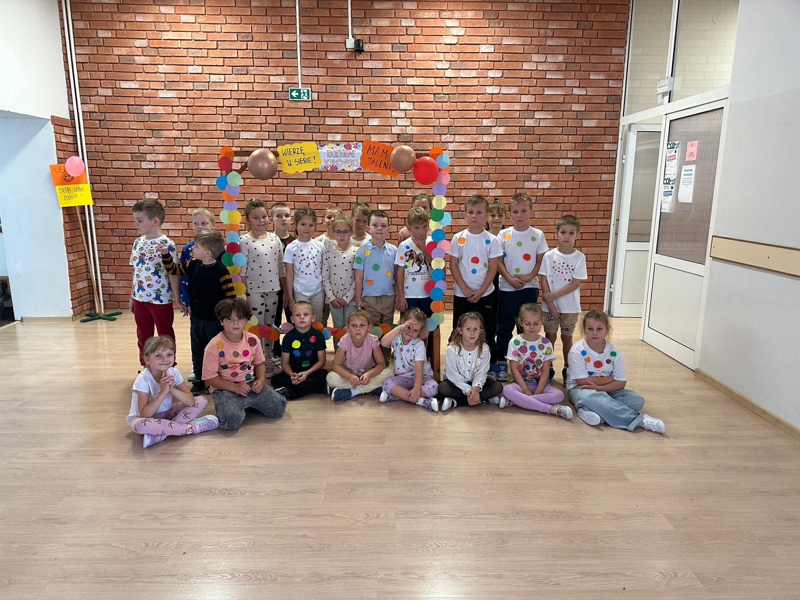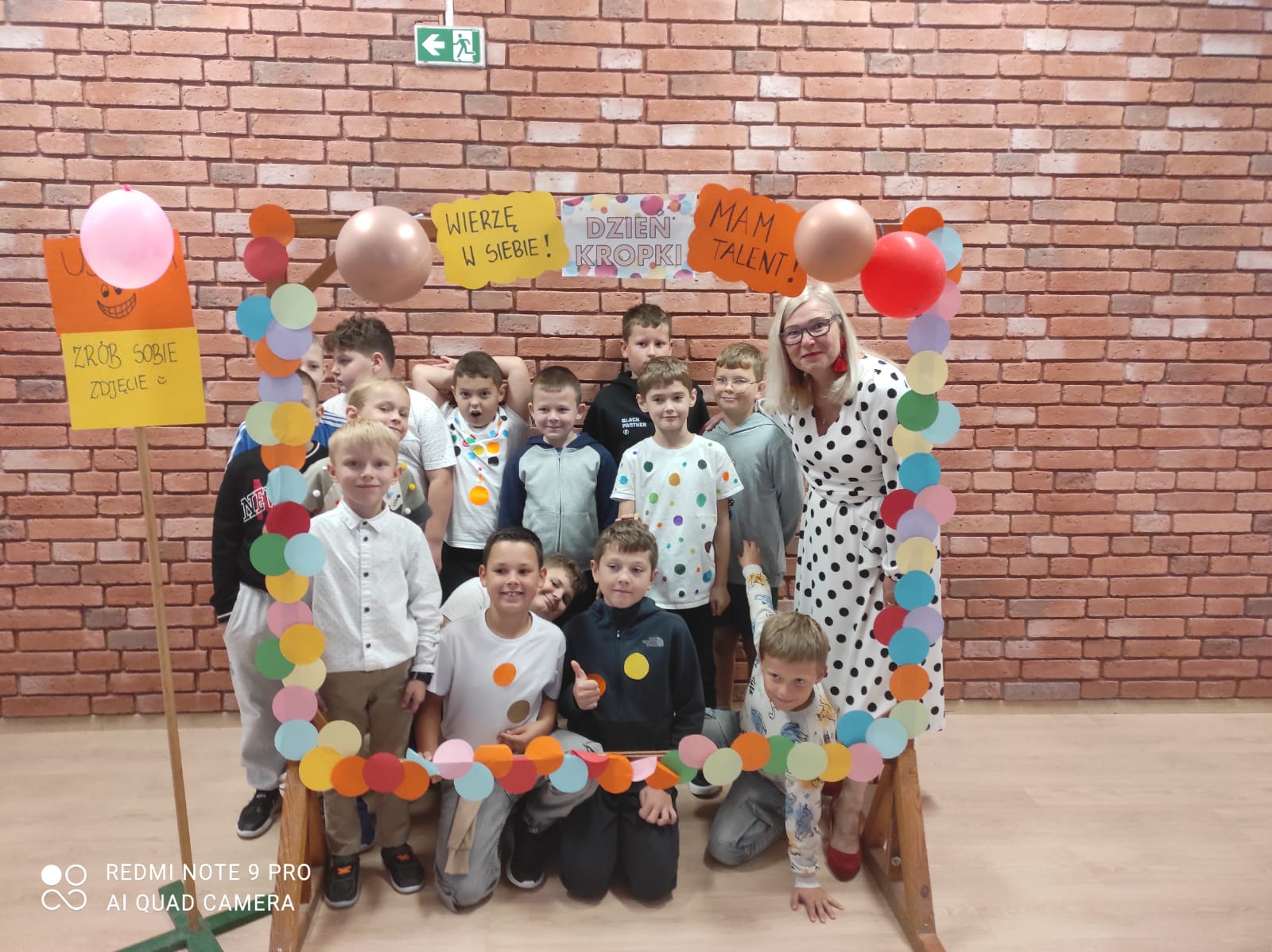 Tego dnia obowiązywały ubrania w kropki. Na auli szkolnej została rozstawiona fotobudka, gdzie uczniowie mogli robić sobie zdjęcia, a hasło przewodnie tego dnia brzmiało „ Wierzę w siebie” !, „ Mam talent”! Podczas zajęć w klasie dzieci obejrzały film „ Kropka”. Jego bohaterką jest mała Vashti, która dzięki malutkiej kropce i wspaniałej nauczycielce plastyki uwierzyła w swoje możliwości. Po projekcji oraz pogadance na temat filmu wszyscy uczniowie, przystąpili do wykonania swoich kropkowych dzieł . Wspaniałe efekty ich prac zostaną wywieszony na wystawie szkolnej.