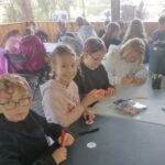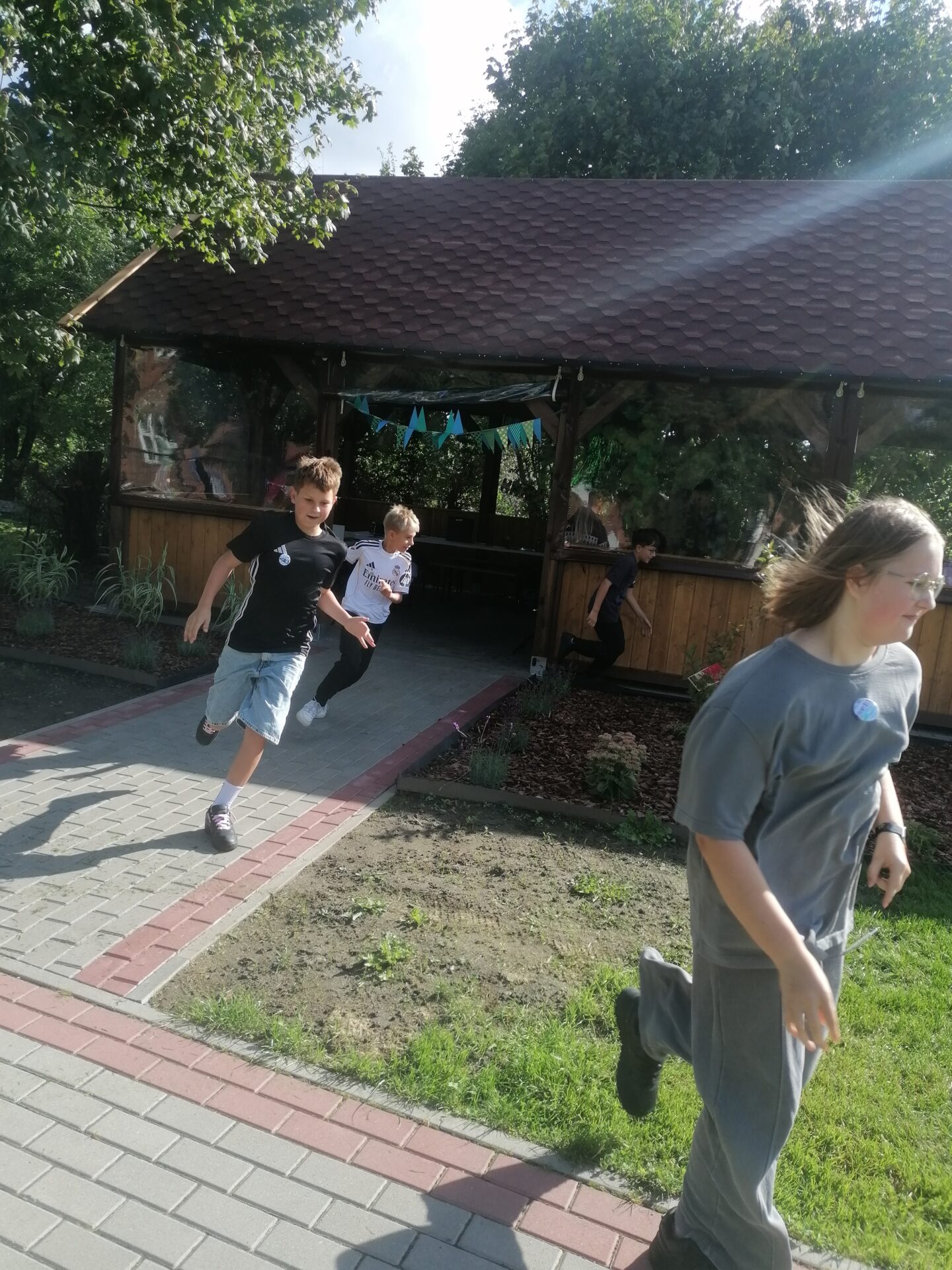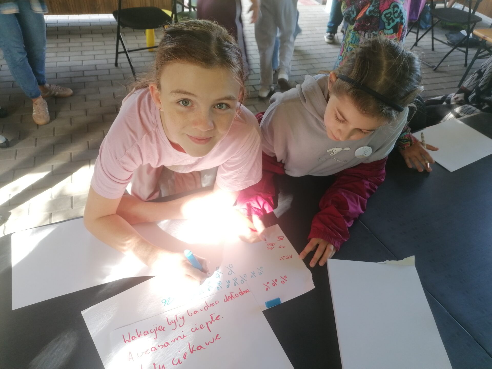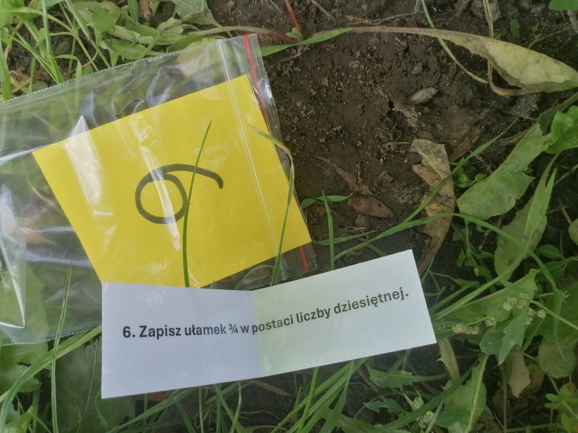 W końcu nadszedł czas wyścigu po zwycięstwo i dzieci rozbiegły się po placu, by odnajdywać ukryte pytania. Nie szukali ich jednak dowolnie, a na podstawie ilości oczek wyrzuconych i sumowanych na kostkach. Zagadki były naprawdę dobrze ukryte, więc odnajdywanie ich wymagało współpracy i …refleksu, bo liczył się czas. Pytania dostosowane były dla uczniów klasy 5 i, choć niektóre były zabawne i na luzie, to znalazły się też trudniejsze, odnoszące się do umiejętności z zakresu matematyki czy języka polskiego, np. „Zapisz ułamek ¾ w postaci liczby dziesiętnej”, „Odmień wyraz PIES przez wszystkie przypadki”.