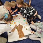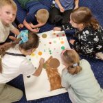 Opowiadanie zainspirowało oraz zachęciło dzieci do rozmowy, swobodnych wypowiedzi, opowiadań o swoich mocnych stronach. Wspólnie odkrywaliśmy swoje zdolności, bo każdy z nas ma w sobie jakiś ukryty talent. Następnie każde dziecko otrzymało połówkę kropki. Były one rozcięte w możliwie zróżnicowany sposób. Zadaniem było odnaleźć kolegę/koleżankę z drugą połową kropki. Po odnalezieniu i połączeniu się kropek dzieci przykleiły je na jeden wspólny plakat, który stał się drzewem talentów.