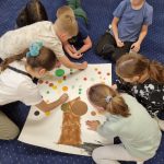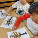 Zabawa dostarczyła dużo pozytywnych wrażeń płynących ze wspólnego działania, ale i odkrywania swoich talentów, co wpłynęło na budowanie poczucia wartości oraz pozytywnej samooceny. Ponadto dzieci tworzyły jesienne obrazy techniką puentylizmu – czyli kropek. Do stworzenia kompozycji wykorzystaliśmy patyczki do uszu oraz farby plakatowe. Dzieci zapełniały kropkami gęsto rozmieszczone jesienne barwy na swoich kartkach tworząc bardzo ciekawe i efektywne drzewa jesienne. Było kolorowo, kreatywnie „kropkowo” i radośnie, co można dostrzec w załączonej fotorelacji.