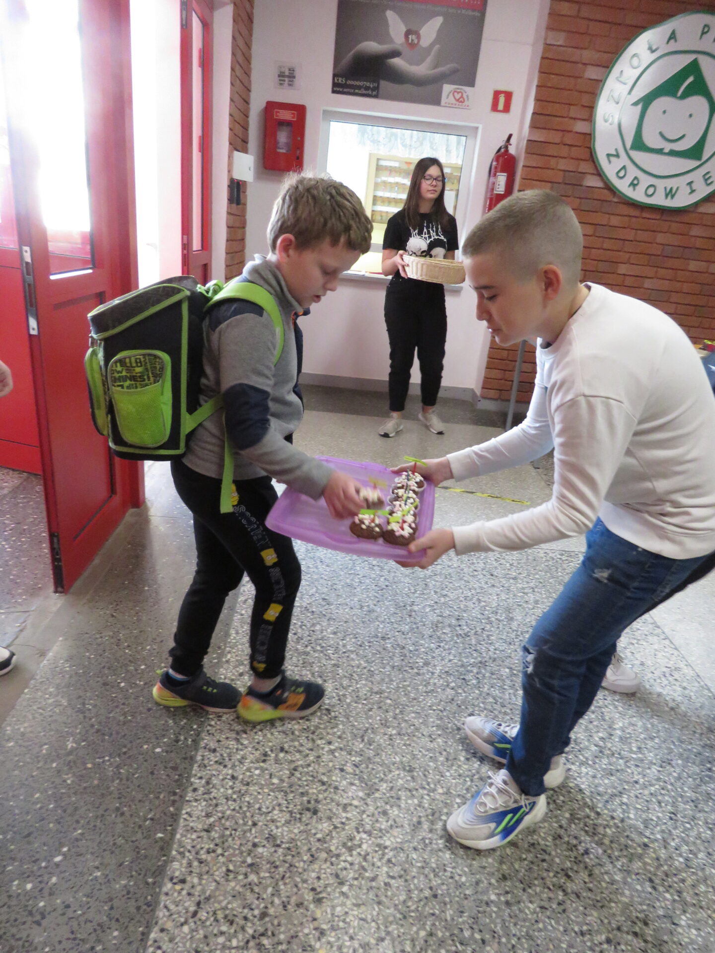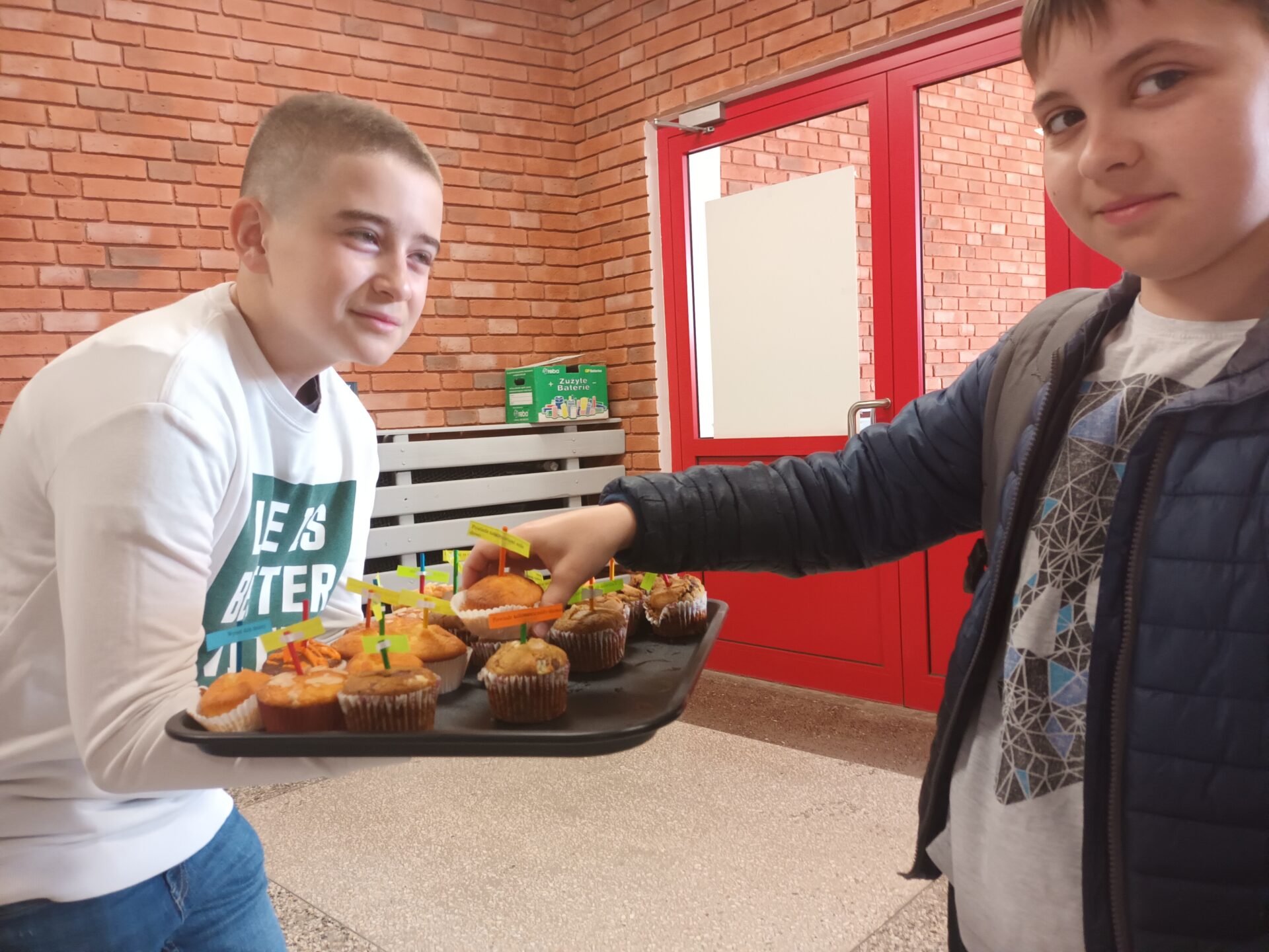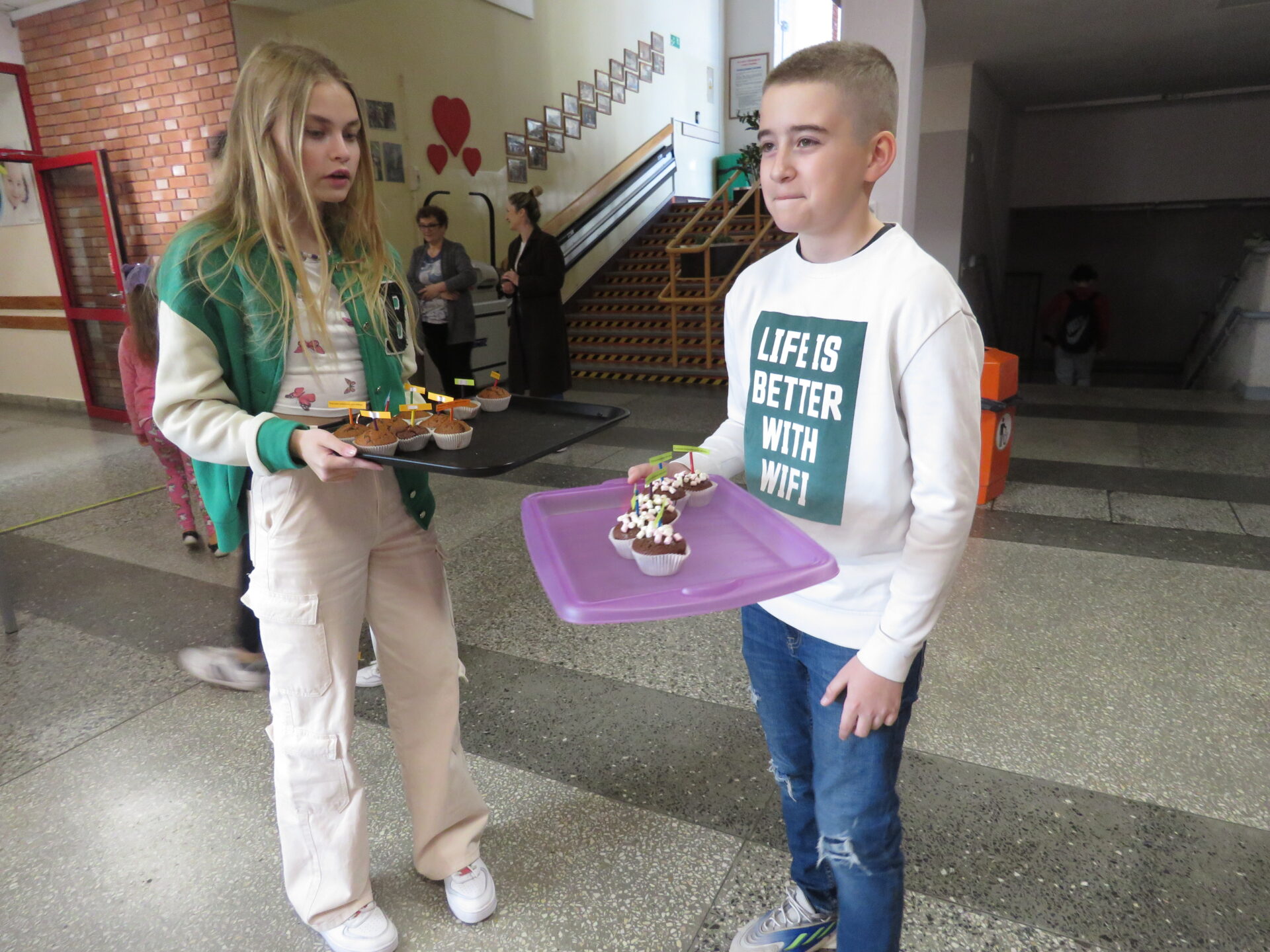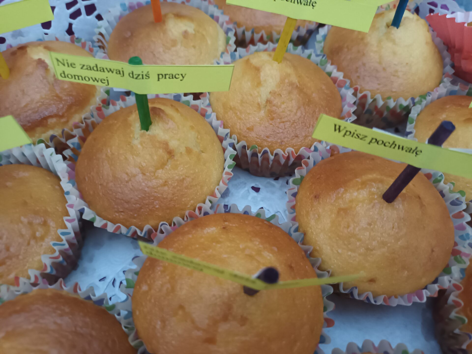 To był piękny dzień. Na dworze zaświeciło słońce i wreszcie zrobiło się ciepło, ale nie tylko tam, bo w naszej szkole tego dnia było szczególnie miło, ciepło i wesoło. 19 maja 2022r. obchodziliśmy „Dzień dobrych uczynków”. Tego dnia przy wejściu do szkoły na wszystkich czekała niespodzianka – były to „babeczki z dobrym uczynkiem”. Każdy uczeń, nauczyciel częstowany był babeczką, do której przyczepiona była karteczka z dobrym uczynkiem do wykonania „zrób rodzicom kolację”, „posprzątaj swój pokój”, „podziękuj za coś bliskiej osobie”, „powiedz koleżance coś miłego”, „wpisz pochwałę”, „nie zadawaj pracy domowej” itp. Każdy ze smakiem zjadał babeczkę i obiecał spełnić dobry uczynek.