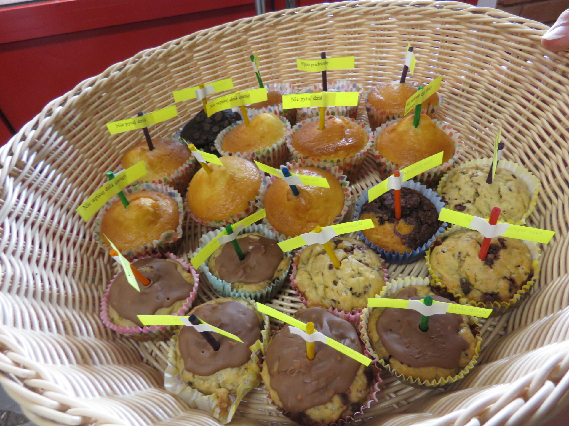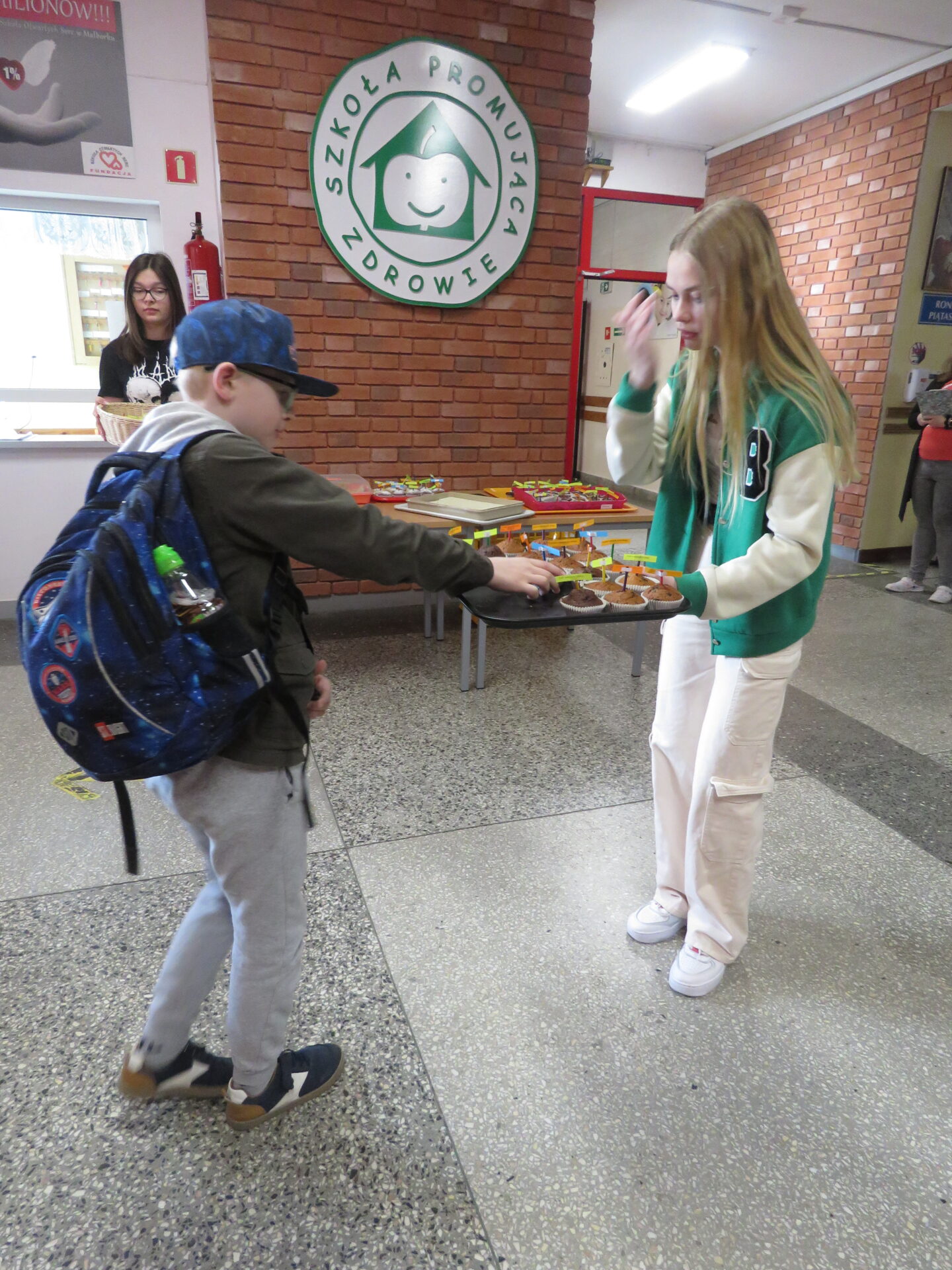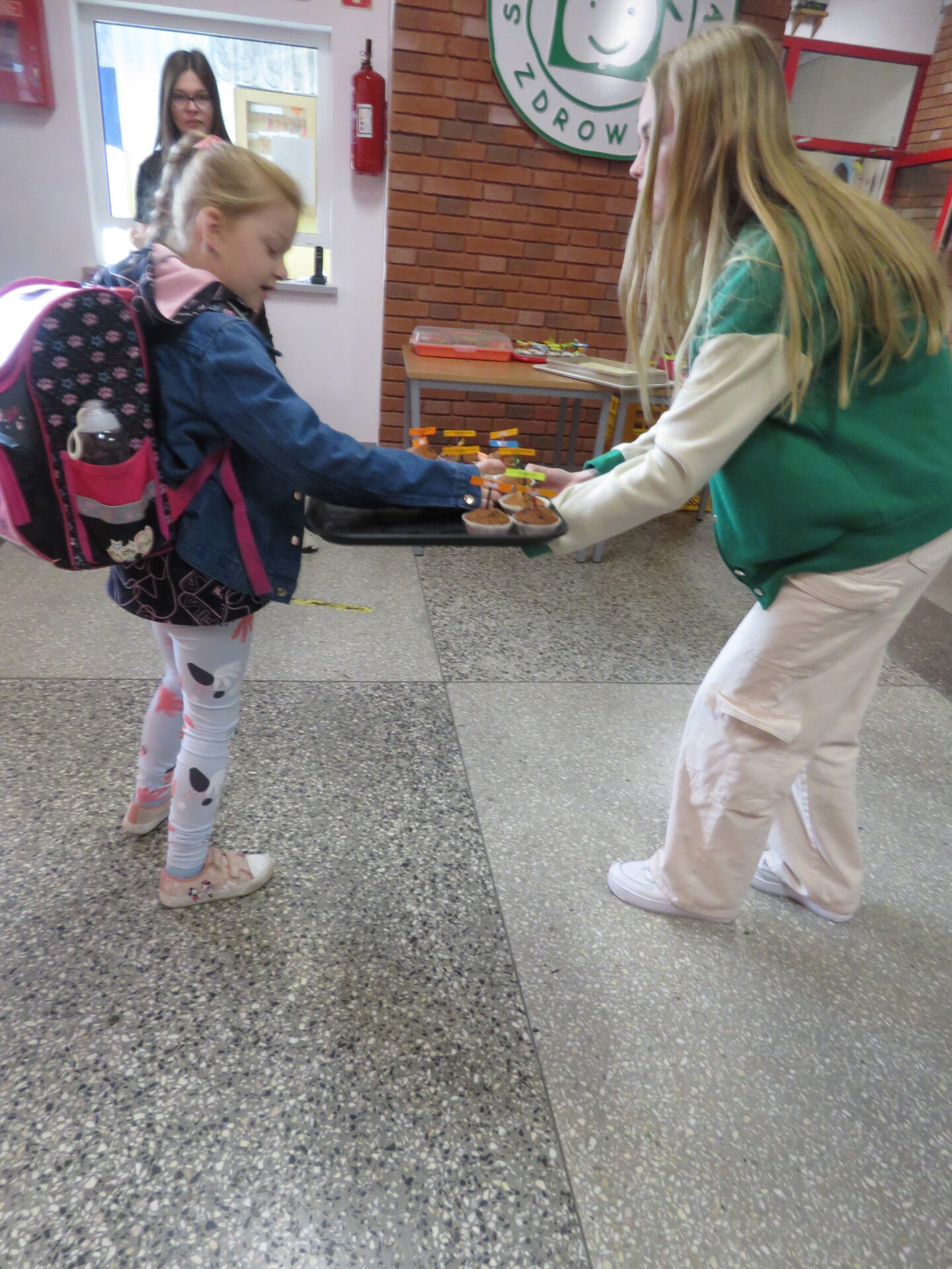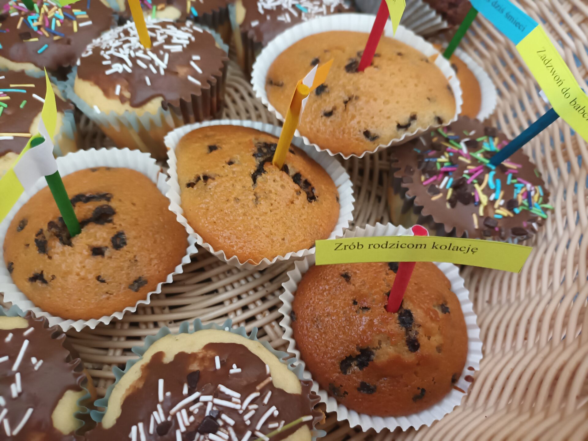 To był piękny dzień. Na dworze zaświeciło słońce i wreszcie zrobiło się ciepło, ale nie tylko tam, bo w naszej szkole tego dnia było szczególnie miło, ciepło i wesoło. 19 maja 2022r. obchodziliśmy „Dzień dobrych uczynków”. Tego dnia przy wejściu do szkoły na wszystkich czekała niespodzianka – były to „babeczki z dobrym uczynkiem”. Każdy uczeń, nauczyciel częstowany był babeczką, do której przyczepiona była karteczka z dobrym uczynkiem do wykonania „zrób rodzicom kolację”, „posprzątaj swój pokój”, „podziękuj za coś bliskiej osobie”, „powiedz koleżance coś miłego”, „wpisz pochwałę”, „nie zadawaj pracy domowej” itp. Każdy ze smakiem zjadał babeczkę i obiecał spełnić dobry uczynek.