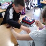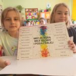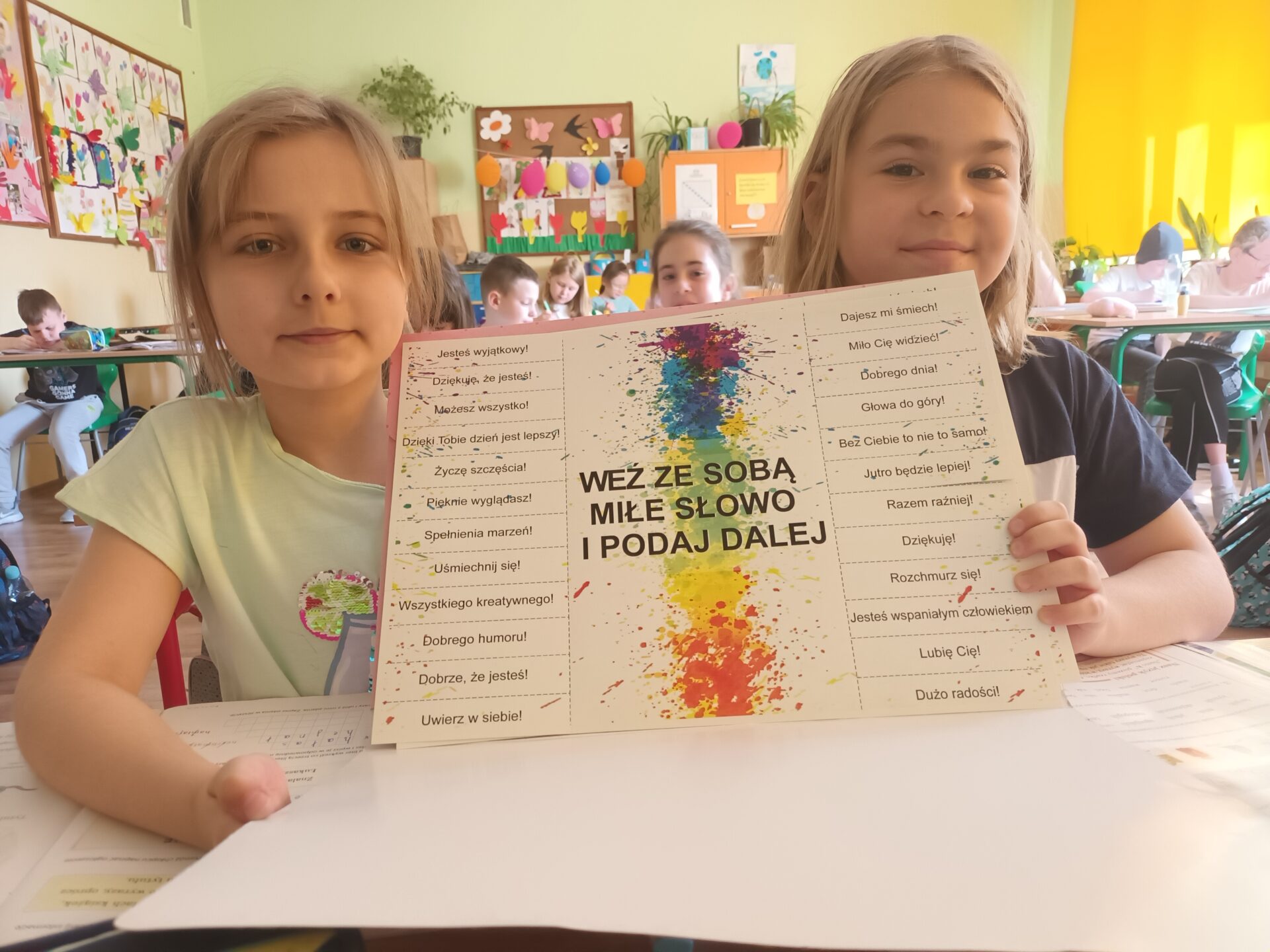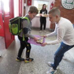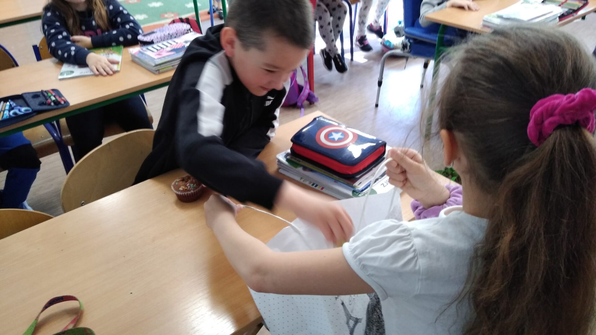 To nie koniec niespodzianek….Na każdą klasę czekała niespodzianka, która została dla niej przygotowana przez inną klasę. Była to akcja „ klasa dla klasy”. Śmiechu było co niemiara, a pomysły różne: słodkie co nieco, laurki, bransoletki przyjaźni, wspólna gra w kalambury, piosenka, miłe słowo na dobry dzień. Na twarzach uczniów malował się uśmiech, widać było radość z obdarowywania drugiego człowieka. Każda klasa wraz z wychowawcą spisała też „pozytywne wzmacniacze”, które zostaną później zebrane w szkolny słownik dobrych myśli.
