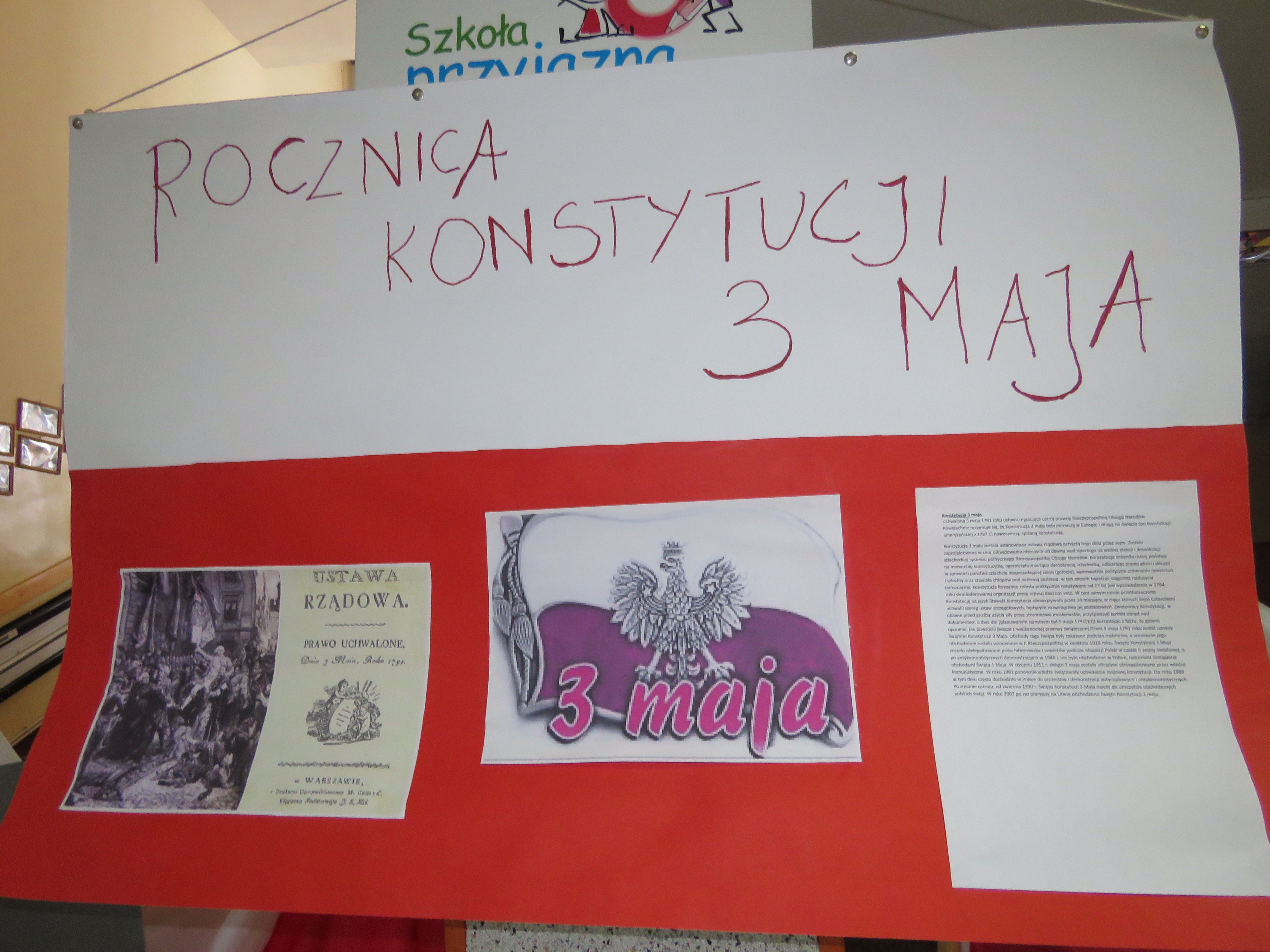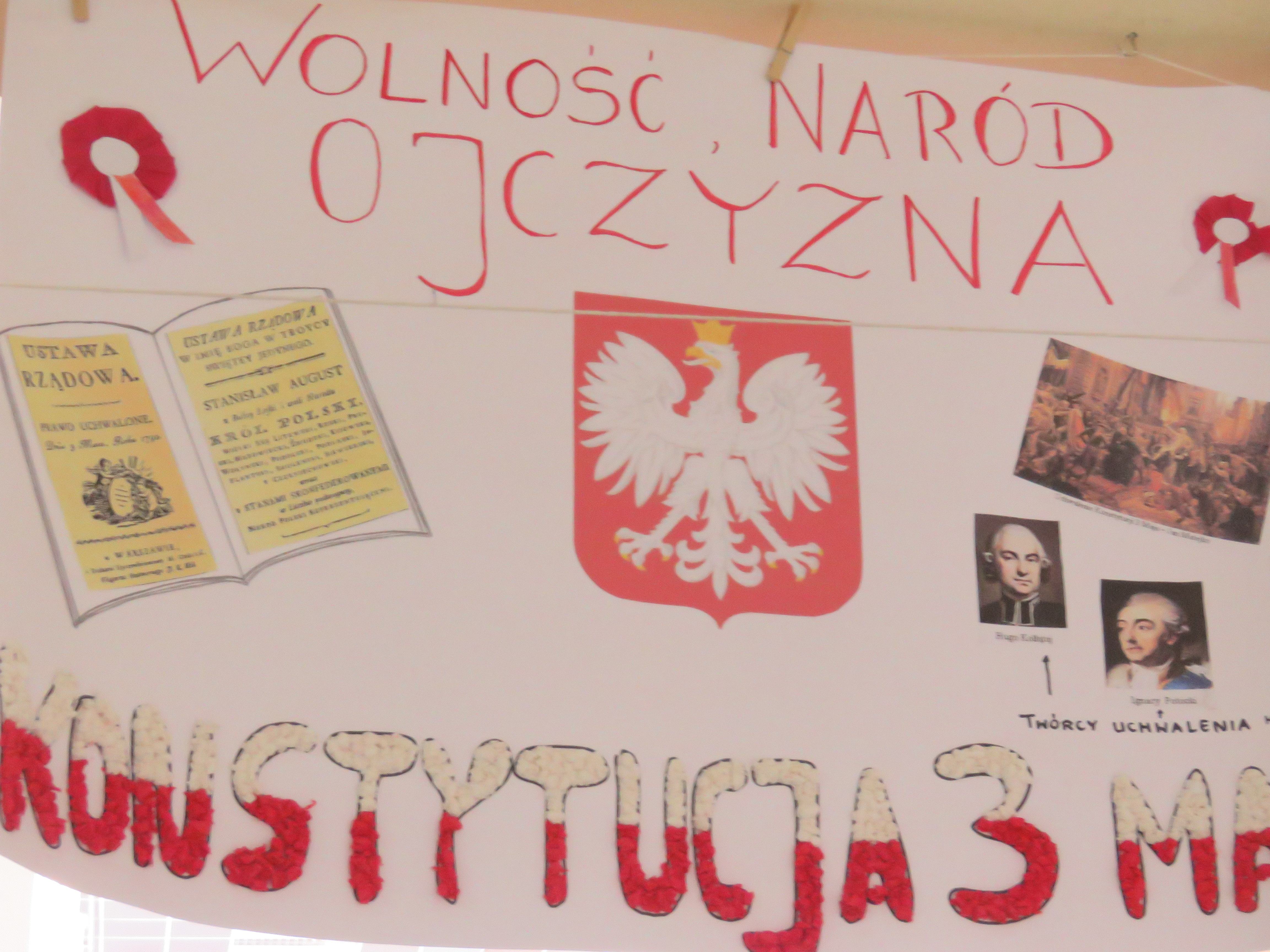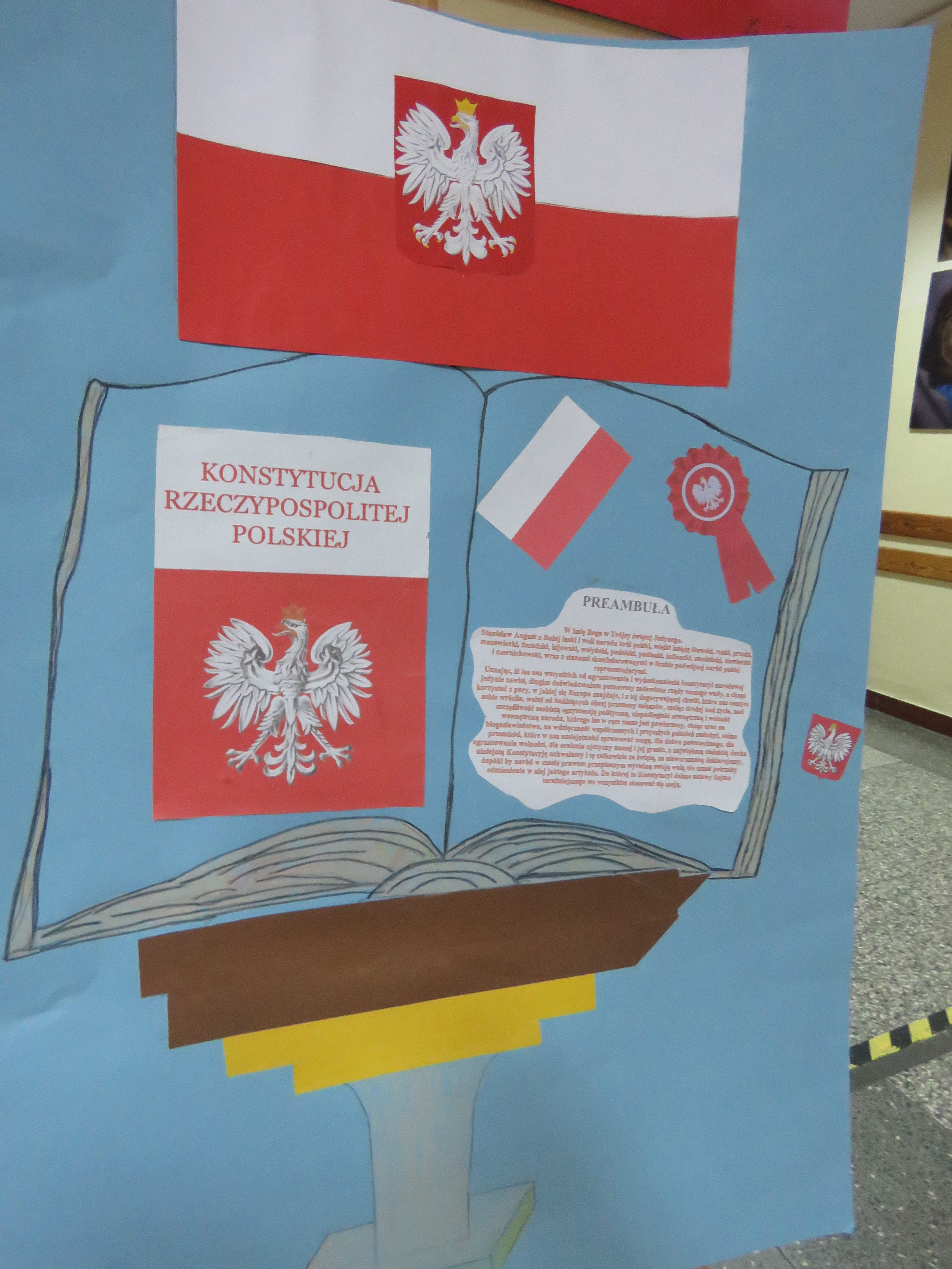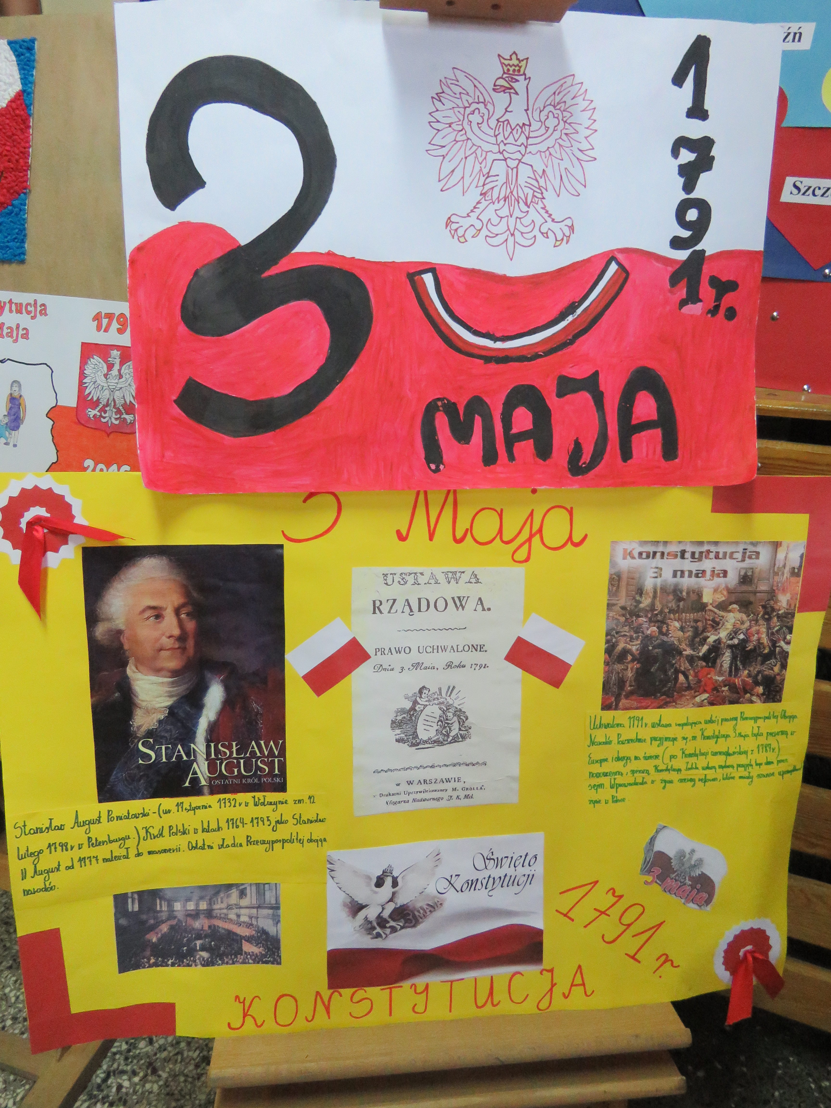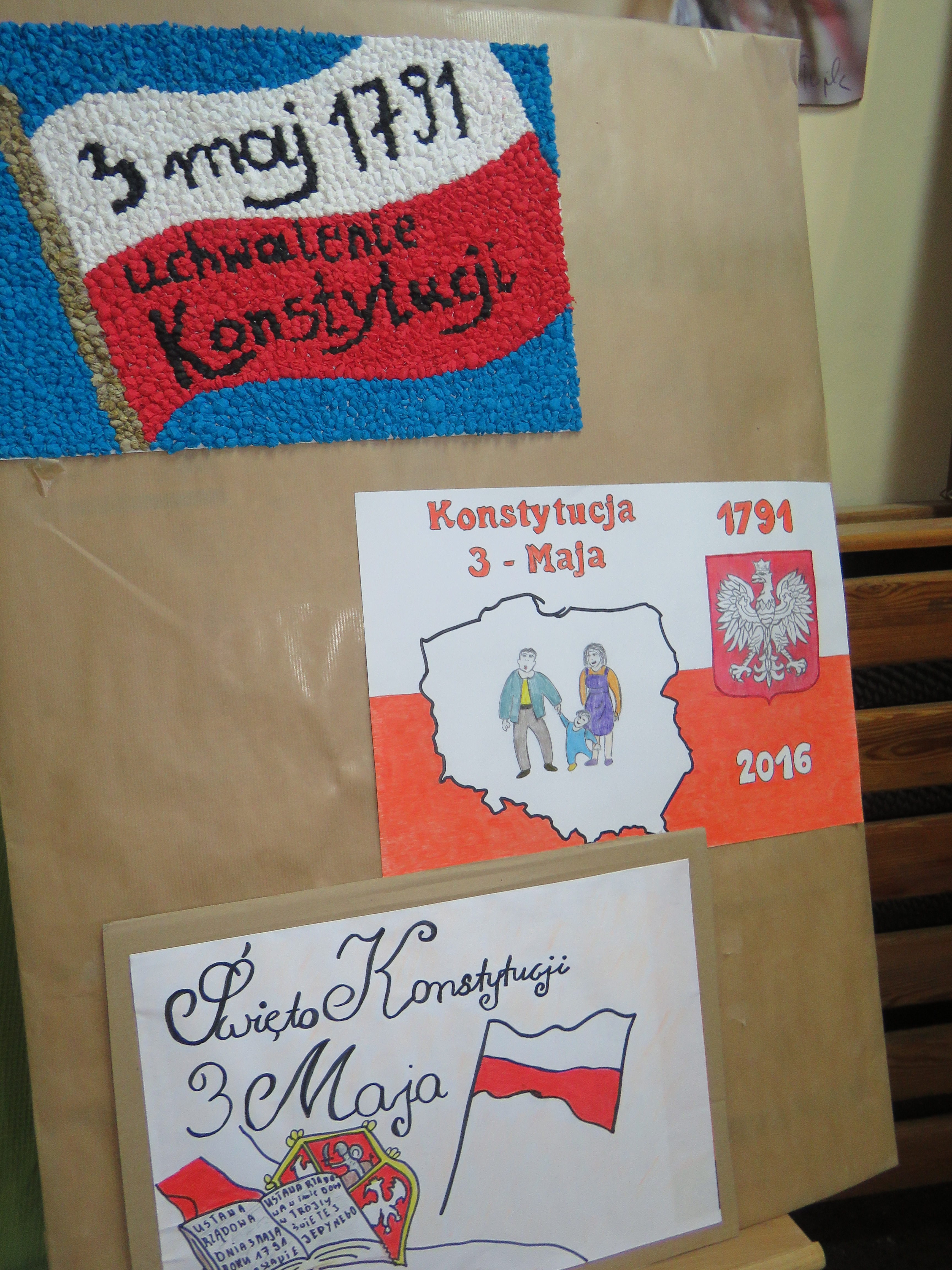 Te ważne wydarzenia stały się dla naszej szkoły okazją do szczególnego spotkania, które przygotowali uczniowie Pani Celiny Kraszewskiej. Na lekcji religii w klasie 2b najmłodsze dzieci miały okazje poznać historię powstania pierwszej Konstytucji. – To bardzo piękne święto, jakby urodziny Konstytucji. Na urodzinach trzeba się cieszyć i świętować, trzeba kochać Polskę – wyznaje Hania. Jasiu dodał – … Konstytucja to jest ważny dokument, który pomaga ludziom lepiej żyć. Mój dziadek ma Konstytucję.