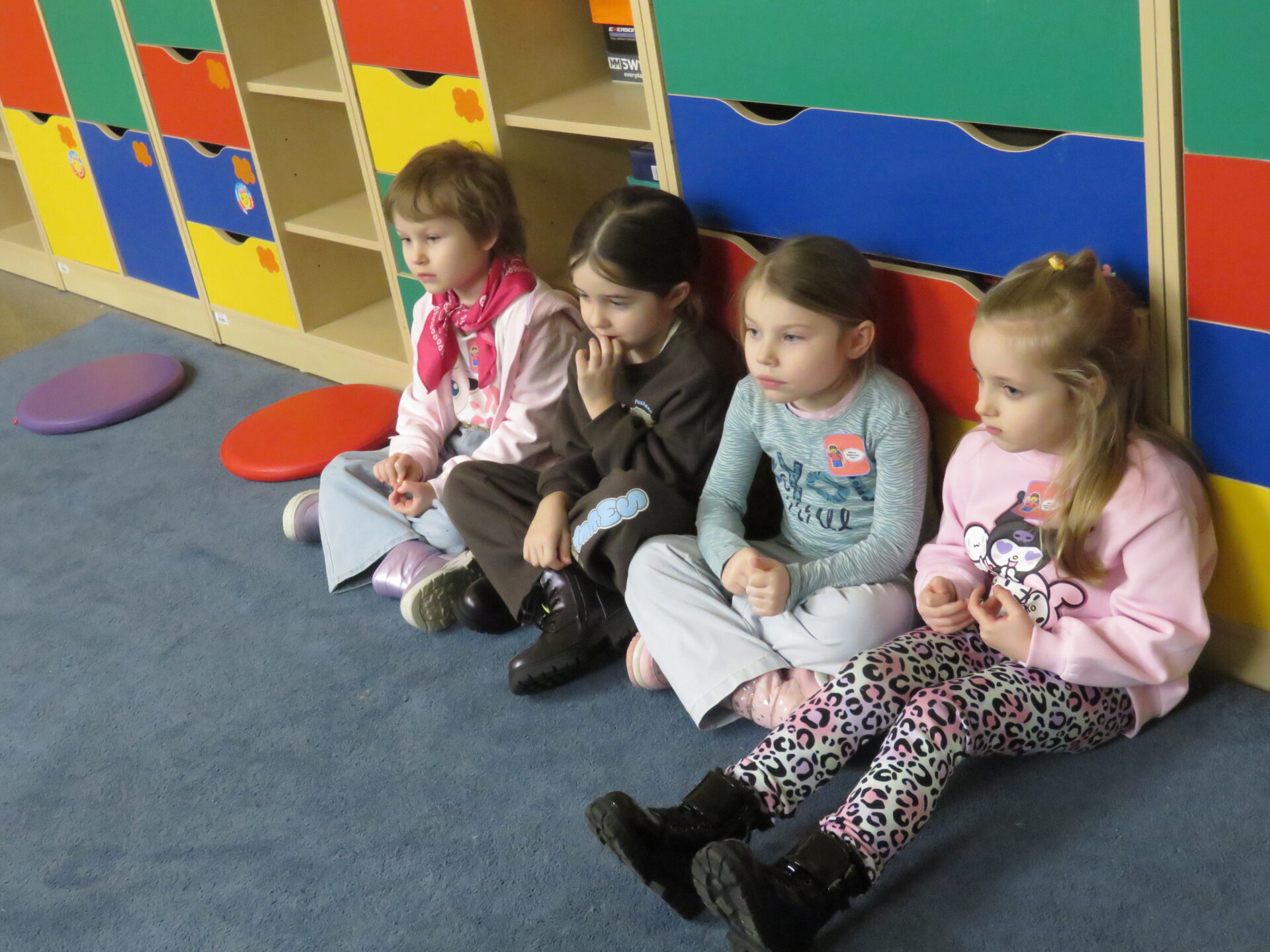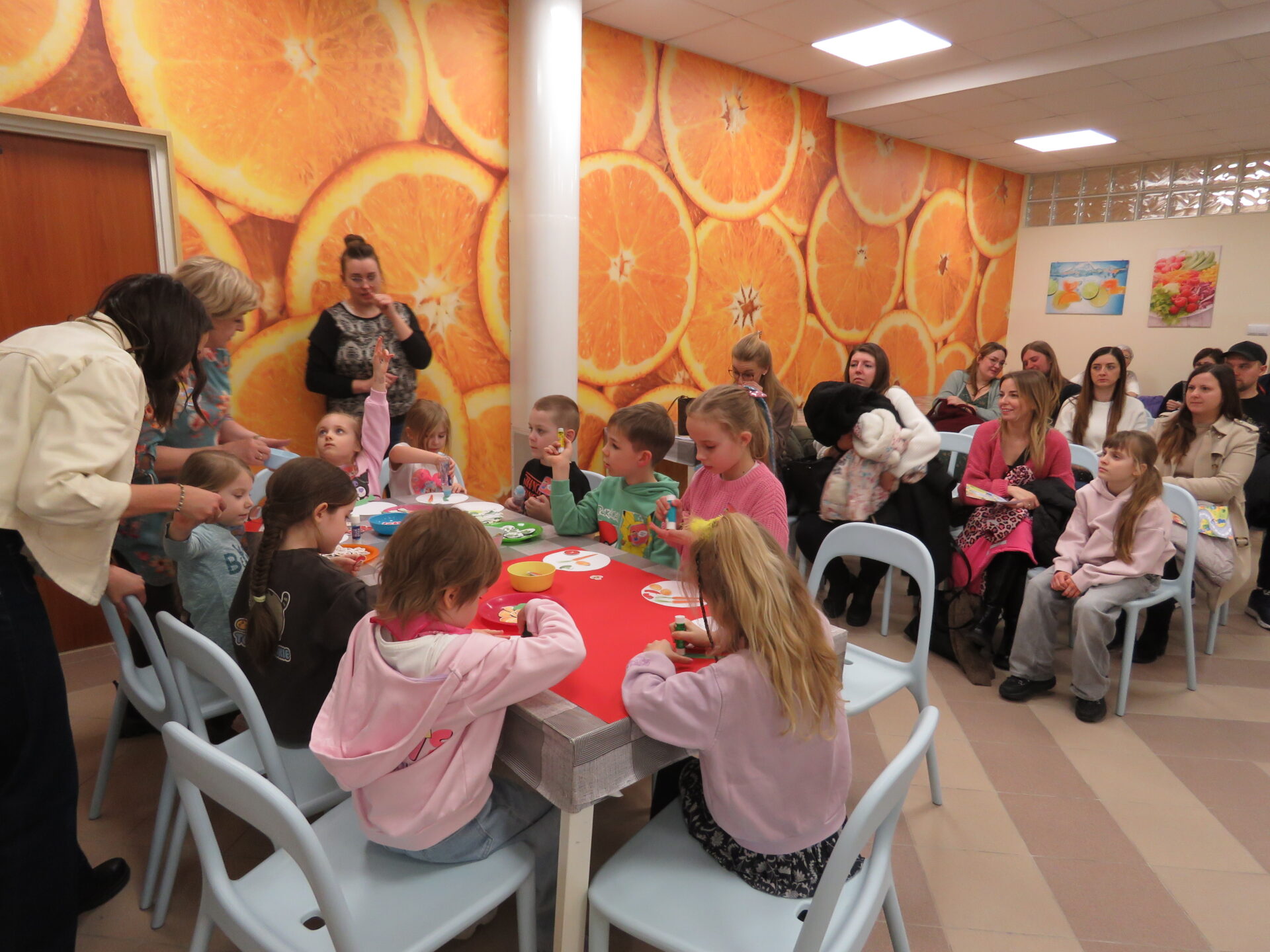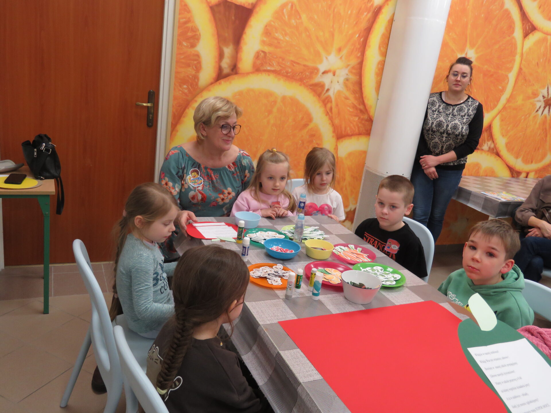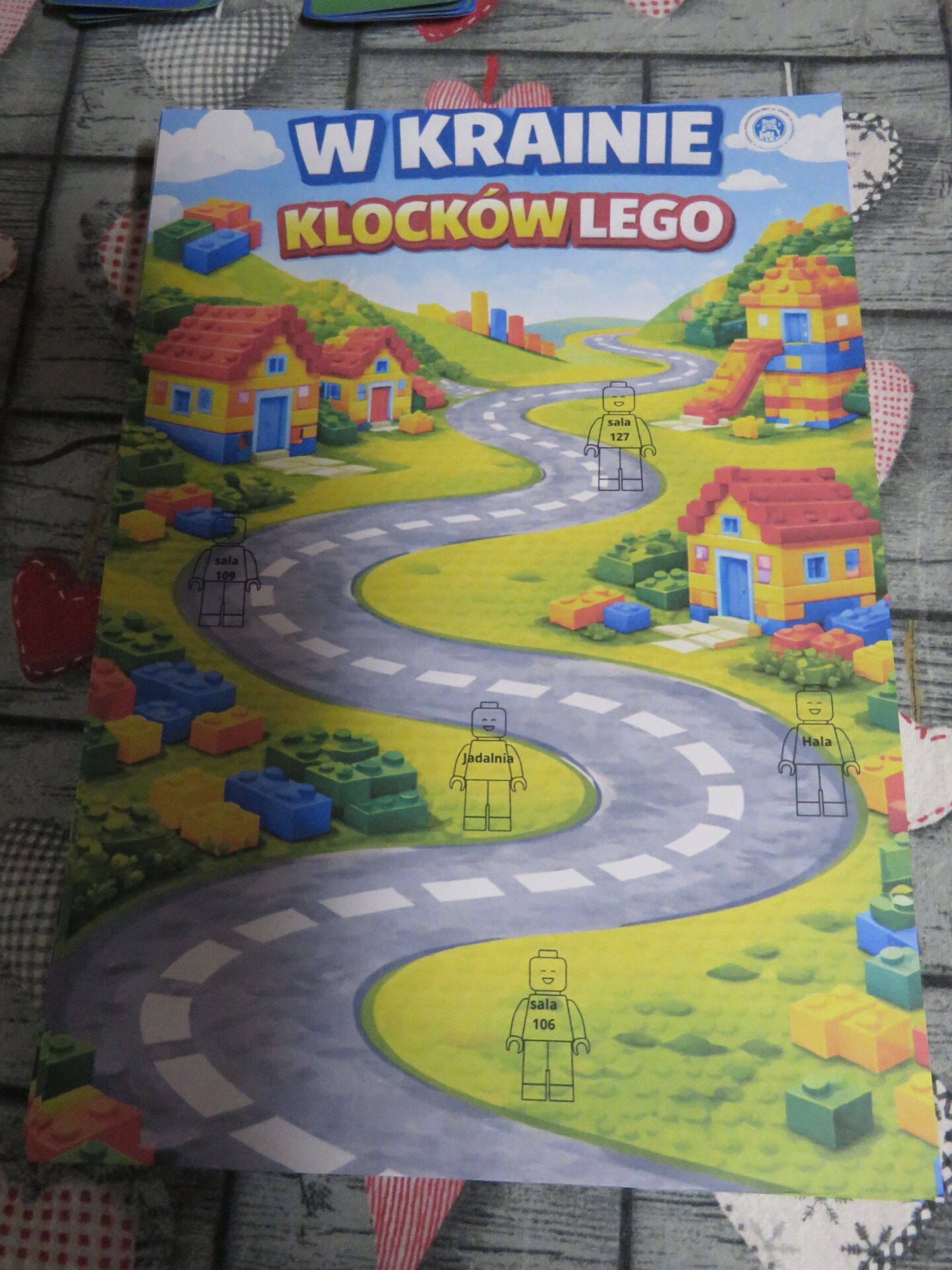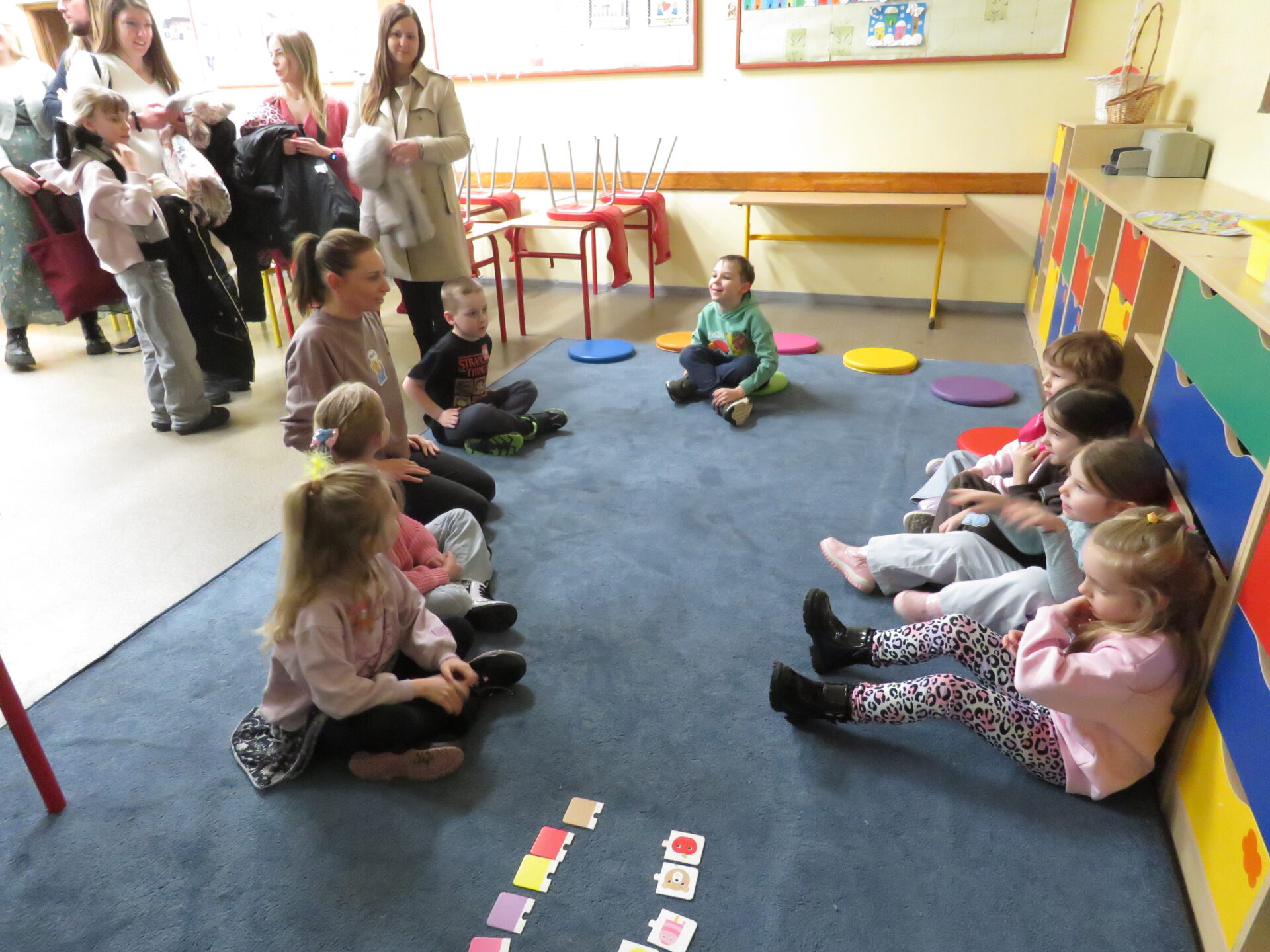 Panie rozdawały dzieciom kolorowe karty – mapy, na których zaznaczone było pięć wyjątkowych zakątków. Kolory oznaczały drużyny, które utworzyły przybyłe dzieci. Każda drużyna miała swojego przewodnika – Panie: Beatę Nagrodzką, Agnieszkę Polak, Patrycję Biegańską- Stawicką, Anitę Nowicką, Agnieszkę Nowicką. Dzieci i rodzice zebrali się w auli. Dyrektor szkoły przywitała zgromadzonych gości i krótko opowiedziała o placówce. Spotkanie poprowadzili uczniowie z Samorządu Uczniowskiego: Oskar Gdaniec, Amelia Rugała i Lena Kuleta.