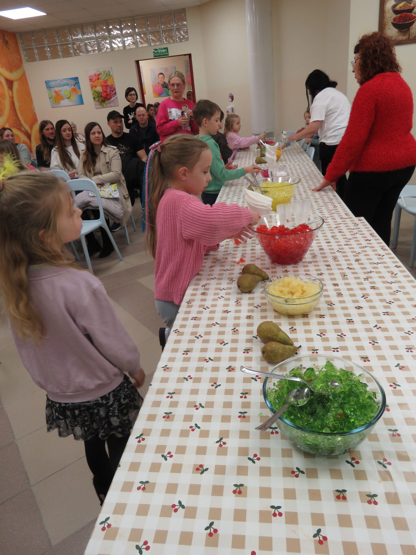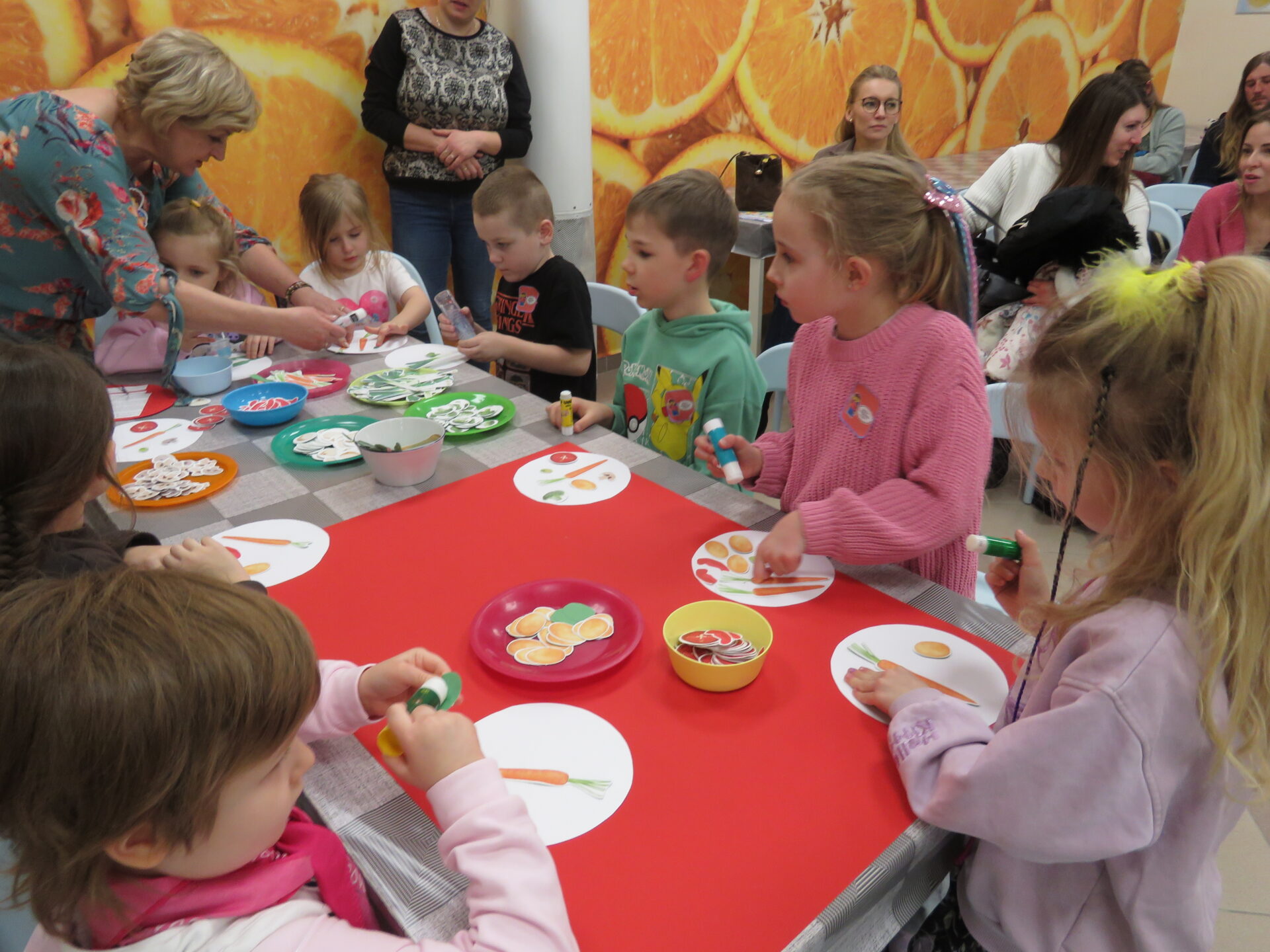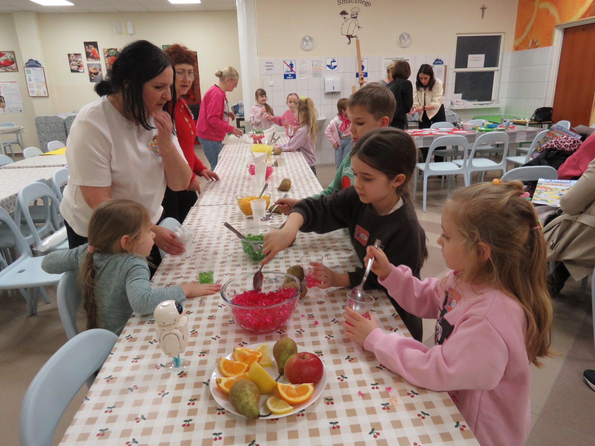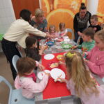 „Lego Master Chef- Wiem, że zdrowo jem”- w tym zakątku dzieci i rodziców przywitały Panie: Bożen Kalinowska- Sawicka i Pani Monika Kacperska. Dzieci poznały nazwy warzyw oraz ich prozdrowotne wartości. Dowiedziały się jakie witaminy zawierają między innymi: marchewka, por, brokuł, seler, ziemniaki. Dzieci jak zaczarowane słuchały o zaletach warzyw. Uczestnicy spotkania chętnie opowiadali o swoich ulubionych warzywnych przysmakach. Po krótkiej dyskusji dzieci wykonały prace plastyczną „Talerzyki zdrowia”. Każdy ułożył na talerzyku swoje ulubione warzywa. Na zakończenie dzieci samodzielnie przygotowywały zdrowe desery ze świeżych owoców i owocowych galaretek. Wsparciem dla dzieci przy doborze zdrowych przekąsek były Panie: Dorota Cybulska, Justyna Kujawa, Jolanta Kowalczyk – Okrucińska