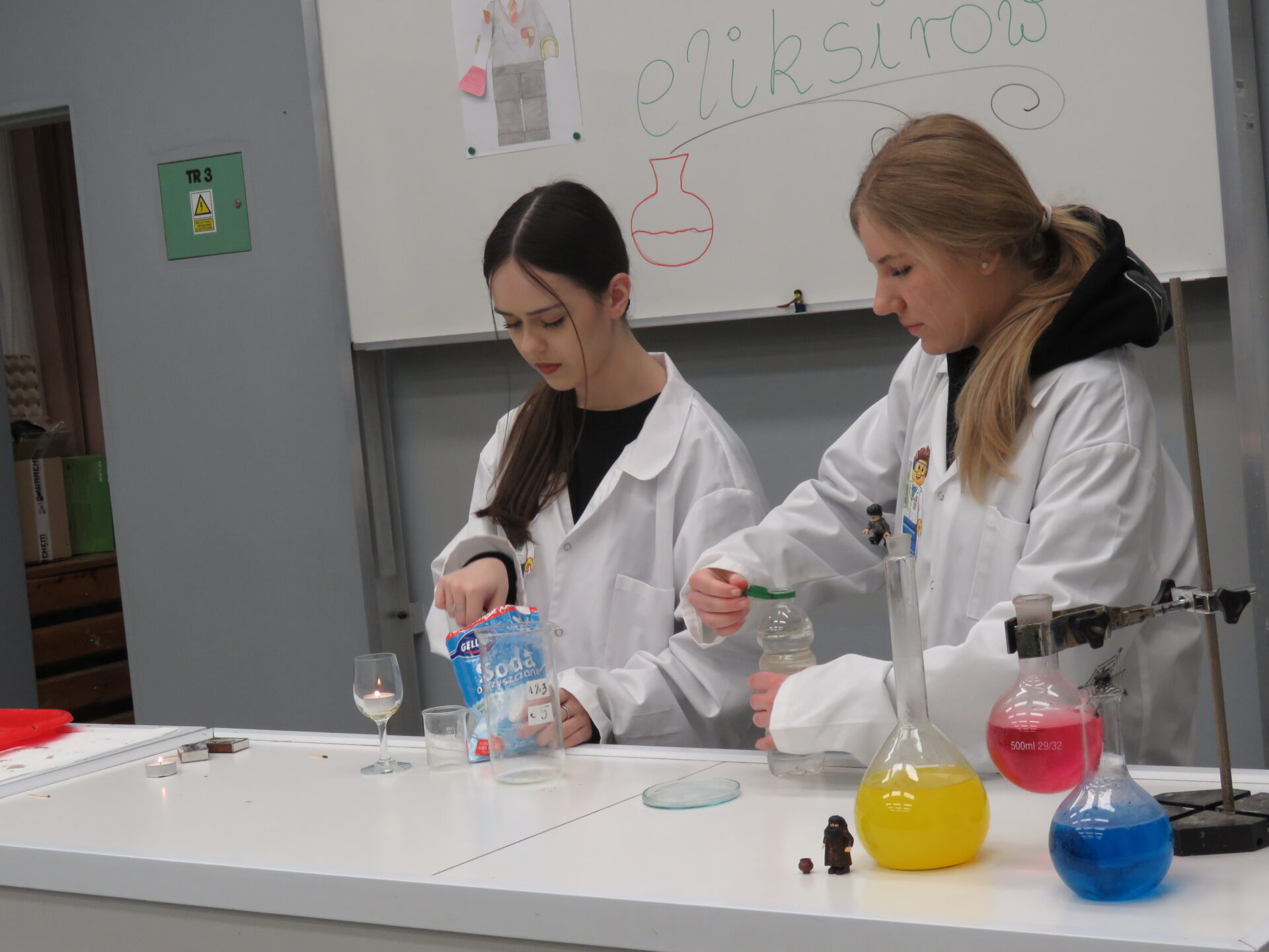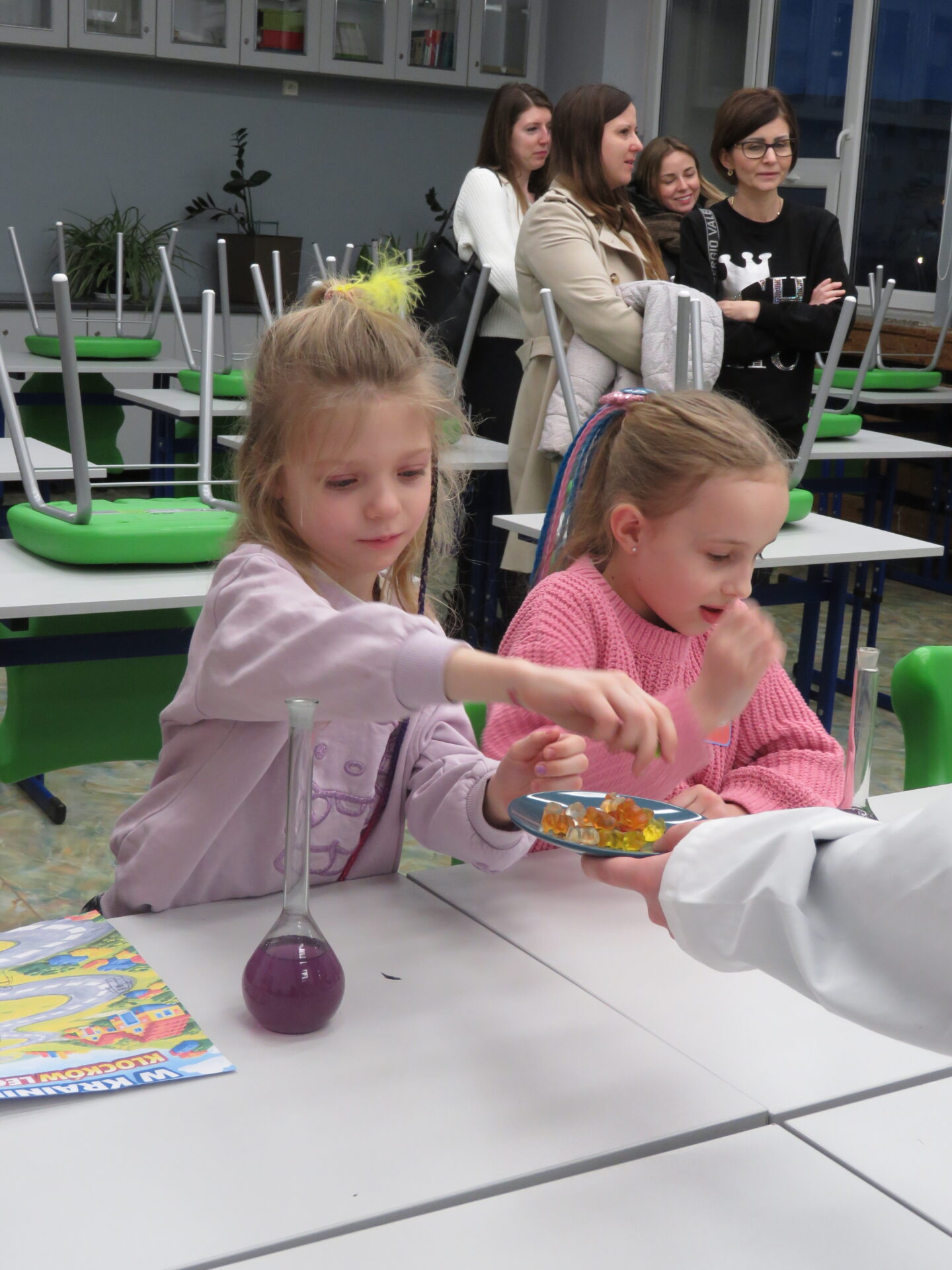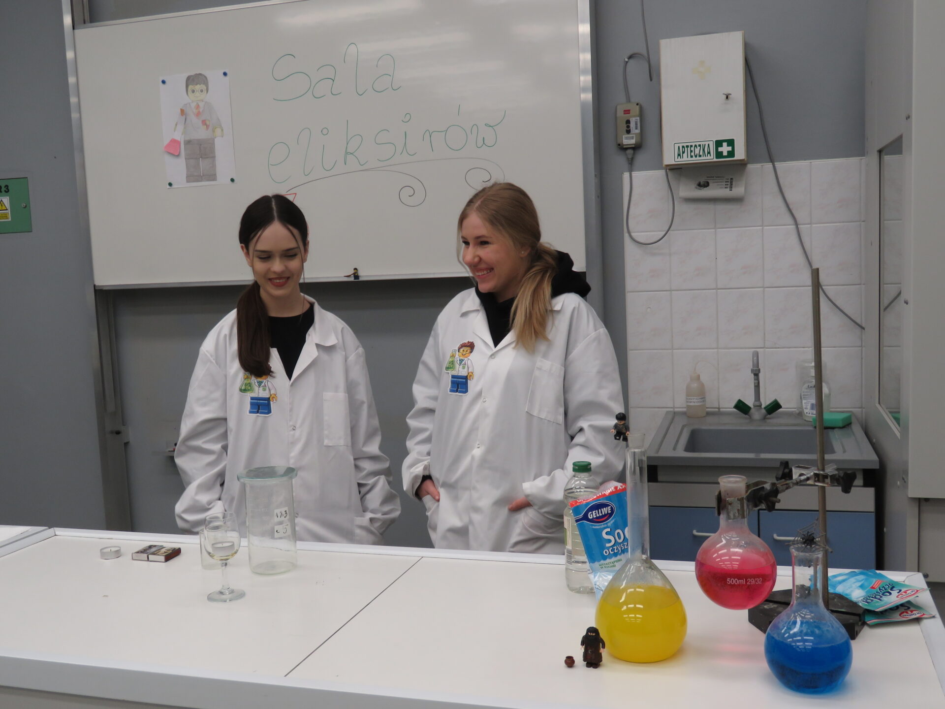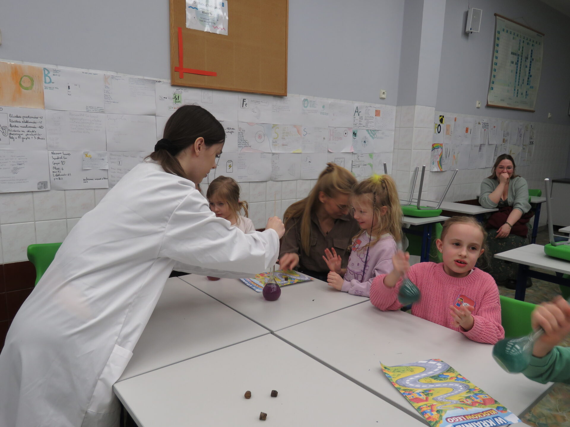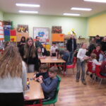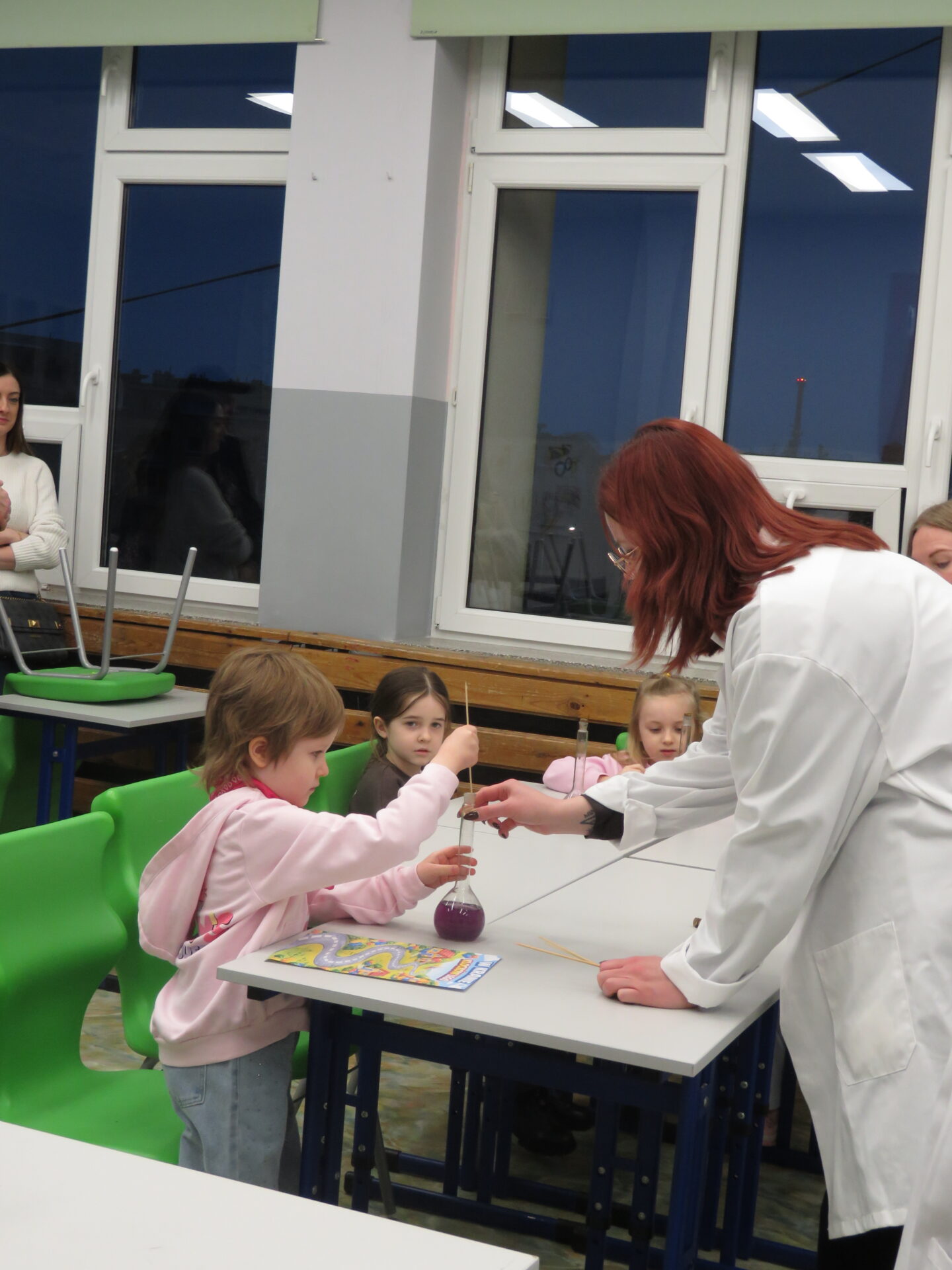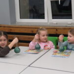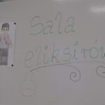 „ Lego czary- sala eliksirów” – uczennice z klasy 8d Julia Skalińska i Natalia Rudzka pod kierunkiem Pani Jolanty Przybyszewskiej i Pani Weroniki Sowińskiej oczarowały przybyłe dzieci niesamowitymi doświadczeniami. Podczas spotkania dzieci zobaczyły doświadczenia: gaszenie świeczki przy użyciu niewidzialnego gazu, produkowanie mgły. Zadaniem dzieci było wykonanie jednego doświadczenia, a mianowicie zamiana koloru płynu w kolbie. Za pomocą żelków dzieciom udało się zmienić kolor z fioletowego na niebieski, czy zielony. Niektórym małym naukowcom udało się uzyskać kolor żółty i pomarańczowy.
