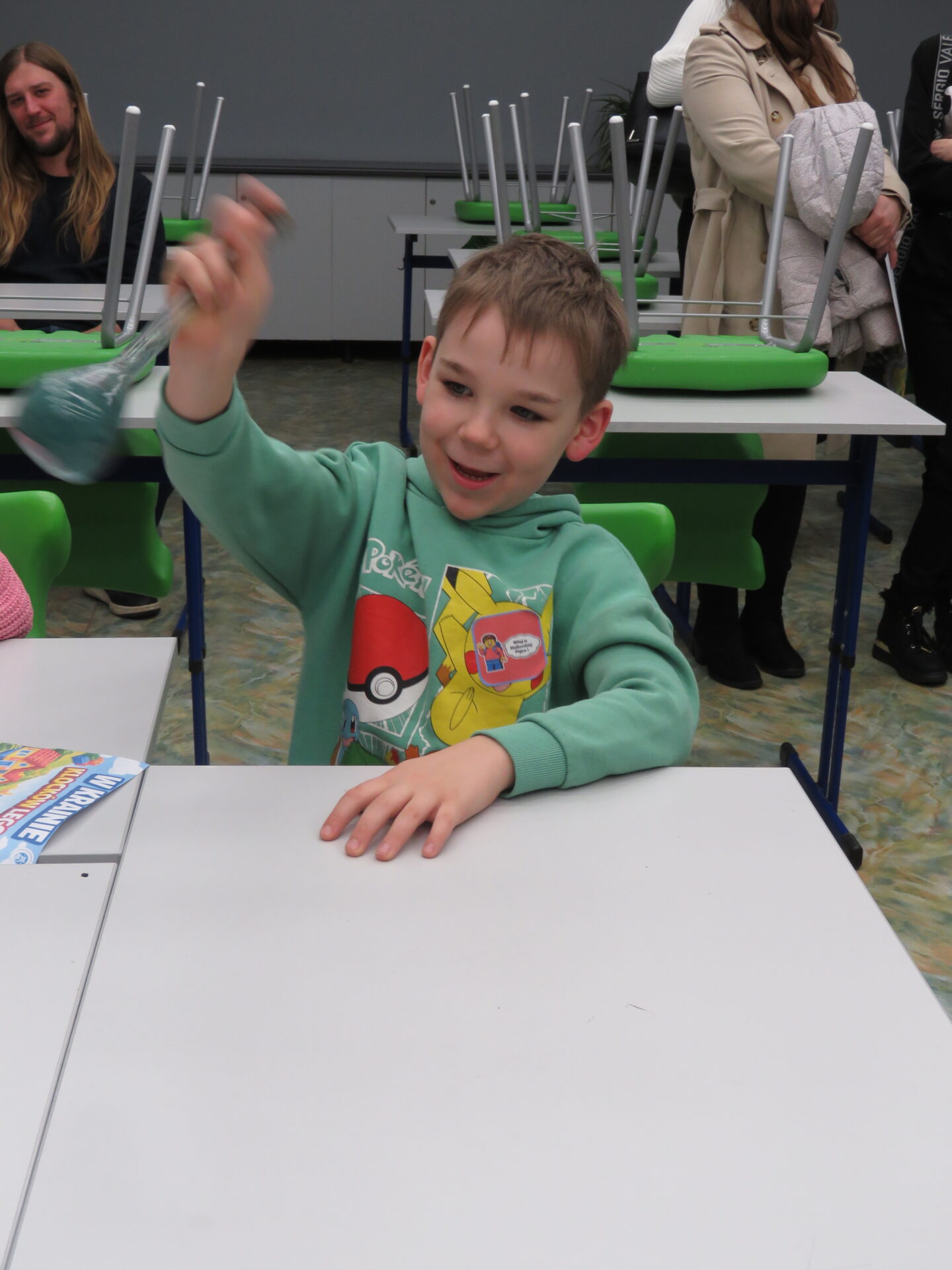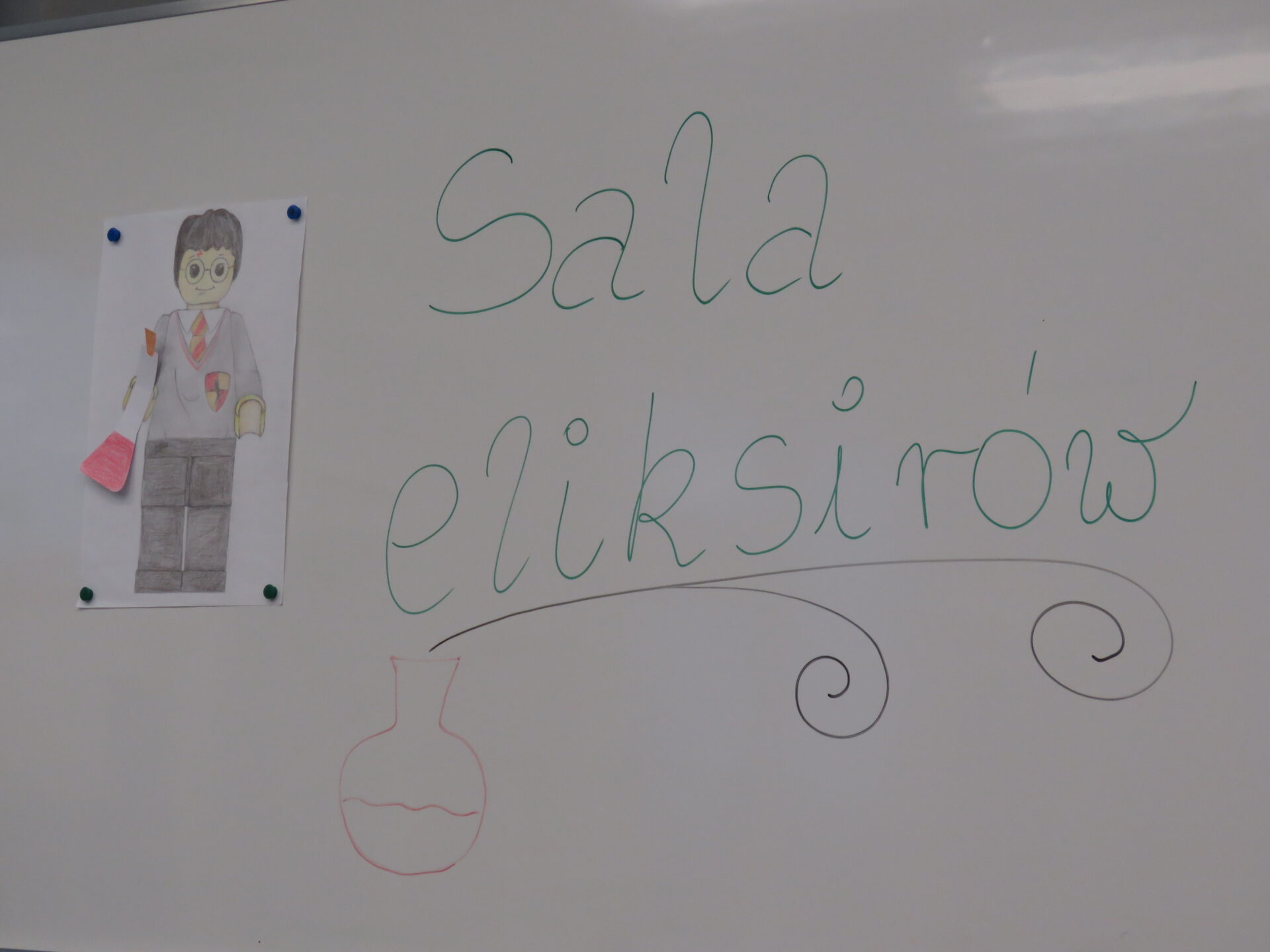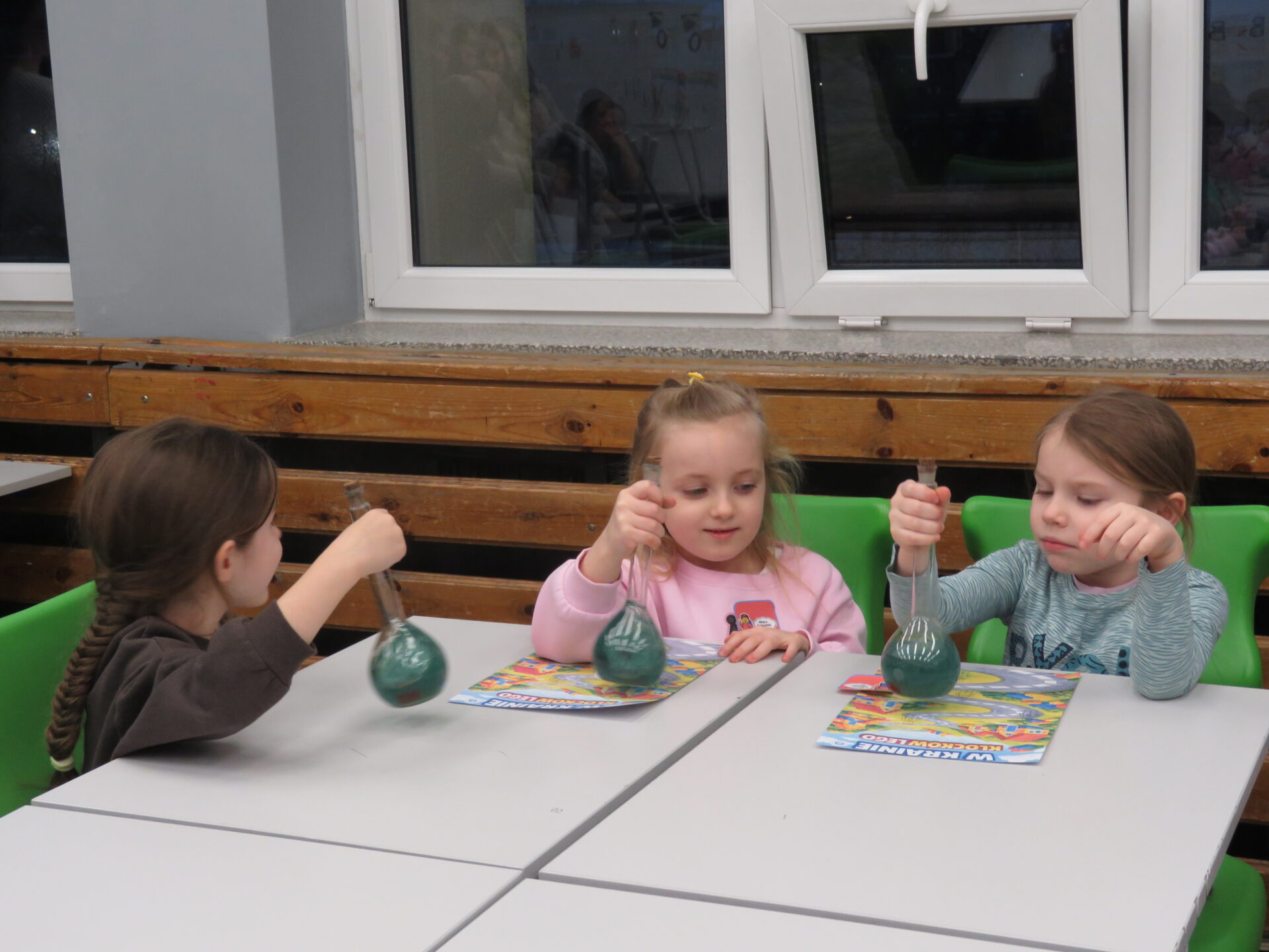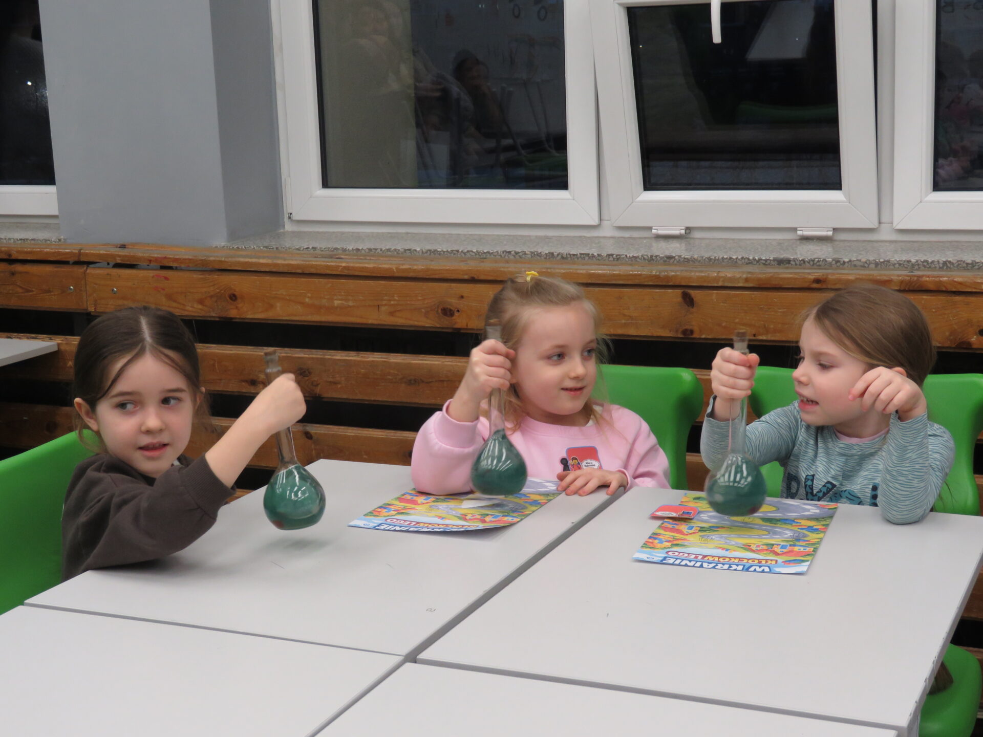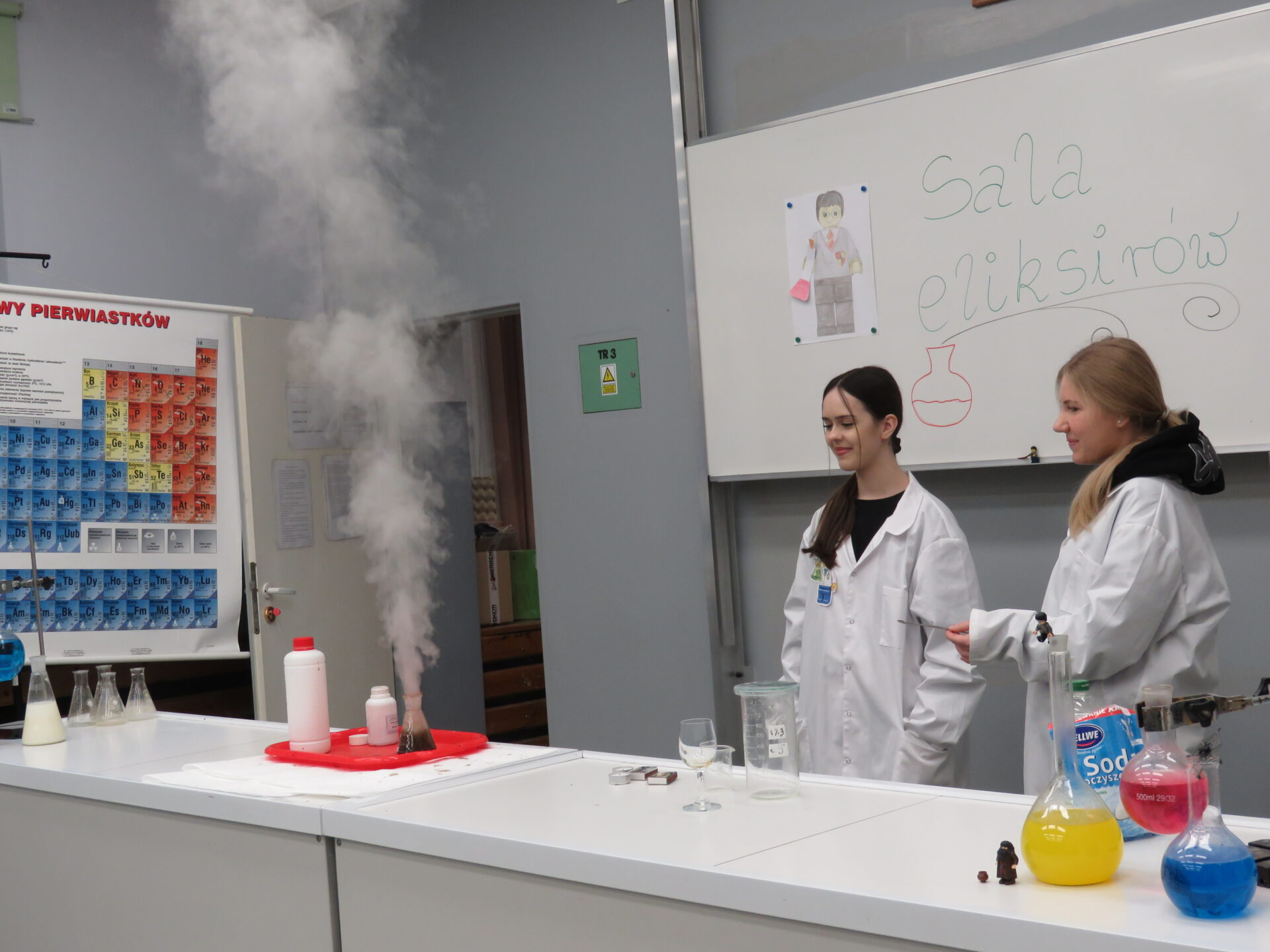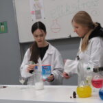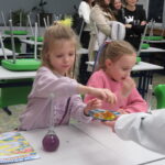 „ Lego czary- sala eliksirów” – uczennice z klasy 8d Julia Skalińska i Natalia Rudzka pod kierunkiem Pani Jolanty Przybyszewskiej i Pani Weroniki Sowińskiej oczarowały przybyłe dzieci niesamowitymi doświadczeniami. Podczas spotkania dzieci zobaczyły doświadczenia: gaszenie świeczki przy użyciu niewidzialnego gazu, produkowanie mgły. Zadaniem dzieci było wykonanie jednego doświadczenia, a mianowicie zamiana koloru płynu w kolbie. Za pomocą żelków dzieciom udało się zmienić kolor z fioletowego na niebieski, czy zielony. Niektórym małym naukowcom udało się uzyskać kolor żółty i pomarańczowy.