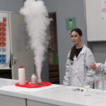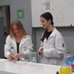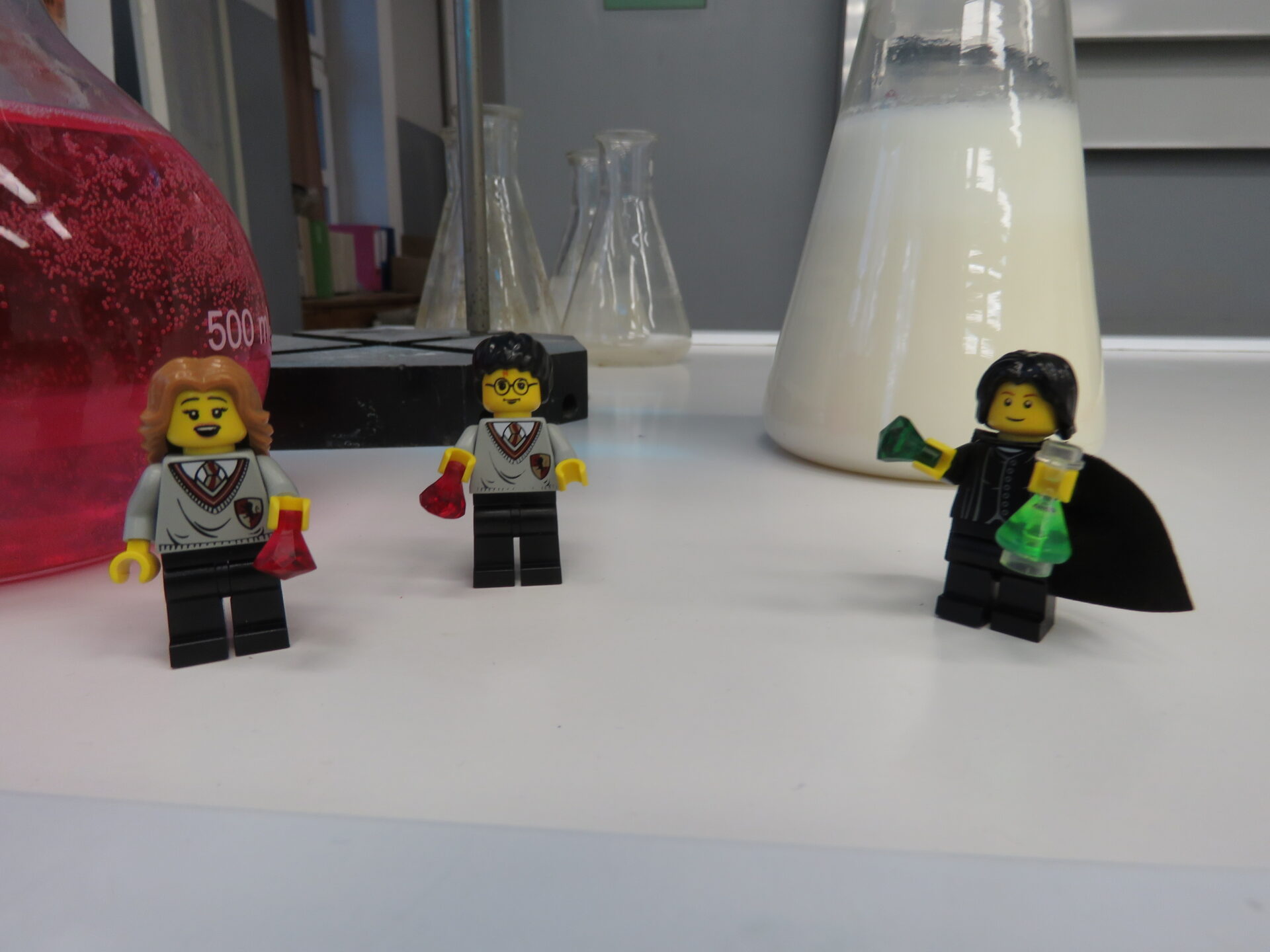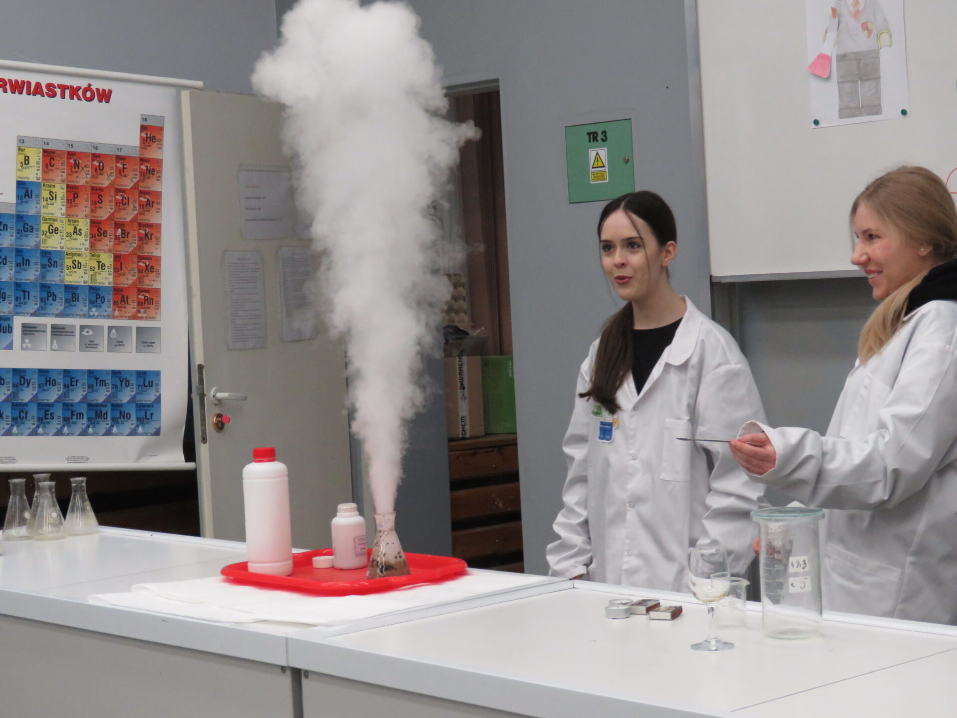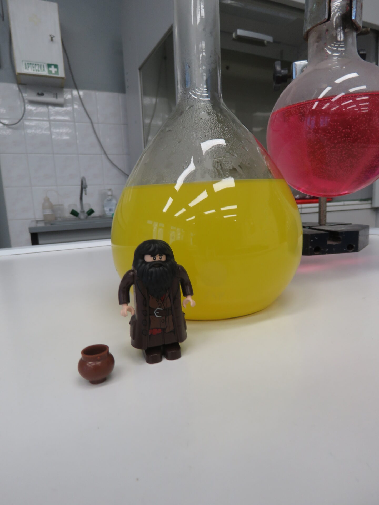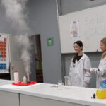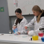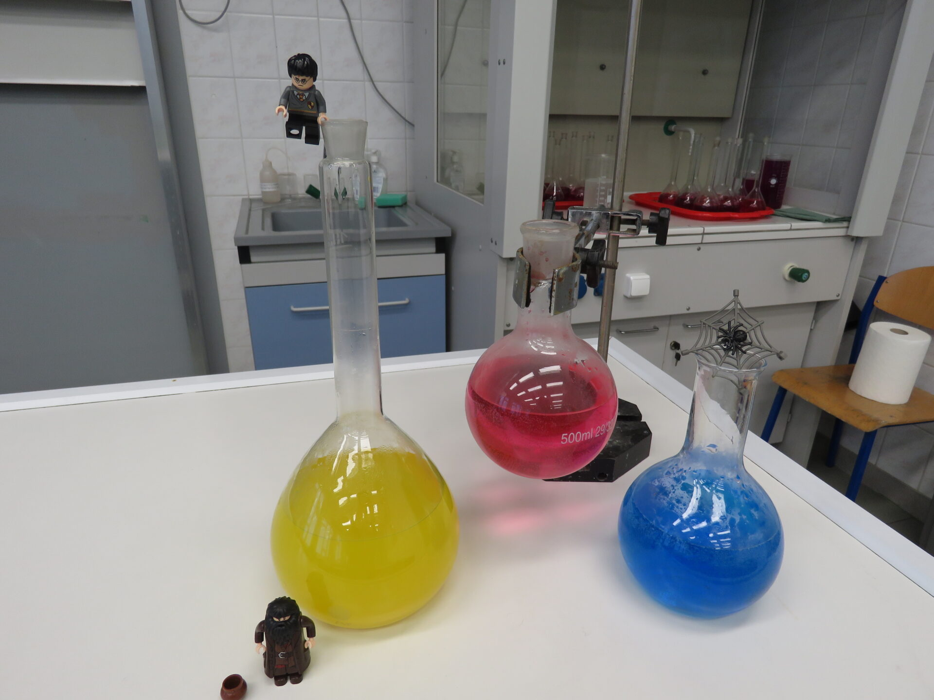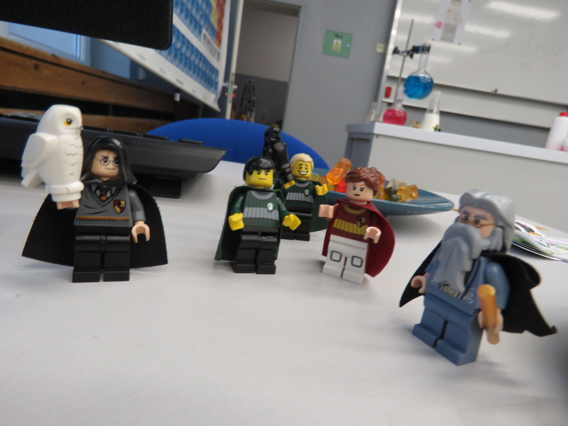 „ Lego czary- sala eliksirów” – uczennice z klasy 8d Julia Skalińska i Natalia Rudzka pod kierunkiem Pani Jolanty Przybyszewskiej i Pani Weroniki Sowińskiej oczarowały przybyłe dzieci niesamowitymi doświadczeniami. Podczas spotkania dzieci zobaczyły doświadczenia: gaszenie świeczki przy użyciu niewidzialnego gazu, produkowanie mgły. Zadaniem dzieci było wykonanie jednego doświadczenia, a mianowicie zamiana koloru płynu w kolbie. Za pomocą żelków dzieciom udało się zmienić kolor z fioletowego na niebieski, czy zielony. Niektórym małym naukowcom udało się uzyskać kolor żółty i pomarańczowy.