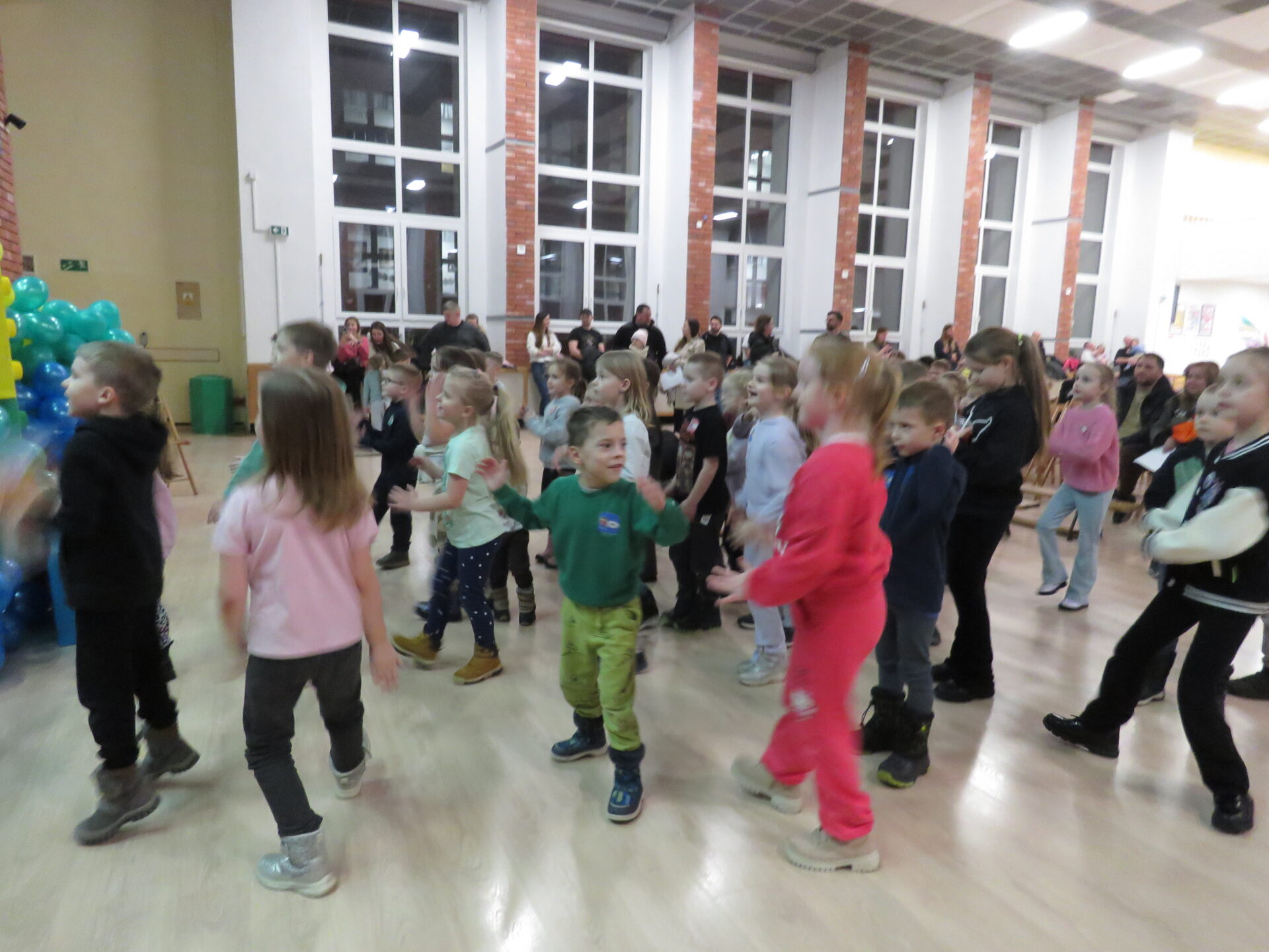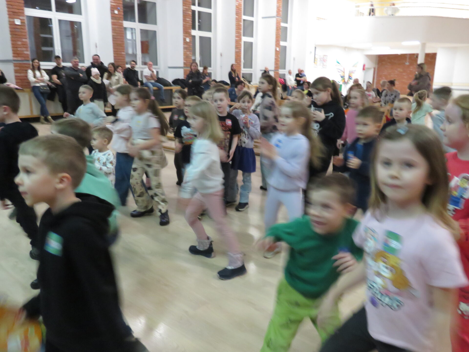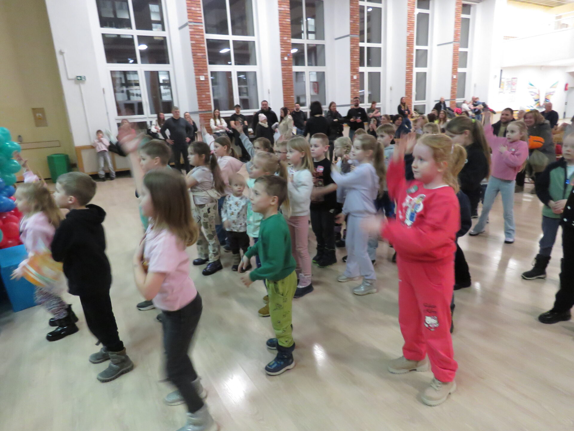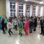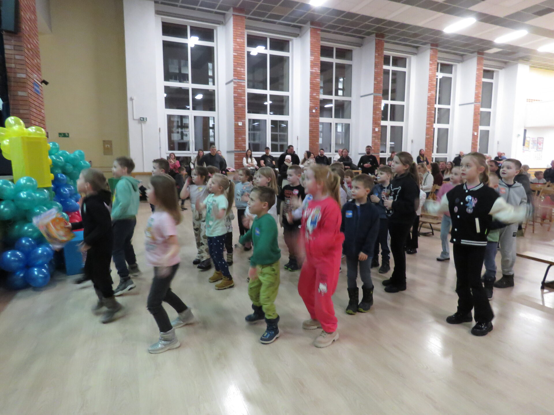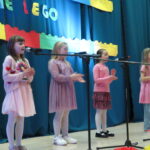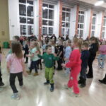Gdy wszystkie grupy odwiedziły wyjątkowe zakątki, dzieci i rodzice ponownie zebrali się w auli. Spotkanie wzbogacił występ wysportowanych dziewcząt – Julii Suchińskiej, Julii Kempczeńskiej, Julii Tytz, które wszystkich zaprosiły do tańca. Radość, błyszczące oczy oraz wypieki na twarzach dzieci świadczyły o kreatywnie i miło spędzonym popołudniu w Krainie Lego Piątaszka.
