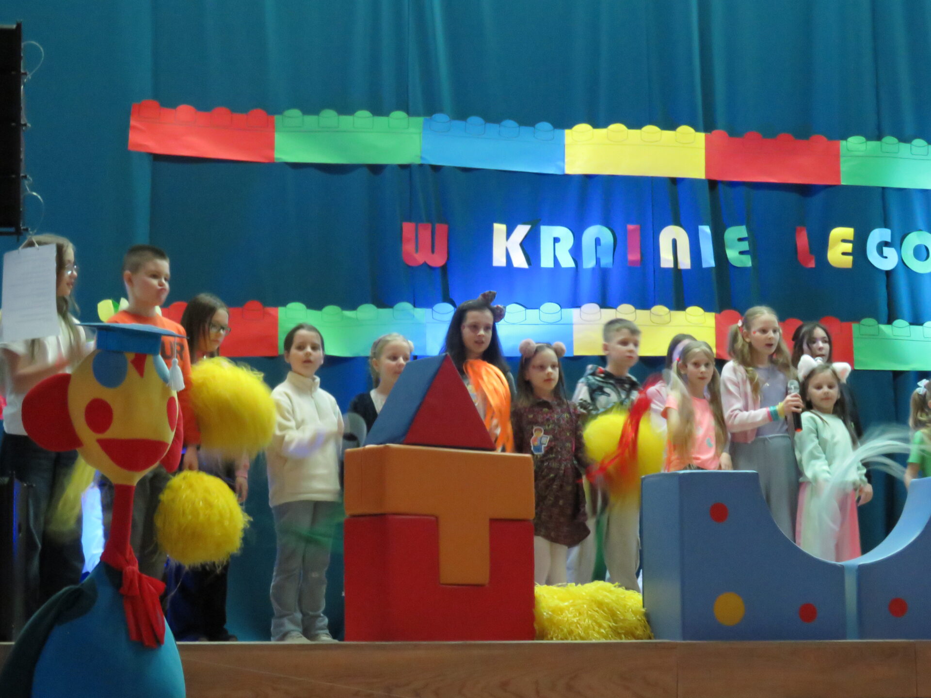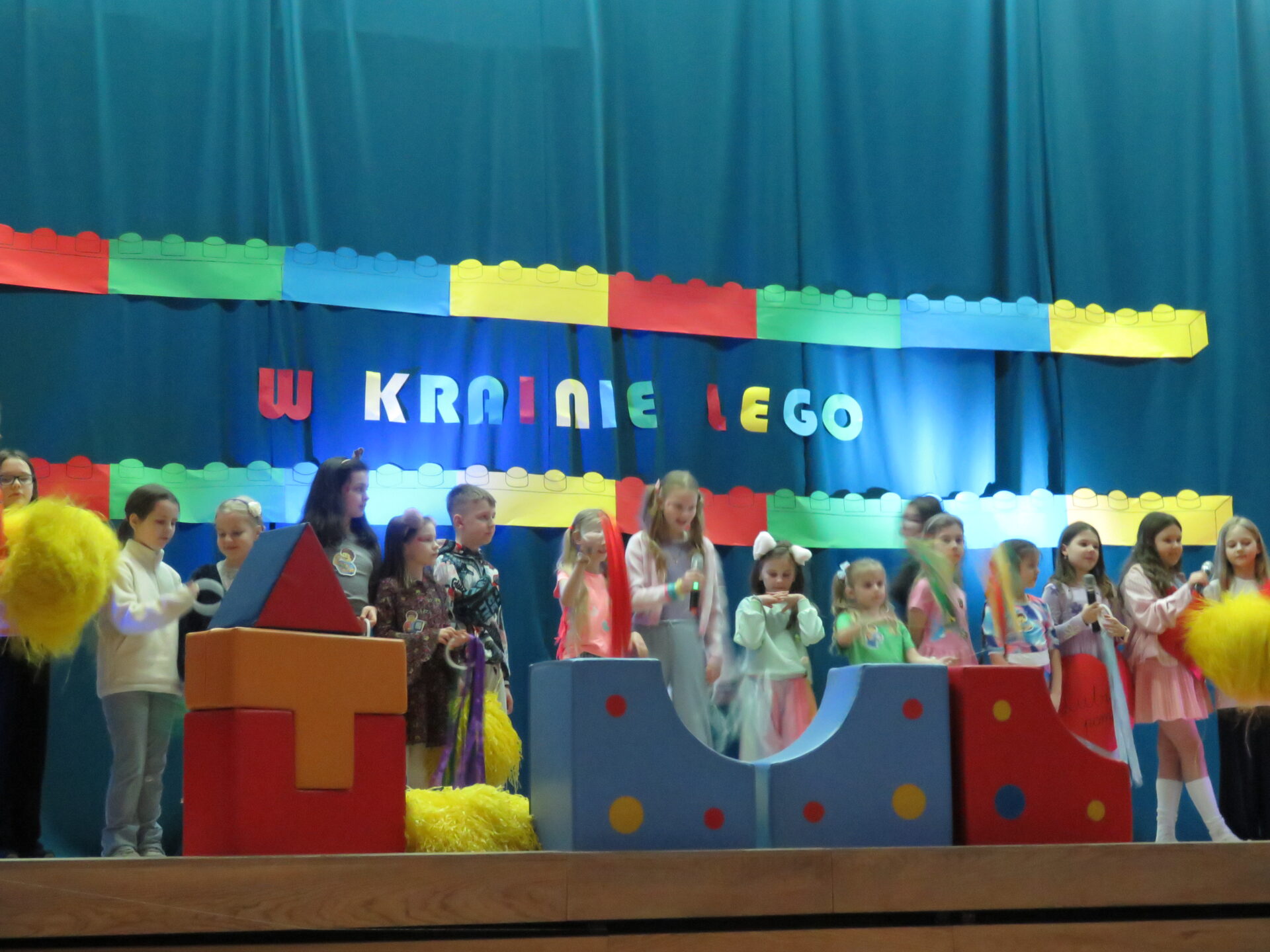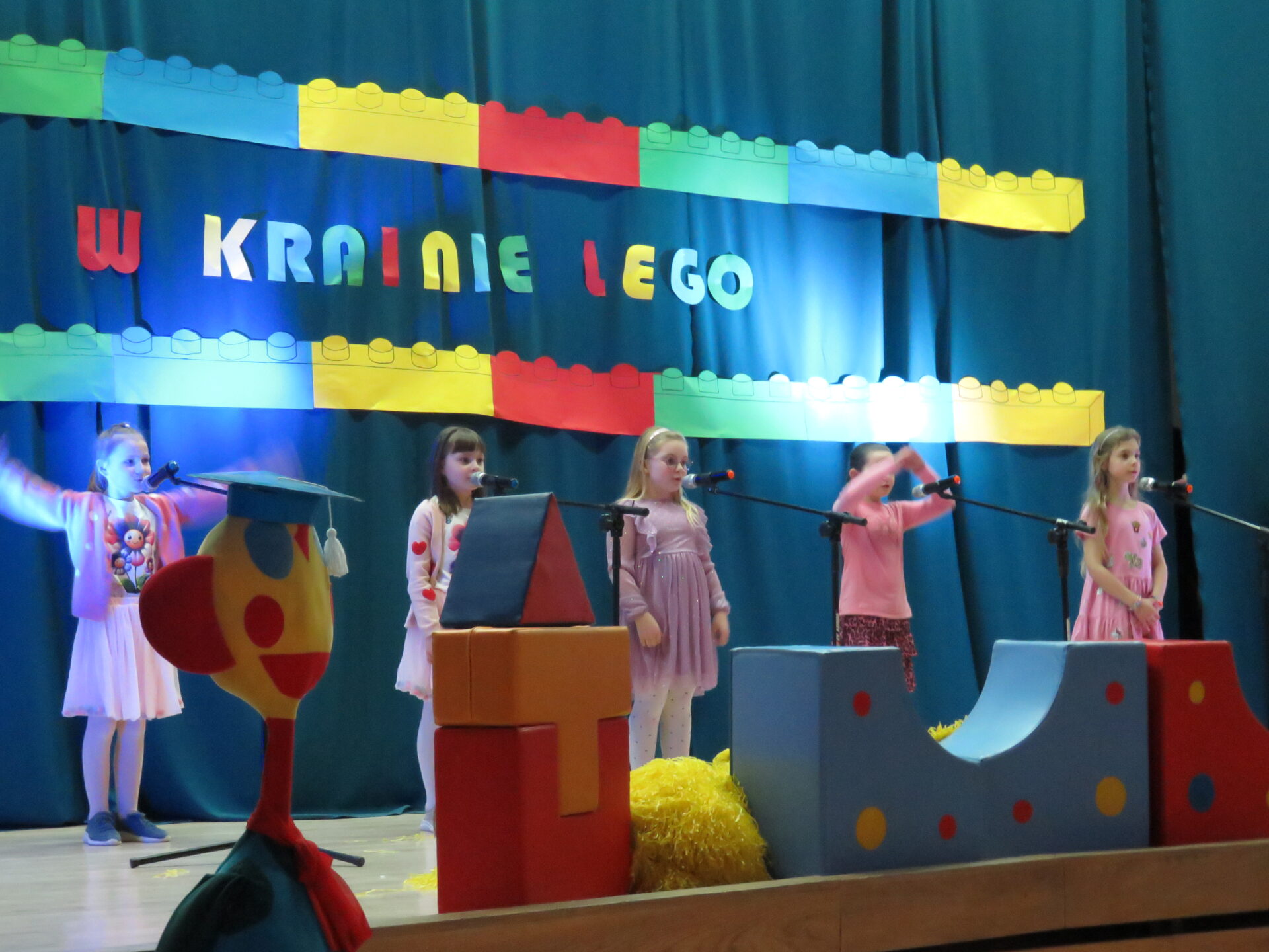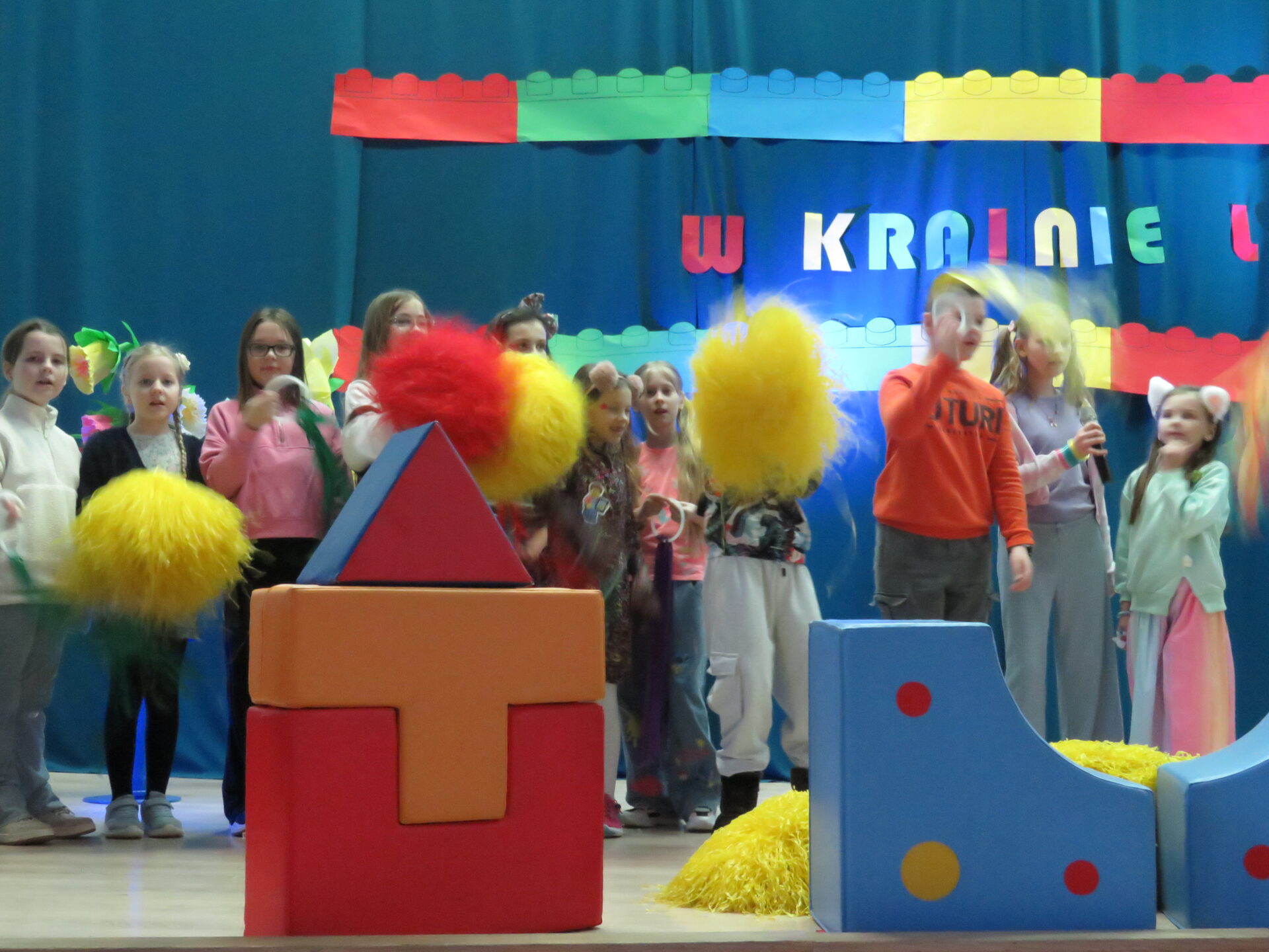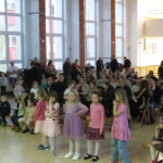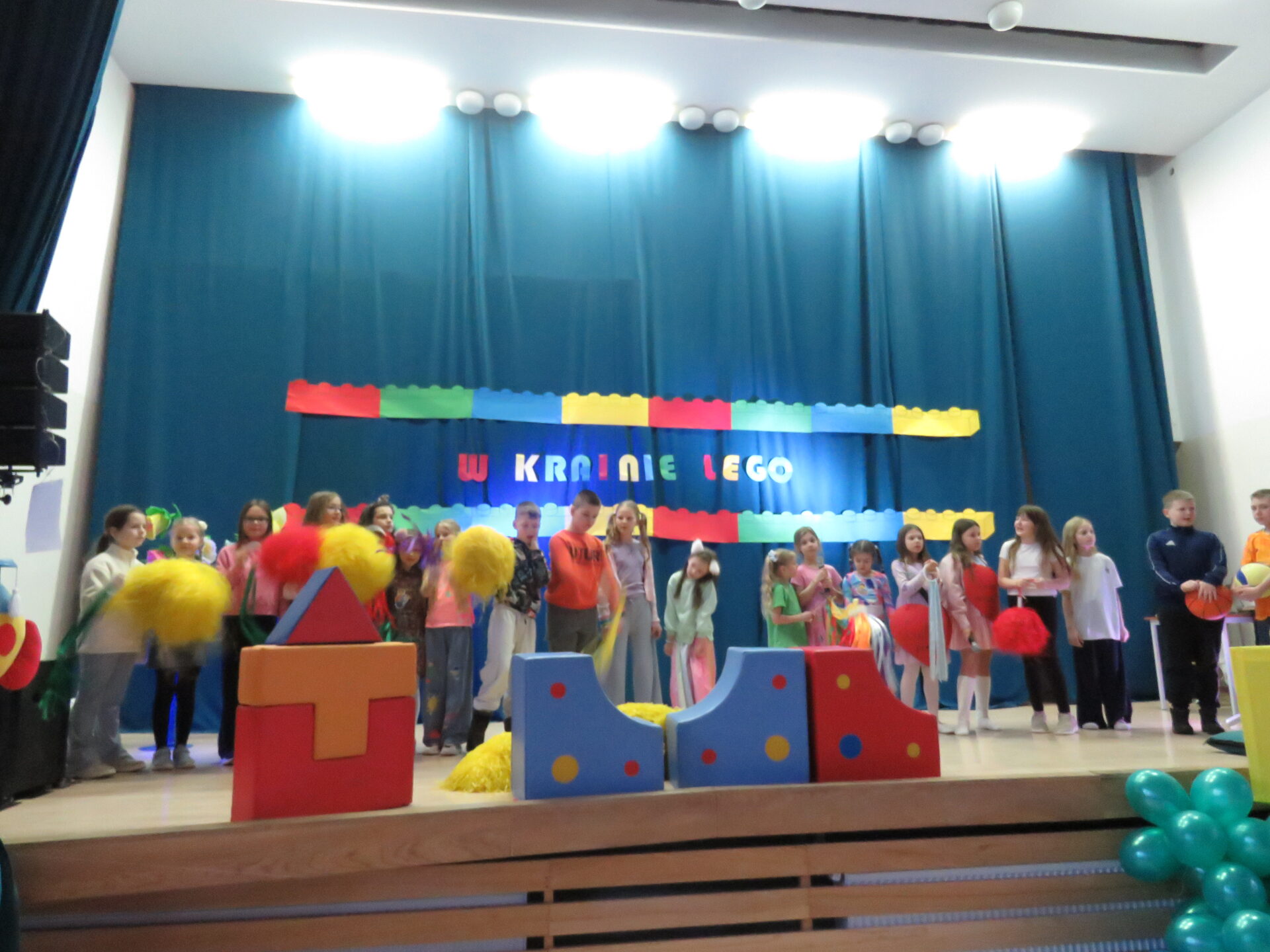 Gdy wszystkie grupy odwiedziły wyjątkowe zakątki, dzieci i rodzice ponownie zebrali się w auli. Spotkanie wzbogacił występ wysportowanych dziewcząt – Julii Suchińskiej, Julii Kempczeńskiej, Julii Tytz, które wszystkich zaprosiły do tańca. Radość, błyszczące oczy oraz wypieki na twarzach dzieci świadczyły o kreatywnie i miło spędzonym popołudniu w Krainie Lego Piątaszka.