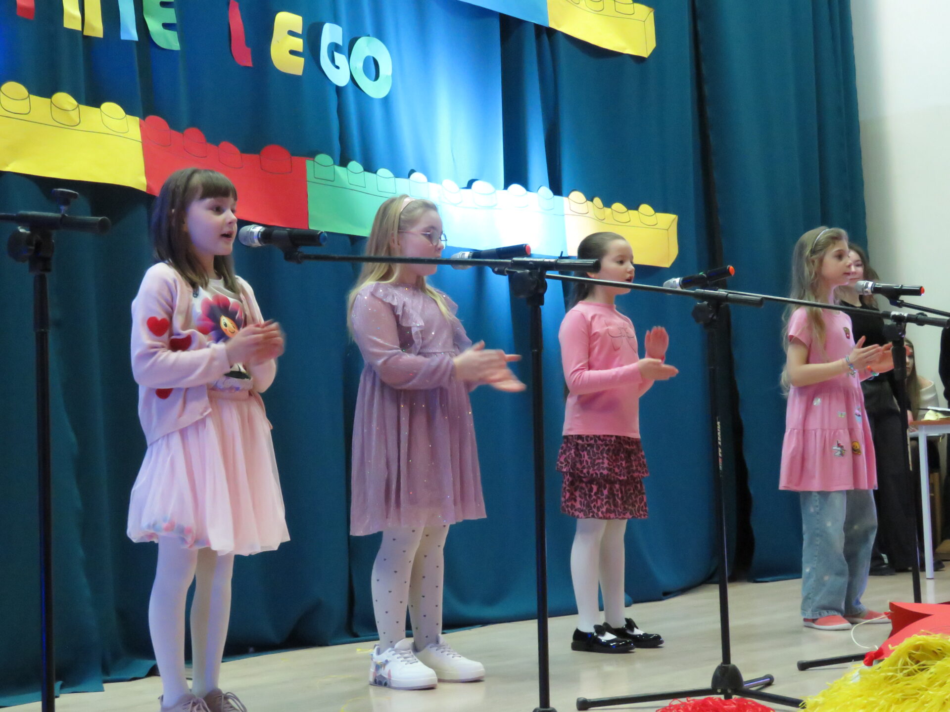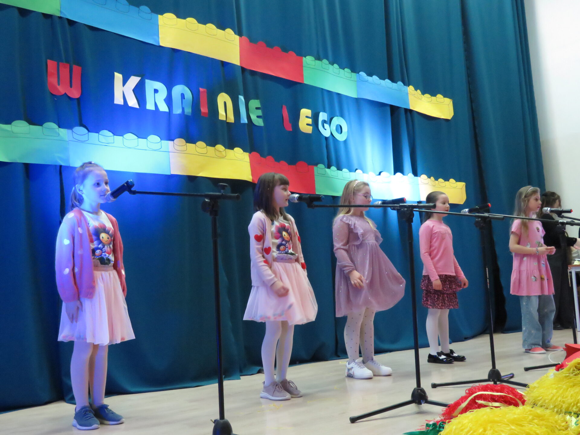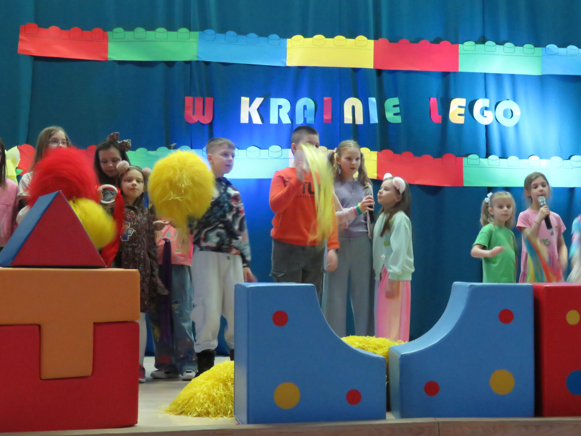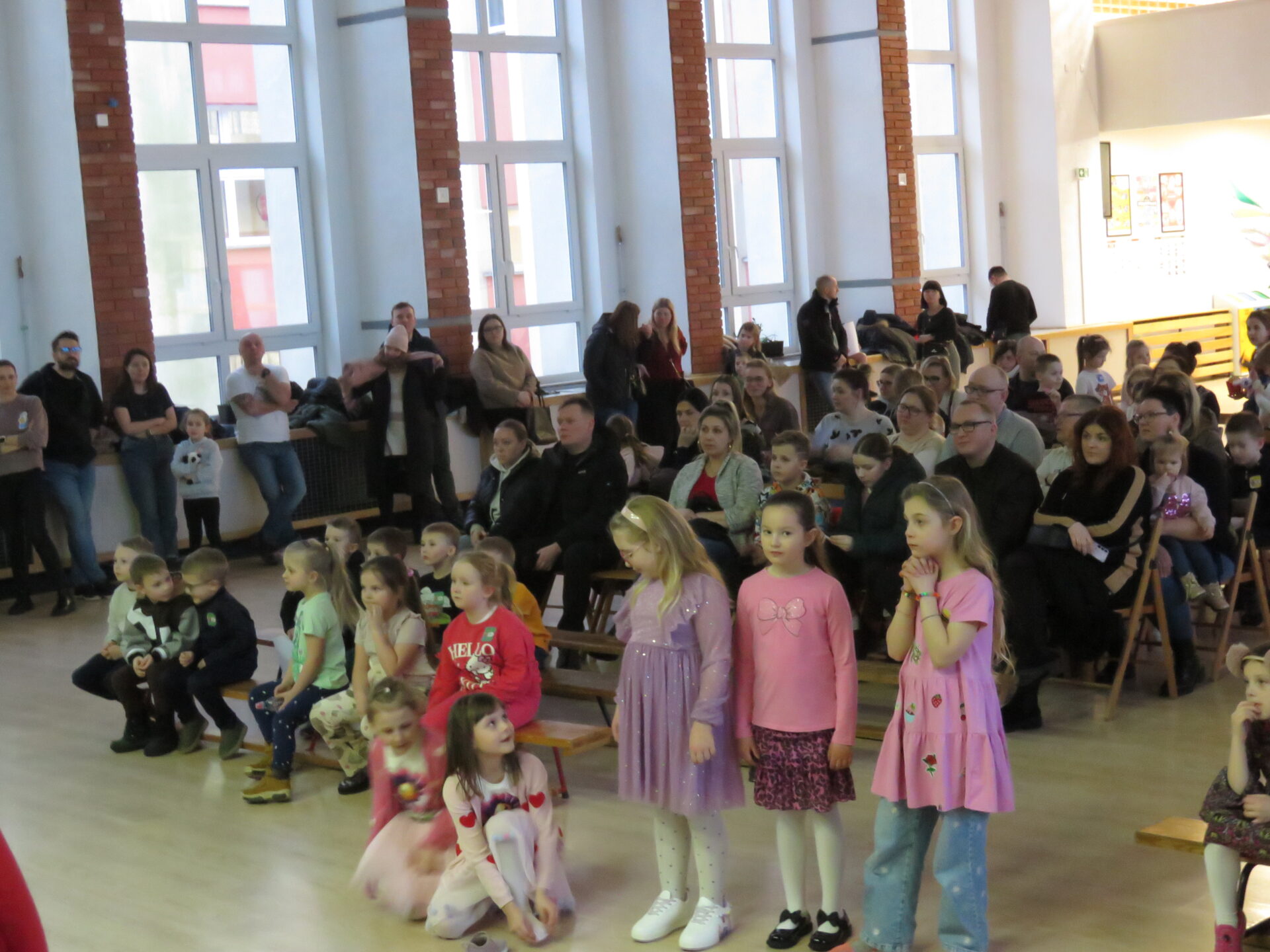 Gdy wszystkie grupy odwiedziły wyjątkowe zakątki, dzieci i rodzice ponownie zebrali się w auli. Spotkanie wzbogacił występ wysportowanych dziewcząt – Julii Suchińskiej, Julii Kempczeńskiej, Julii Tytz, które wszystkich zaprosiły do tańca. Radość, błyszczące oczy oraz wypieki na twarzach dzieci świadczyły o kreatywnie i miło spędzonym popołudniu w Krainie Lego Piątaszka.