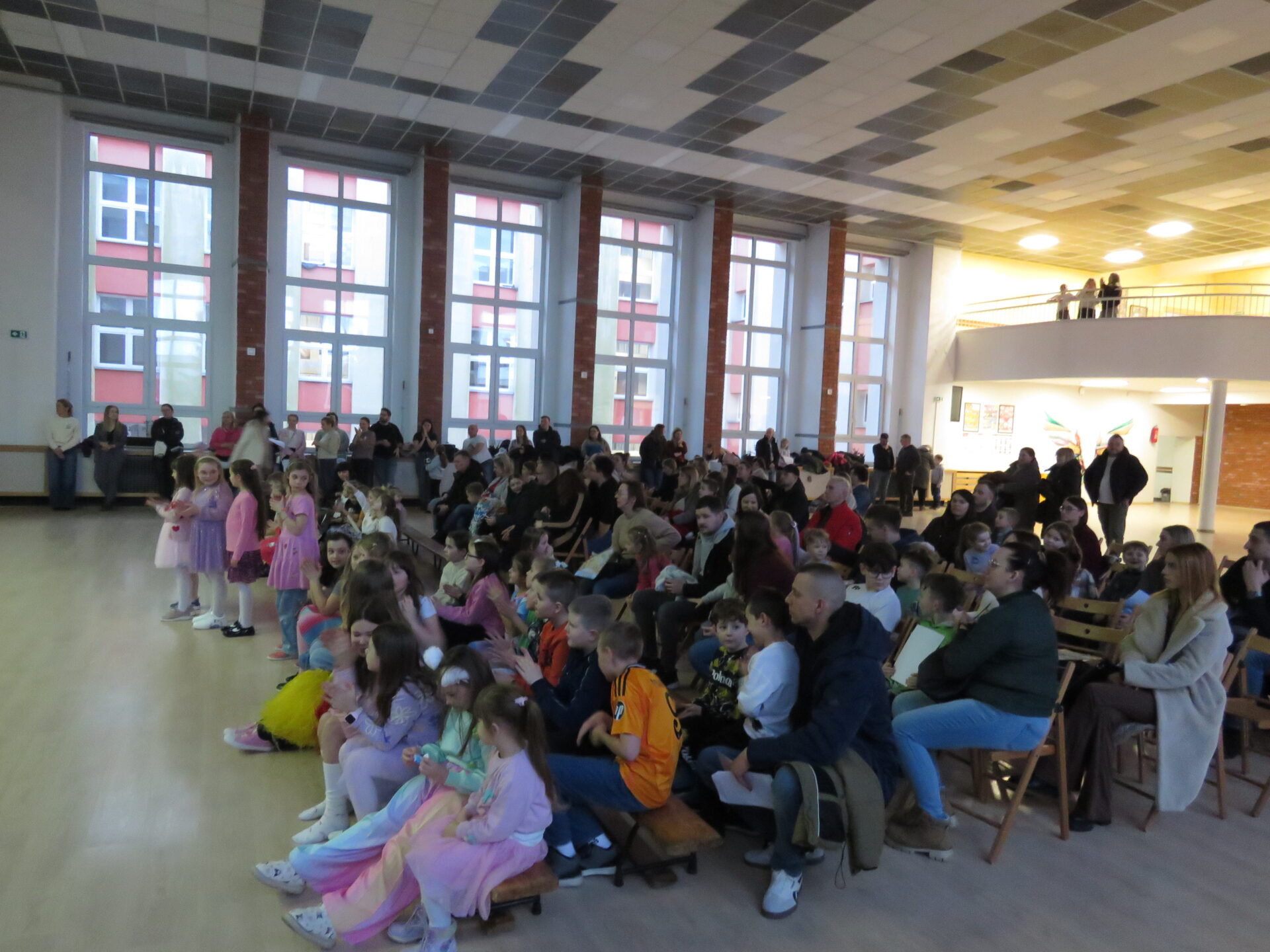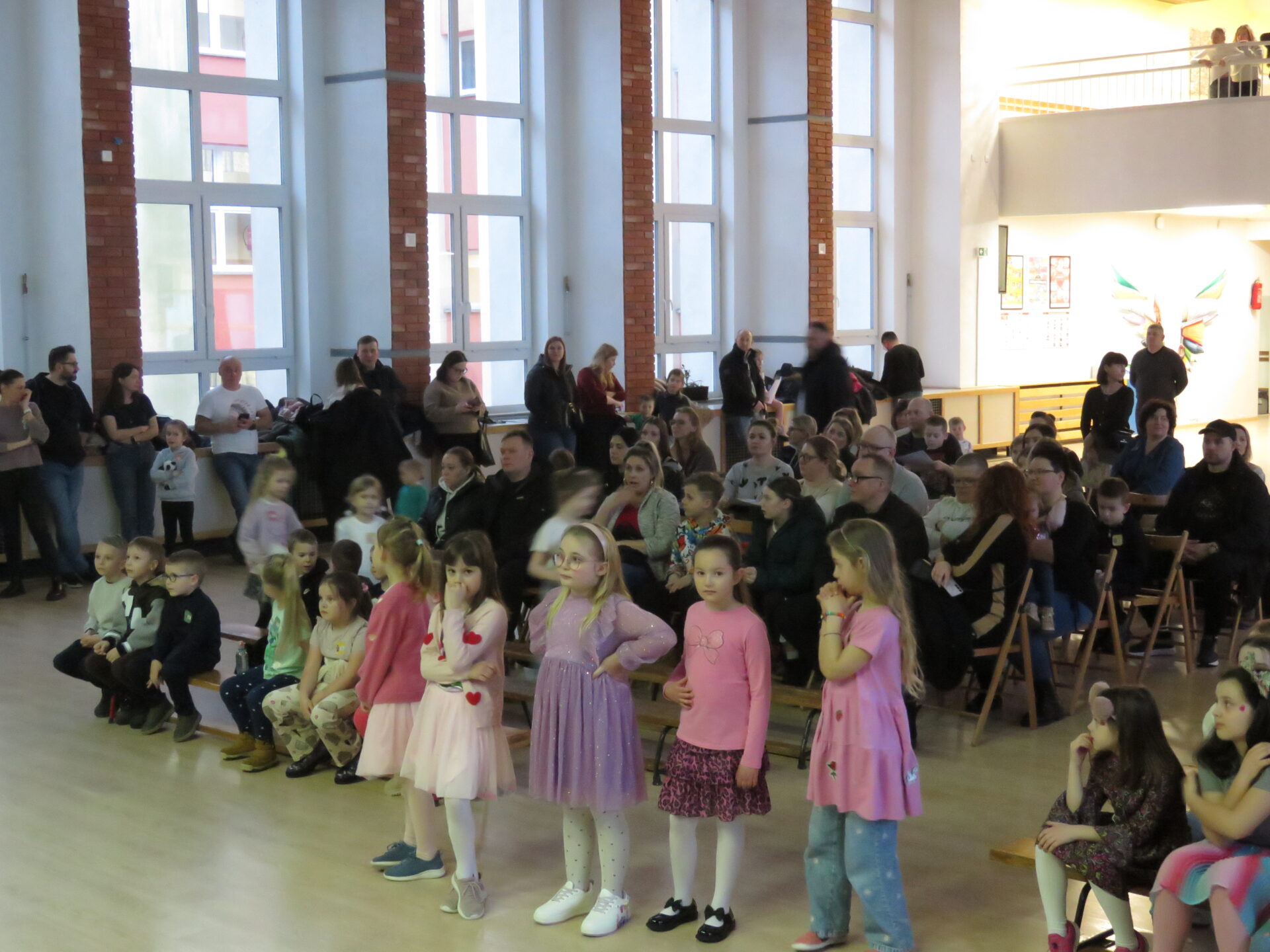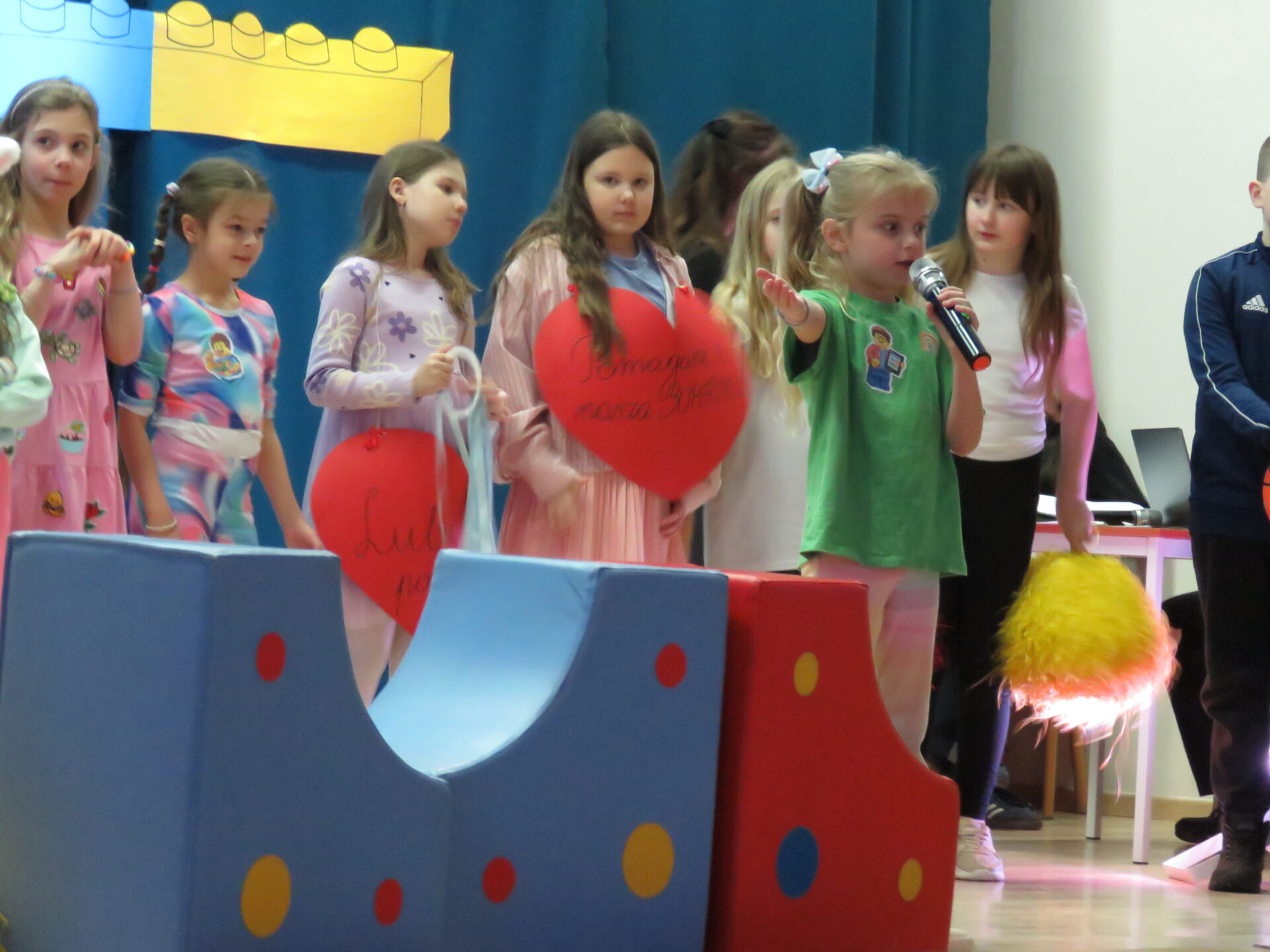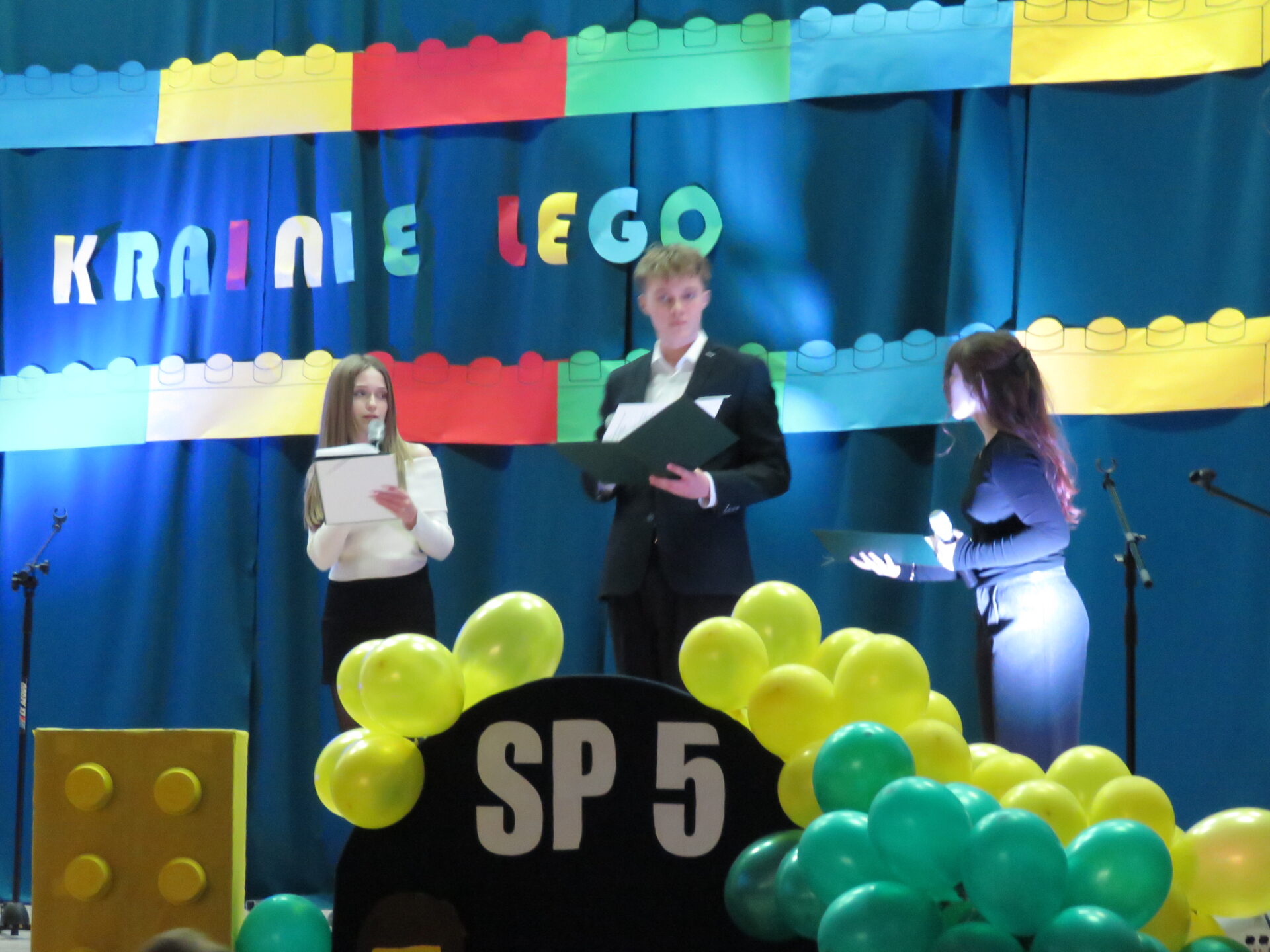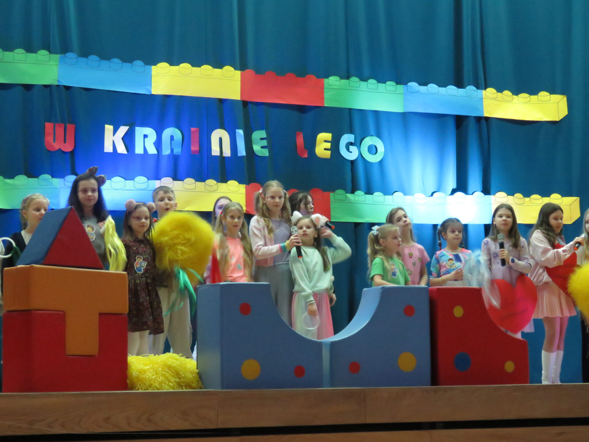 Gdy wszystkie grupy odwiedziły wyjątkowe zakątki, dzieci i rodzice ponownie zebrali się w auli. Spotkanie wzbogacił występ wysportowanych dziewcząt – Julii Suchińskiej, Julii Kempczeńskiej, Julii Tytz, które wszystkich zaprosiły do tańca. Radość, błyszczące oczy oraz wypieki na twarzach dzieci świadczyły o kreatywnie i miło spędzonym popołudniu w Krainie Lego Piątaszka.