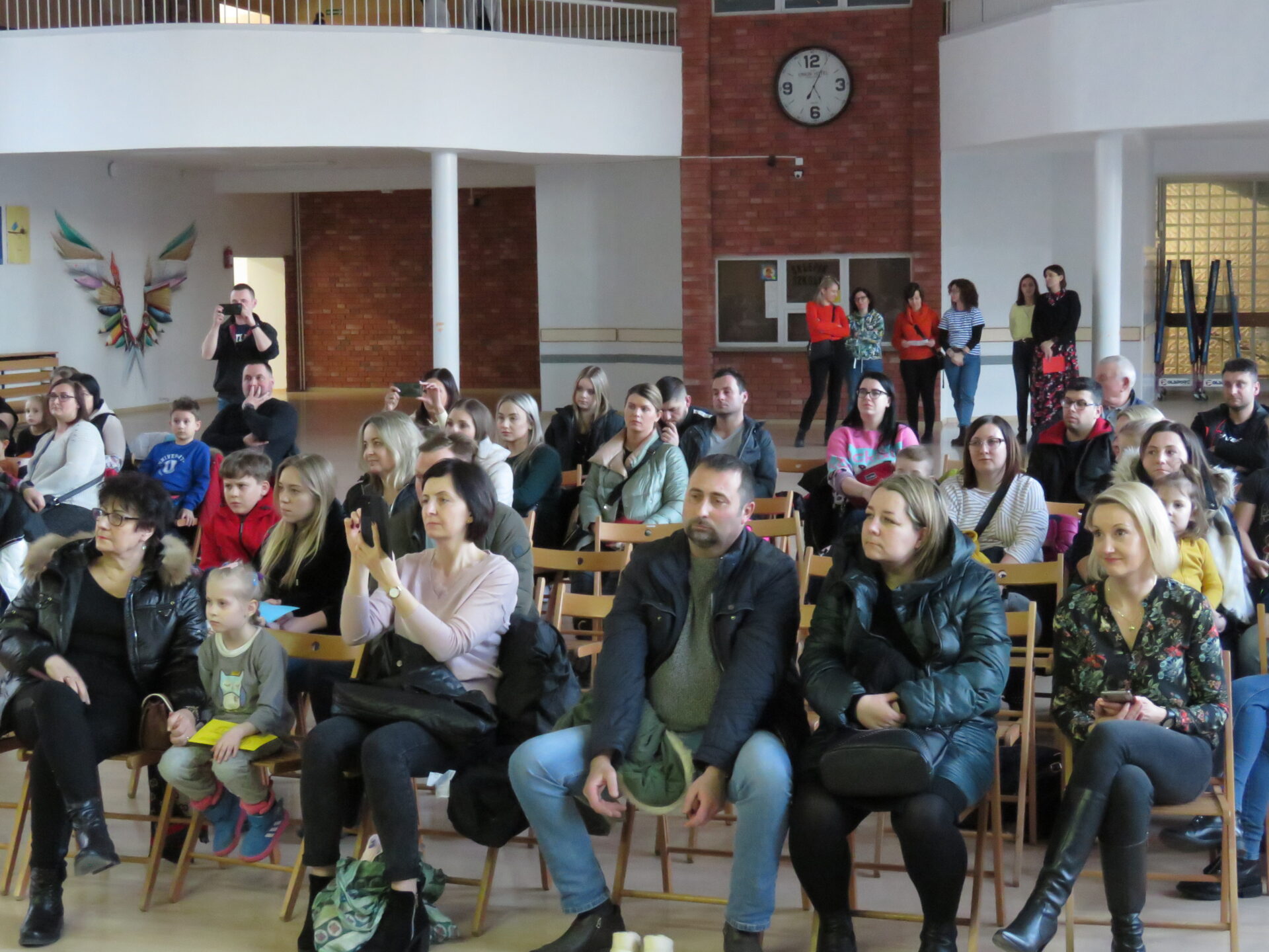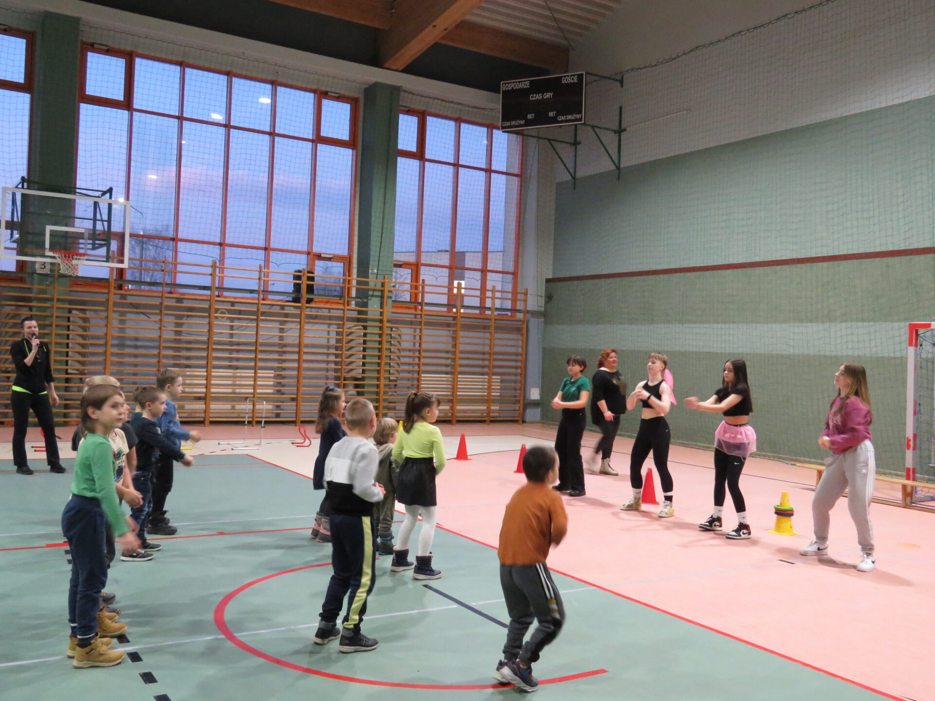 Po odwiedzeniu wszystkich portów dzieci i rodzice ponownie spotkali się w auli. Na zakończenie dziewczęta ze starszych klas zaprosiły gości do wspólnego tańca – Zumby. Tancerki przygotowała i czuwała nad ich występem – Pani Sabina Orłowska. Część artystyczną w auli poprowadzili uczniowie: Nikola Wypych oraz Bartosz Nabrdalik.