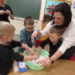 - „ Kajutę morskich skarbów” – Panie: Anna Jarzynka, Agata Gomułka- Zwierz, Jolanta Kowalczyk- Okrucińska zaprosiły dzieci w niezwykłą podróż po doznaniach sensorycznych, manualnych. Dzieci odważnie i z zaciekawieniem uczestniczyły w kolejnych zadaniach: manipulowanie w cieczy nienewtonowskiej, tworzenie rysunku o tematyce morskiej z różnych substancji.