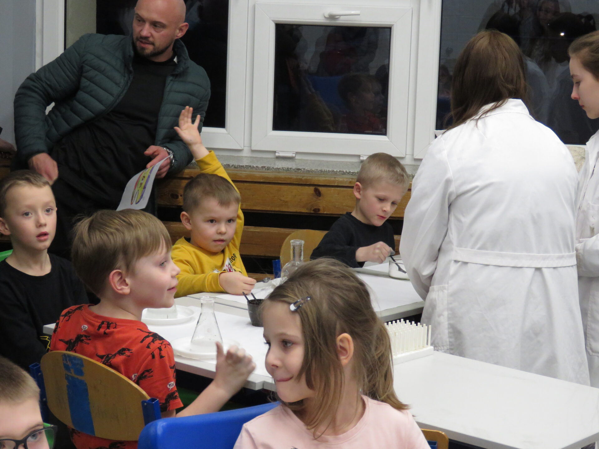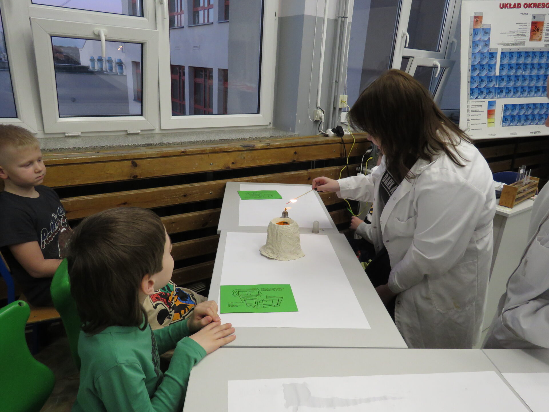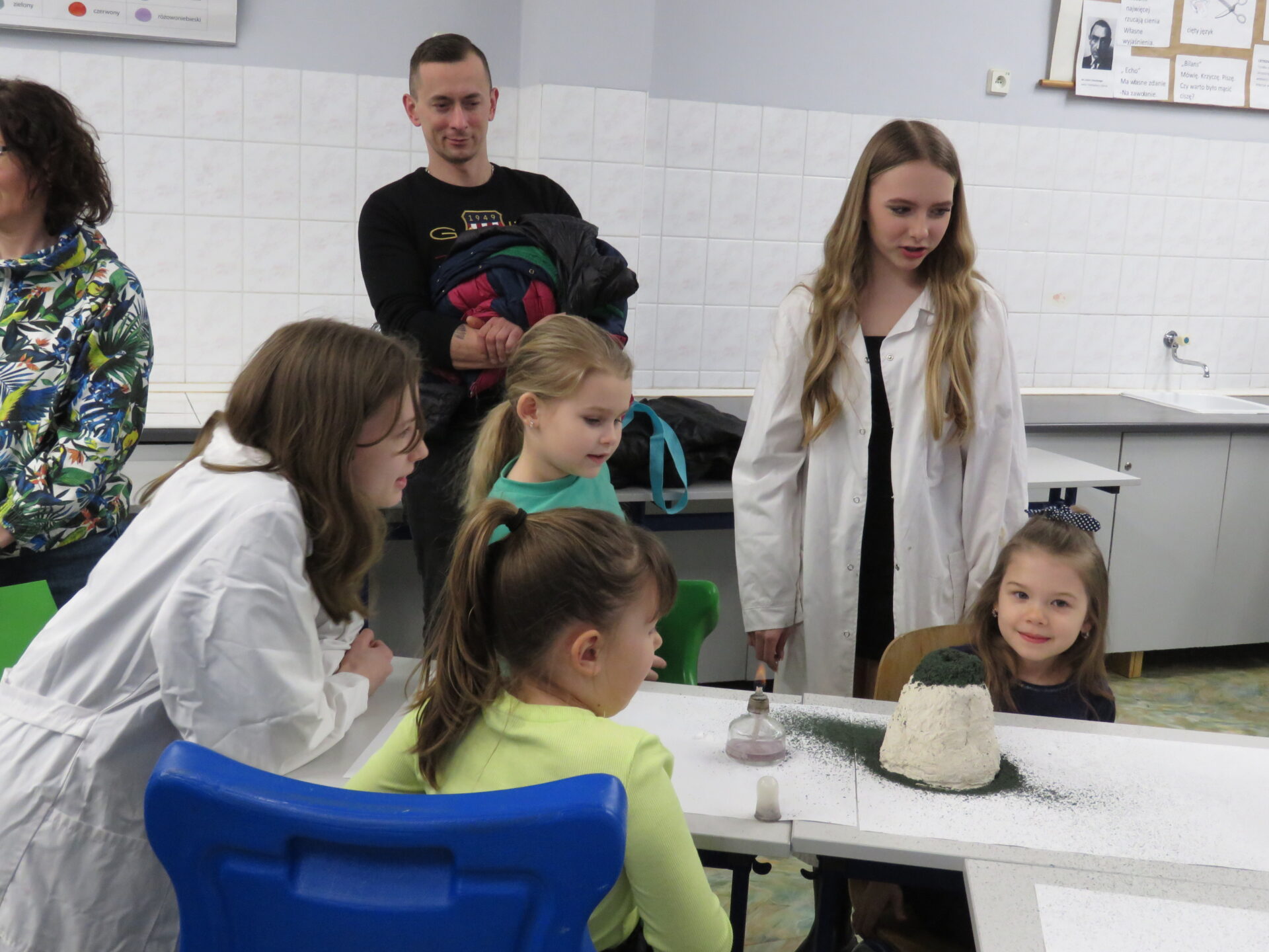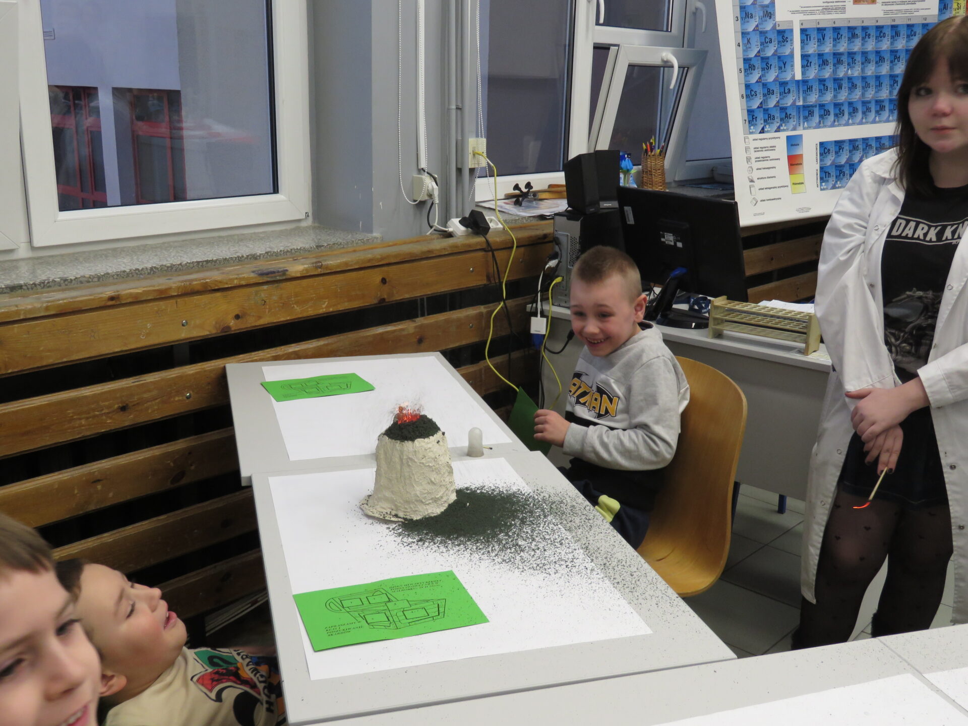 - „Magiczną kajutę” – uczniowie klas 8 pod kierunkiem Pani Jolanty Przybyszewskiej oczarowali przybyłe dzieci niesamowitymi doświadczeniami. Podczas spotkania przyszli pierwszoklasiści zobaczyli następujące tajemnicze doświadczenia: „Sztywna piana”, „Zupa kapitana”, „Wulkan”. Niektóre z tych doświadczeń z pomocą uczniów klas 8 wykonali samodzielnie.