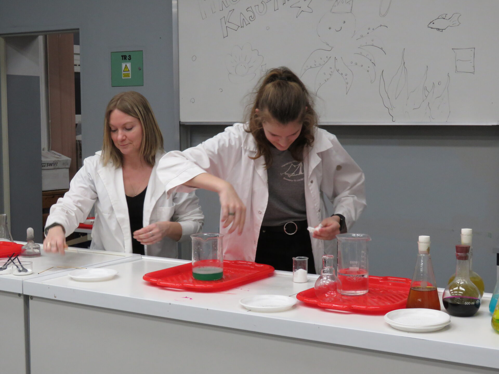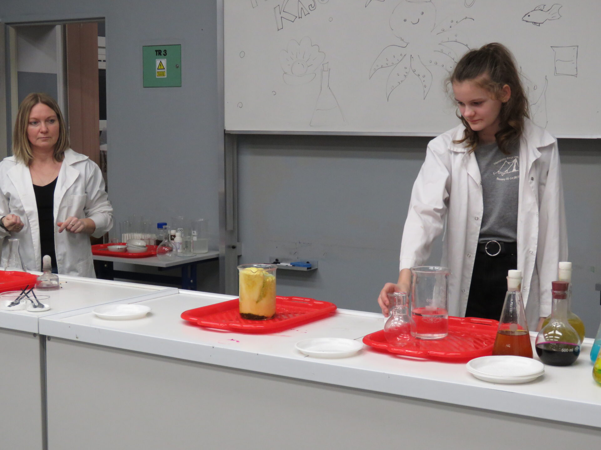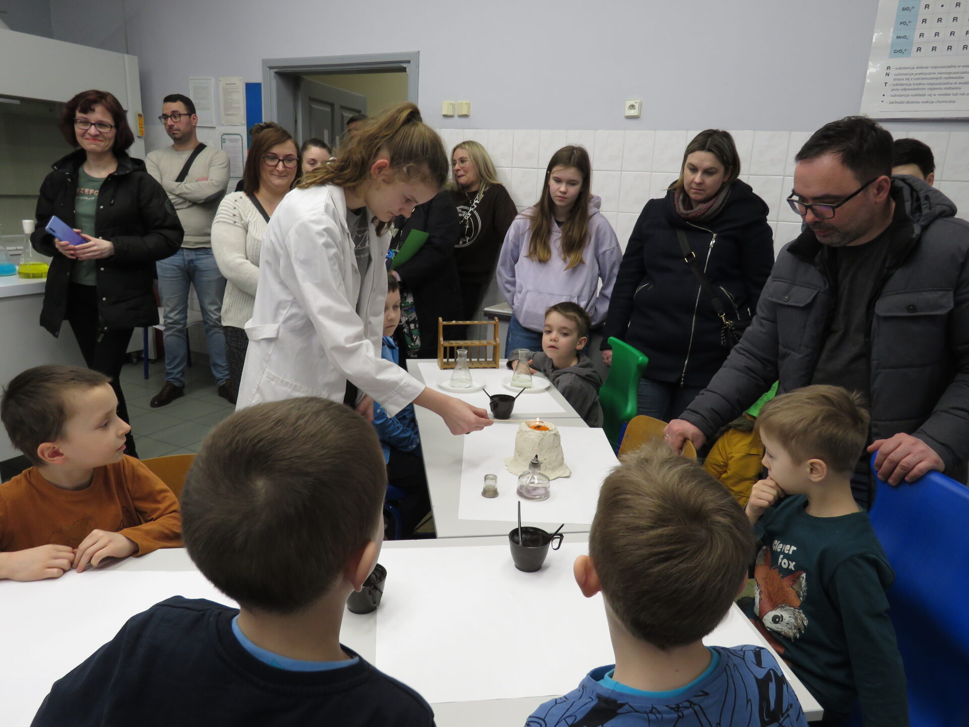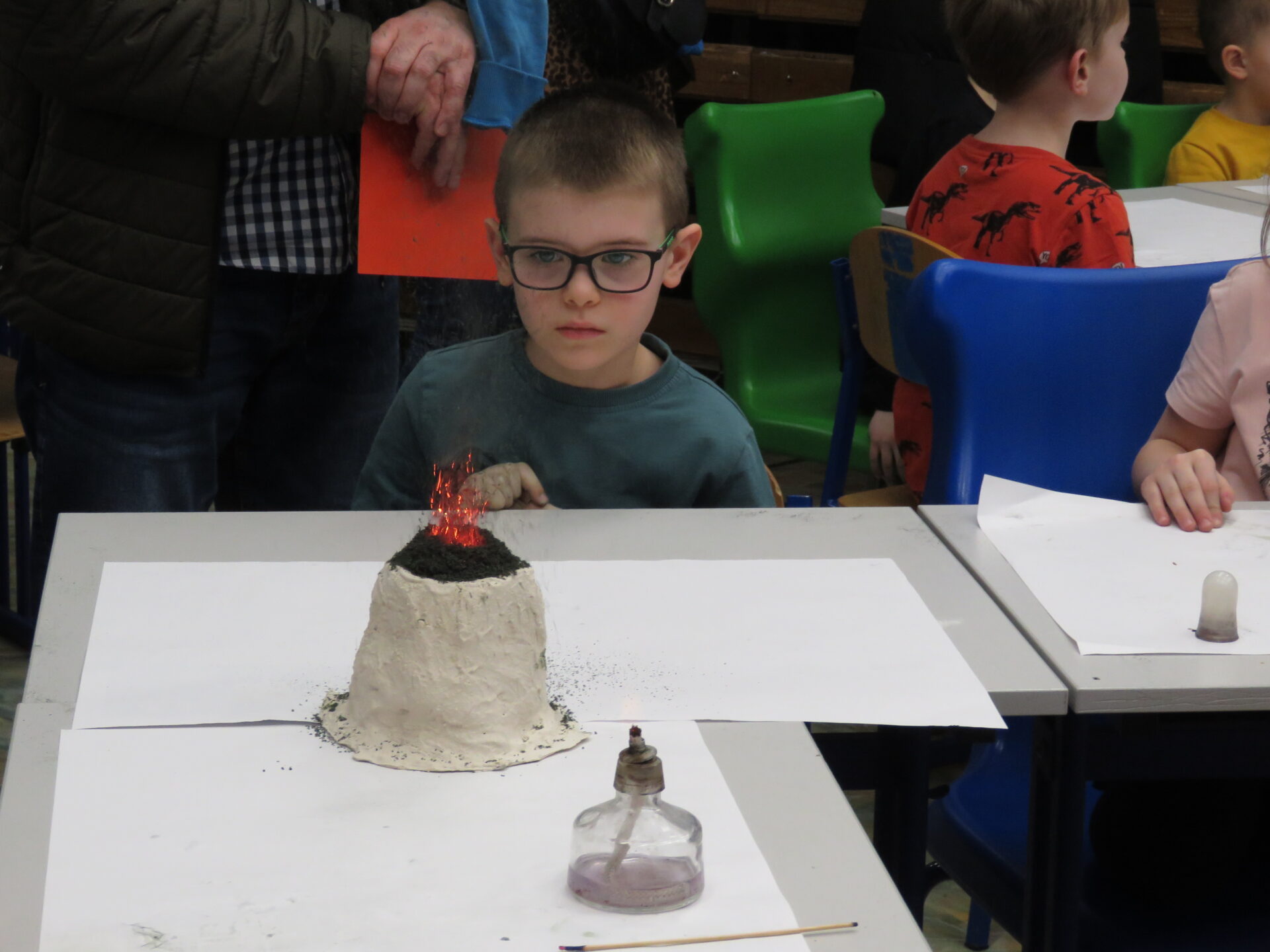 - „Magiczną kajutę” – uczniowie klas 8 pod kierunkiem Pani Jolanty Przybyszewskiej oczarowali przybyłe dzieci niesamowitymi doświadczeniami. Podczas spotkania przyszli pierwszoklasiści zobaczyli następujące tajemnicze doświadczenia: „Sztywna piana”, „Zupa kapitana”, „Wulkan”. Niektóre z tych doświadczeń z pomocą uczniów klas 8 wykonali samodzielnie.