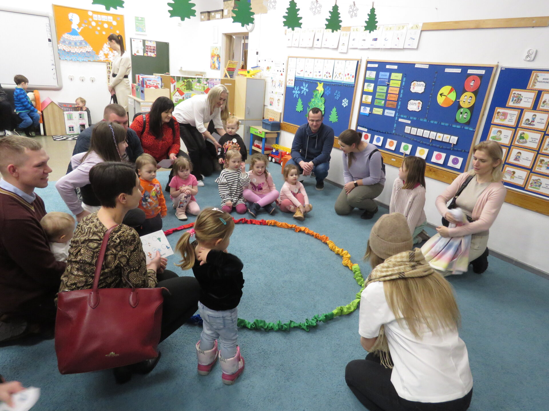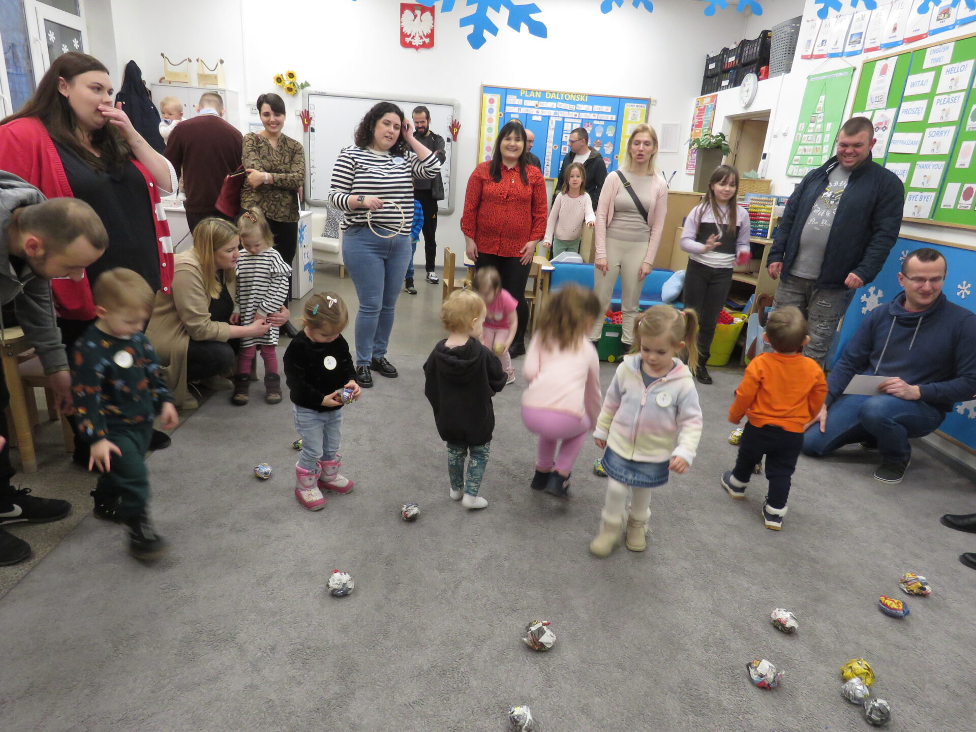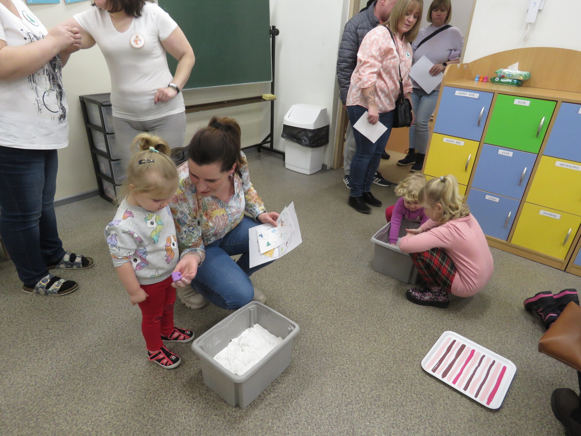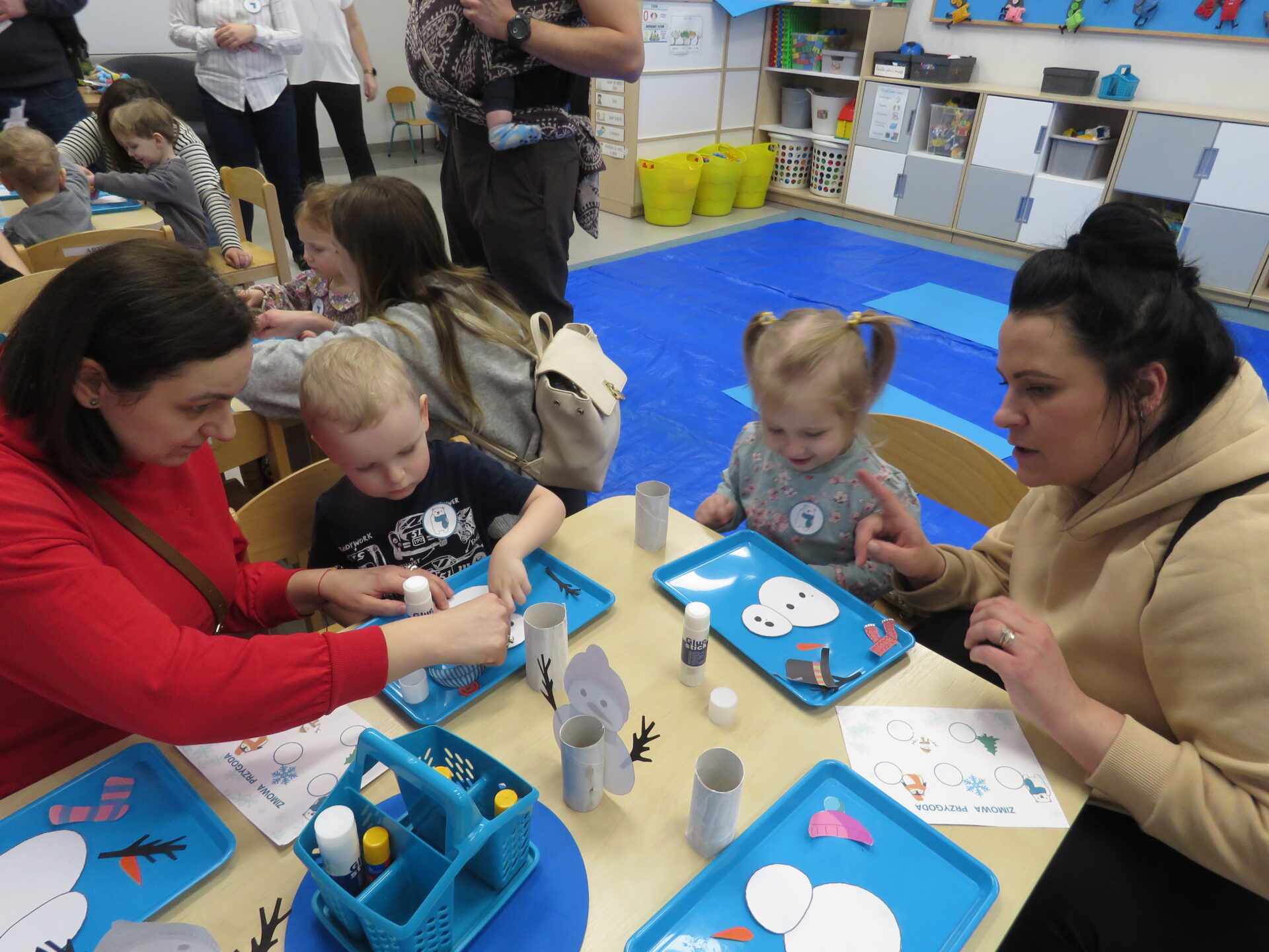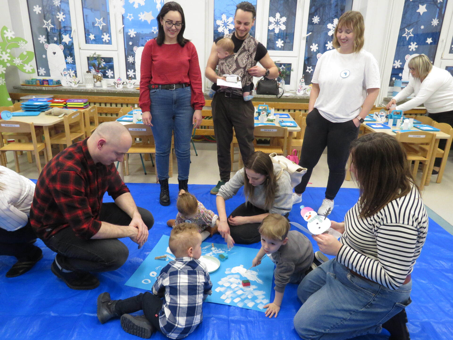 Następnie zaprosiliśmy rodziców z dziećmi do poszczególnych przewodników. Maluchy odwiedzały sale przedszkolne uczestnicząc w zabawach tematycznie związanych z hasłem przewodnim Dnia Otwartego Przedszkola – Zimowe przygody..