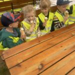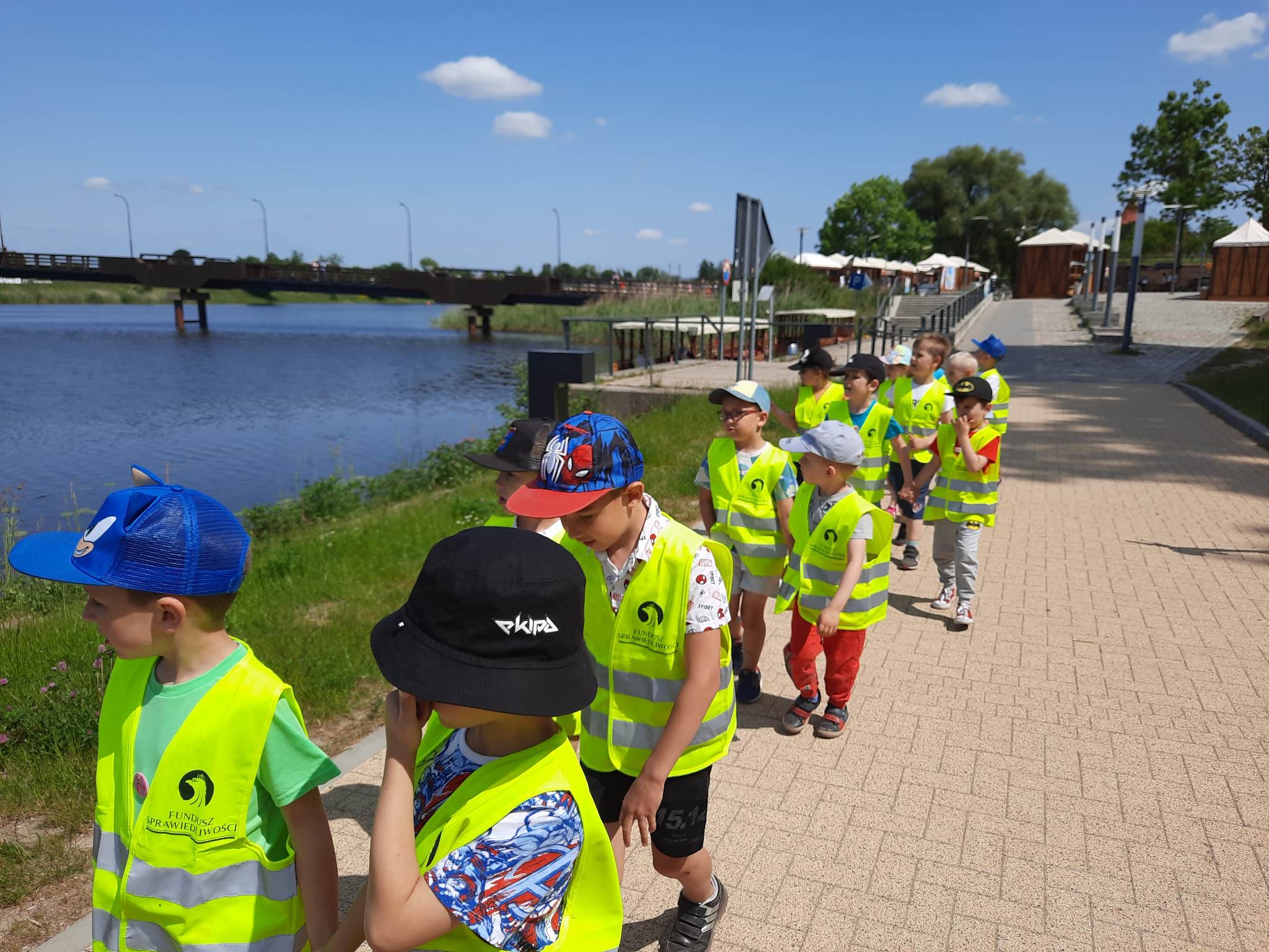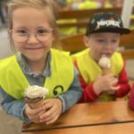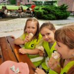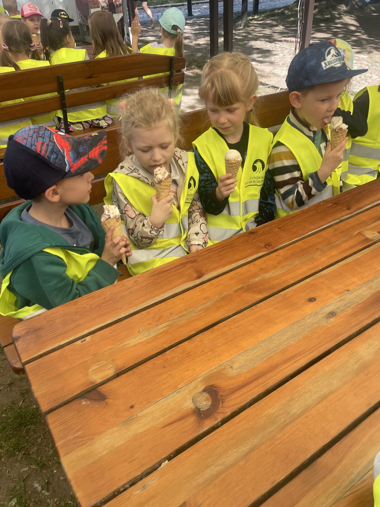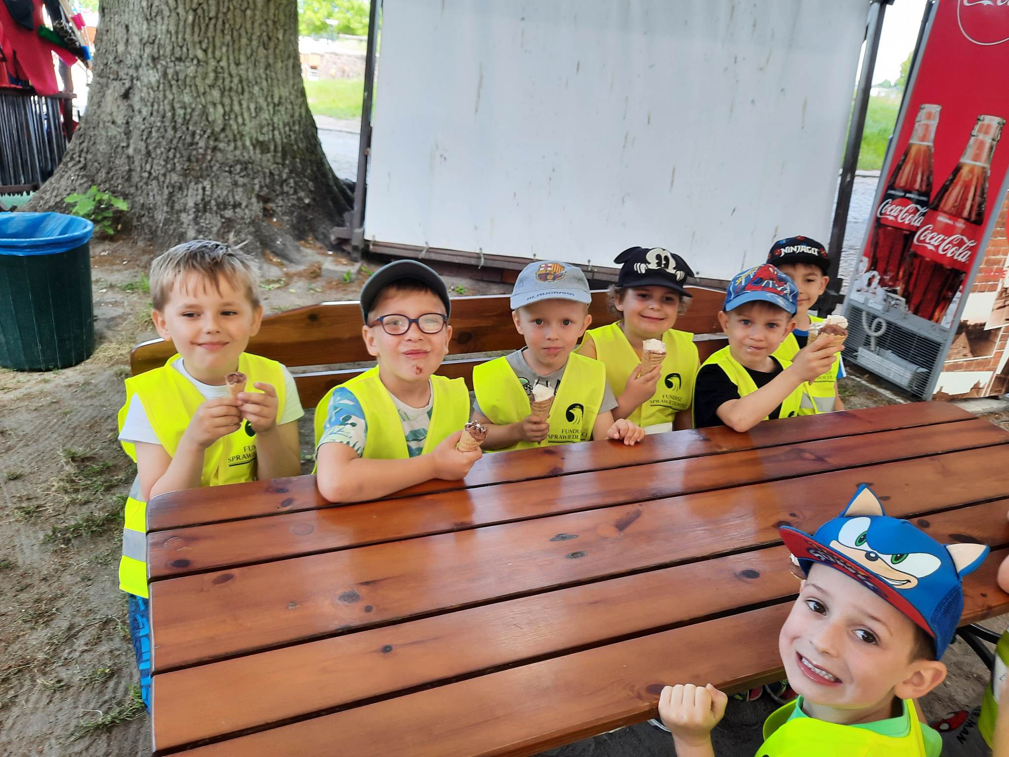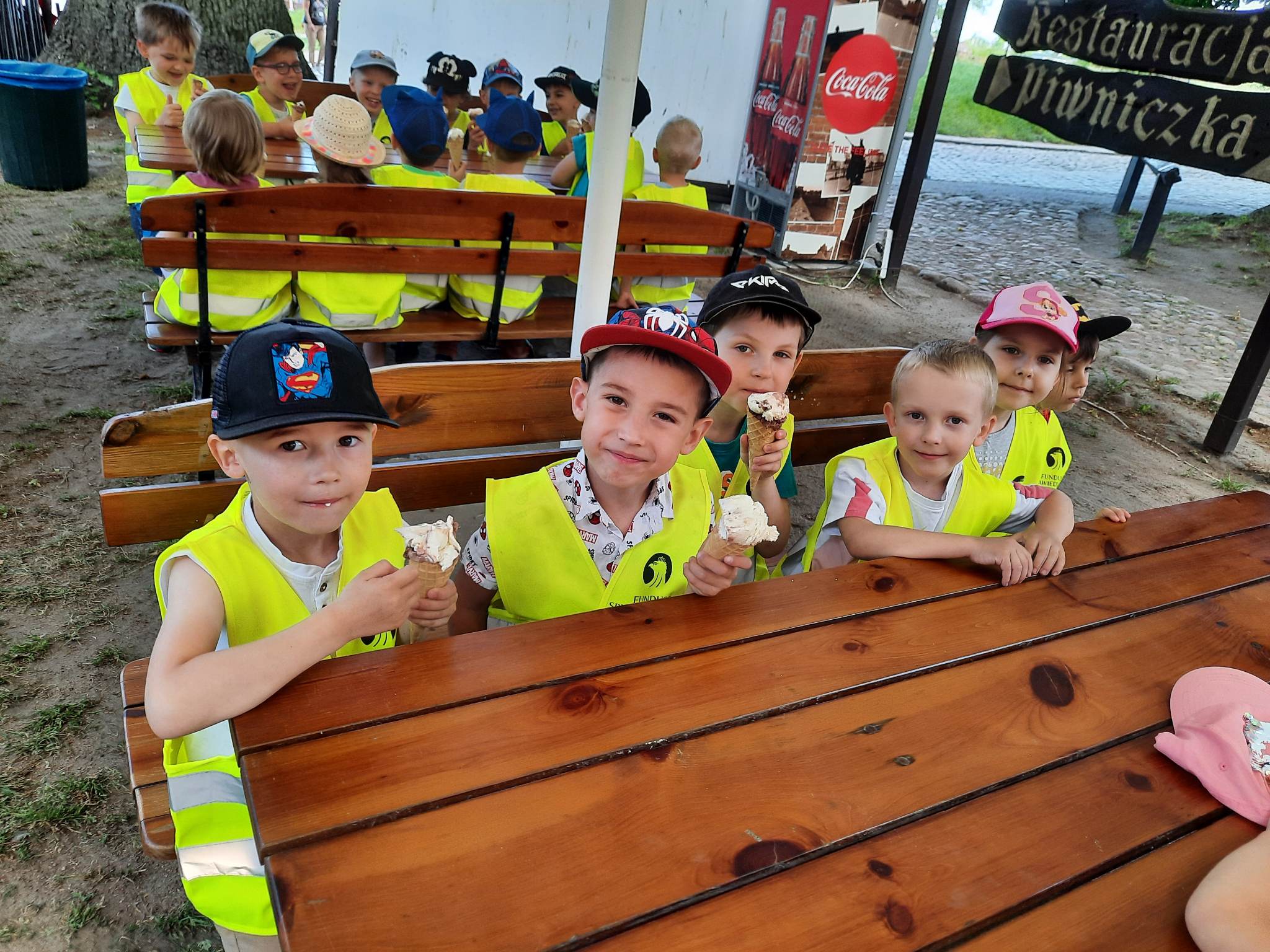 Następnie przedszkolaki udały się do restauracji „Piwniczka” na pyszne śmietankowo-czekoladowe lody, które były prezentem od pracowników lokalu dla naszych podopiecznych. Zimny deser w upalny dzień sprawił dzieciom ogromną radość. To wspaniale patrzeć na uśmiechnięte i kolorowe od lodów buzie naszych przedszkolaków. Po smacznym poczęstunku, wszyscy uśmiechnięci i zadowoleni wróciliśmy do przedszkola..