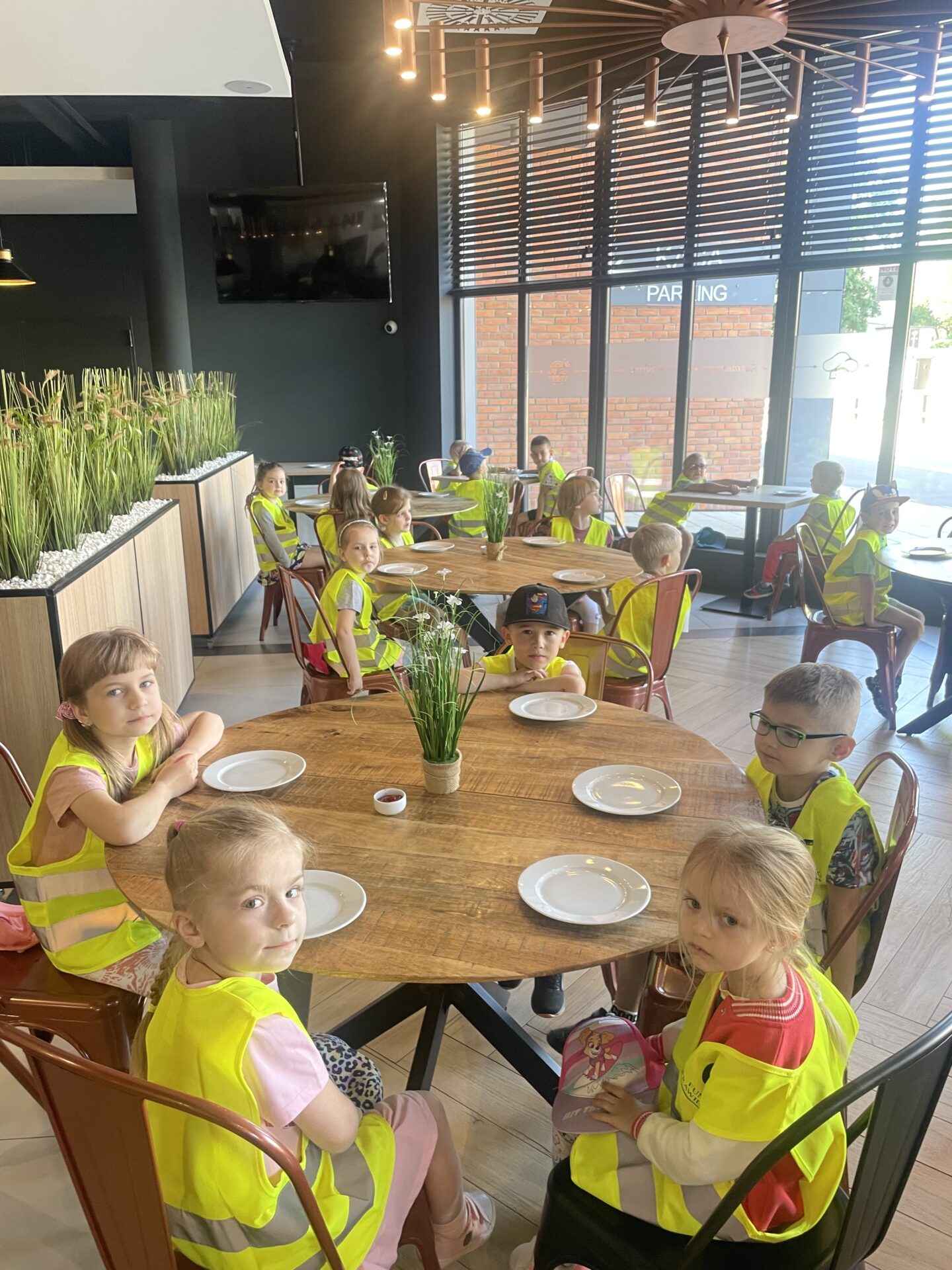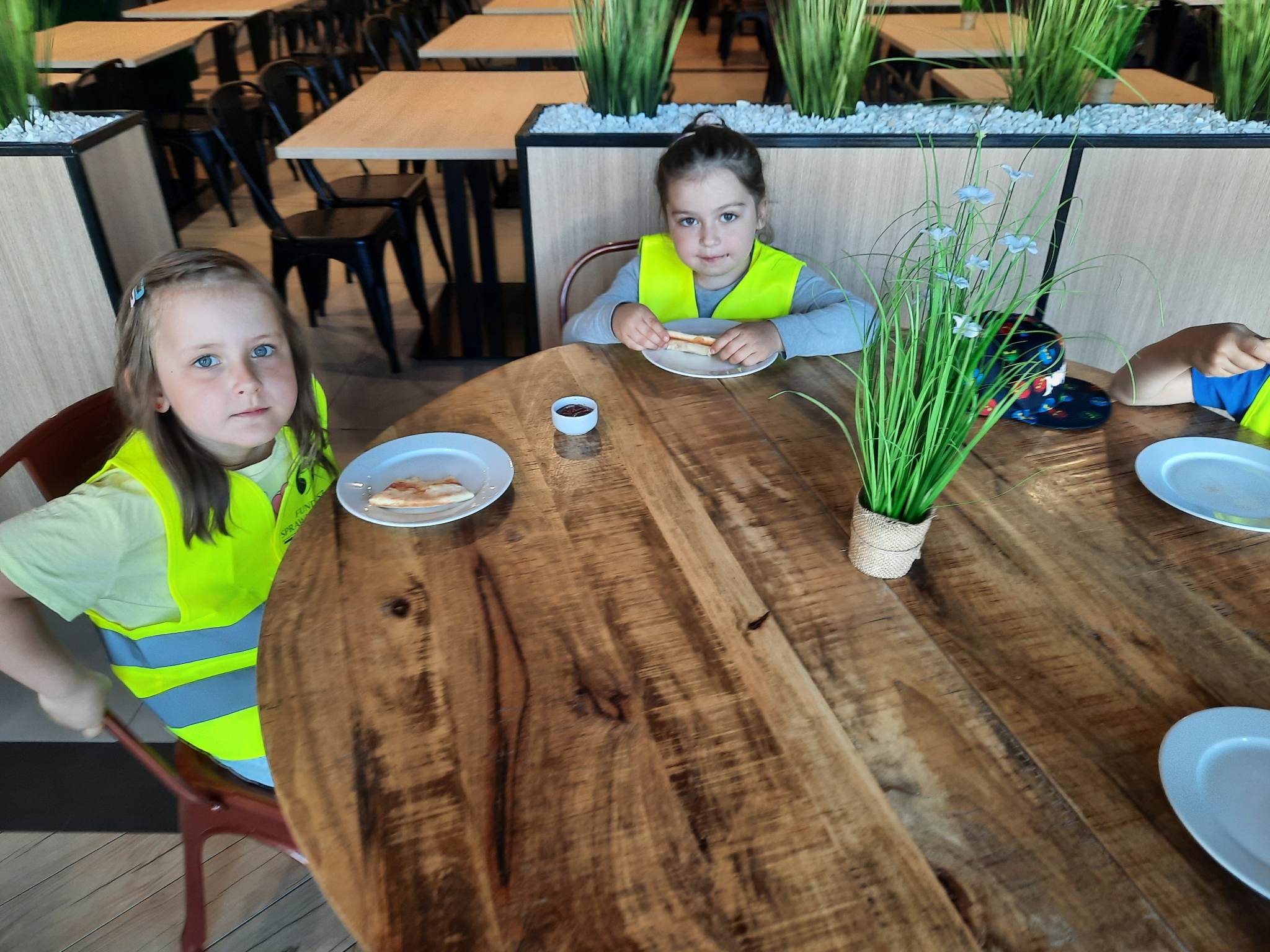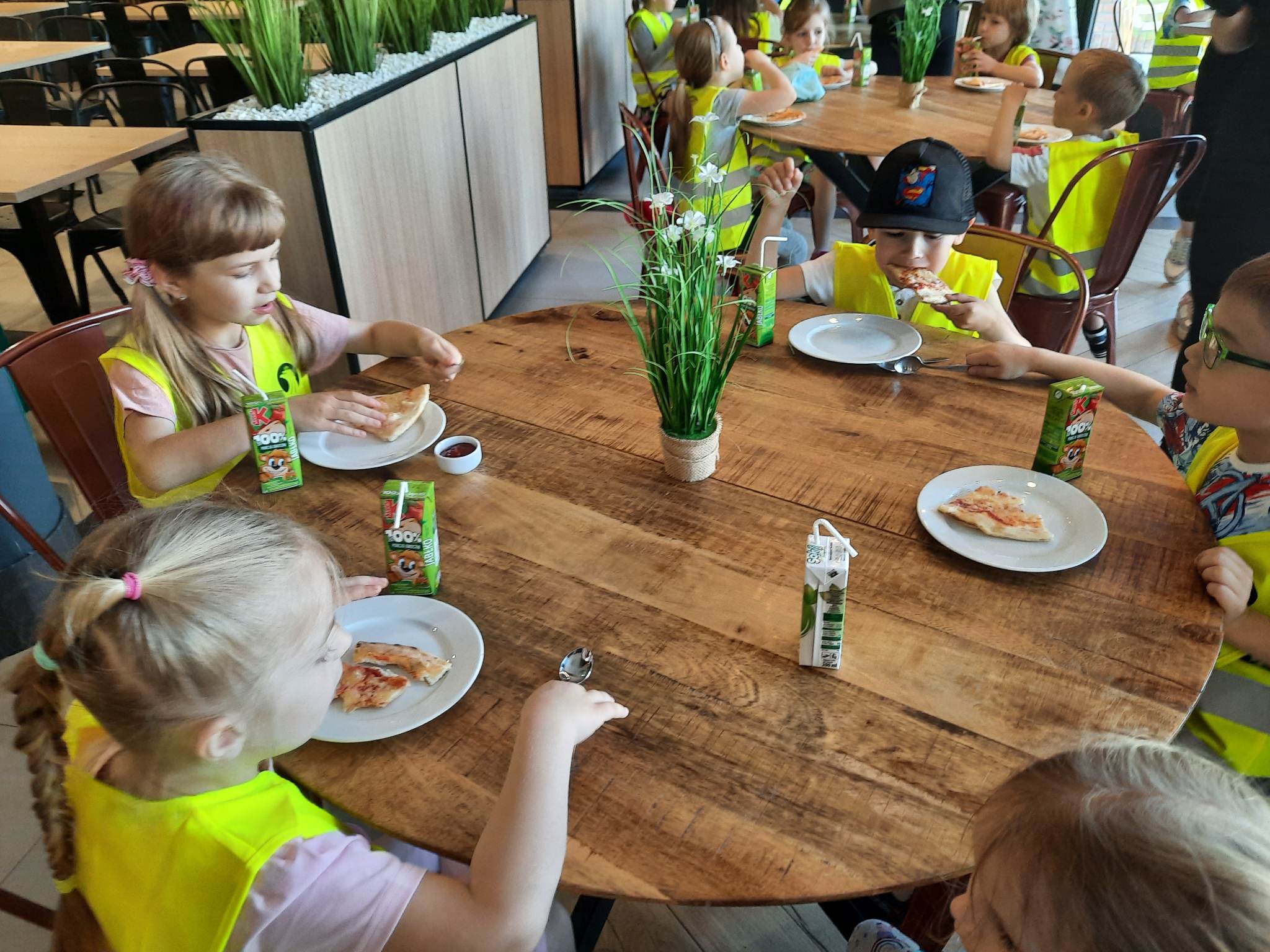 Dzień Dziecka był dla przedszkolaków z grup „Pszczółki” i „Słoneczniki” dniem pełnym wrażeń kulinarnych. Pierwszą z atrakcji był wspólny spacer do pizzerni „Bastion”. Celem wycieczki było zapoznanie dzieci z wyglądem i wyposażeniem pizzerii. Dzieci miały możliwość przypomnienia sobie zasad kulturalnego zachowania się w pizzerii, a także przy stole podczas posiłku. Jadły z wielkim apetytem przygotowaną pizzę. Przedszkolaki stwierdziły, że świetnie się bawiły i z chęcią jeszcze tu wrócą. Na koniec wizyty dzieci wykonały pamiątkowe zdjęcia.