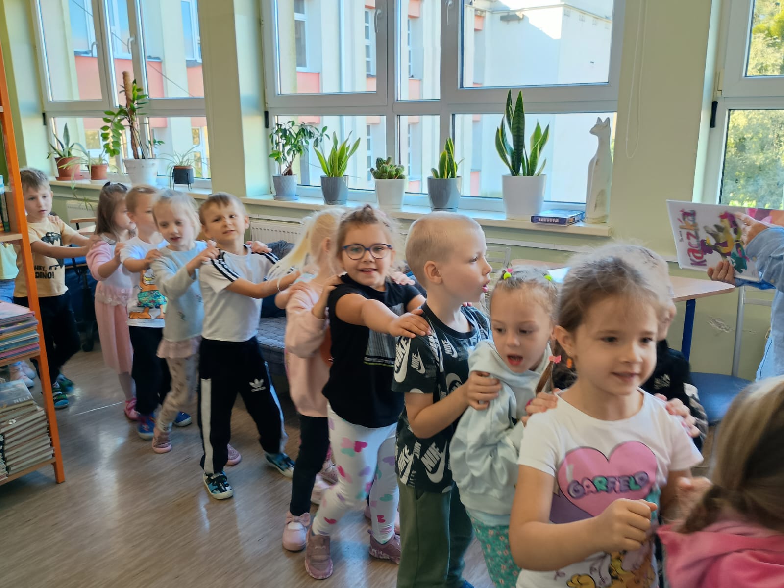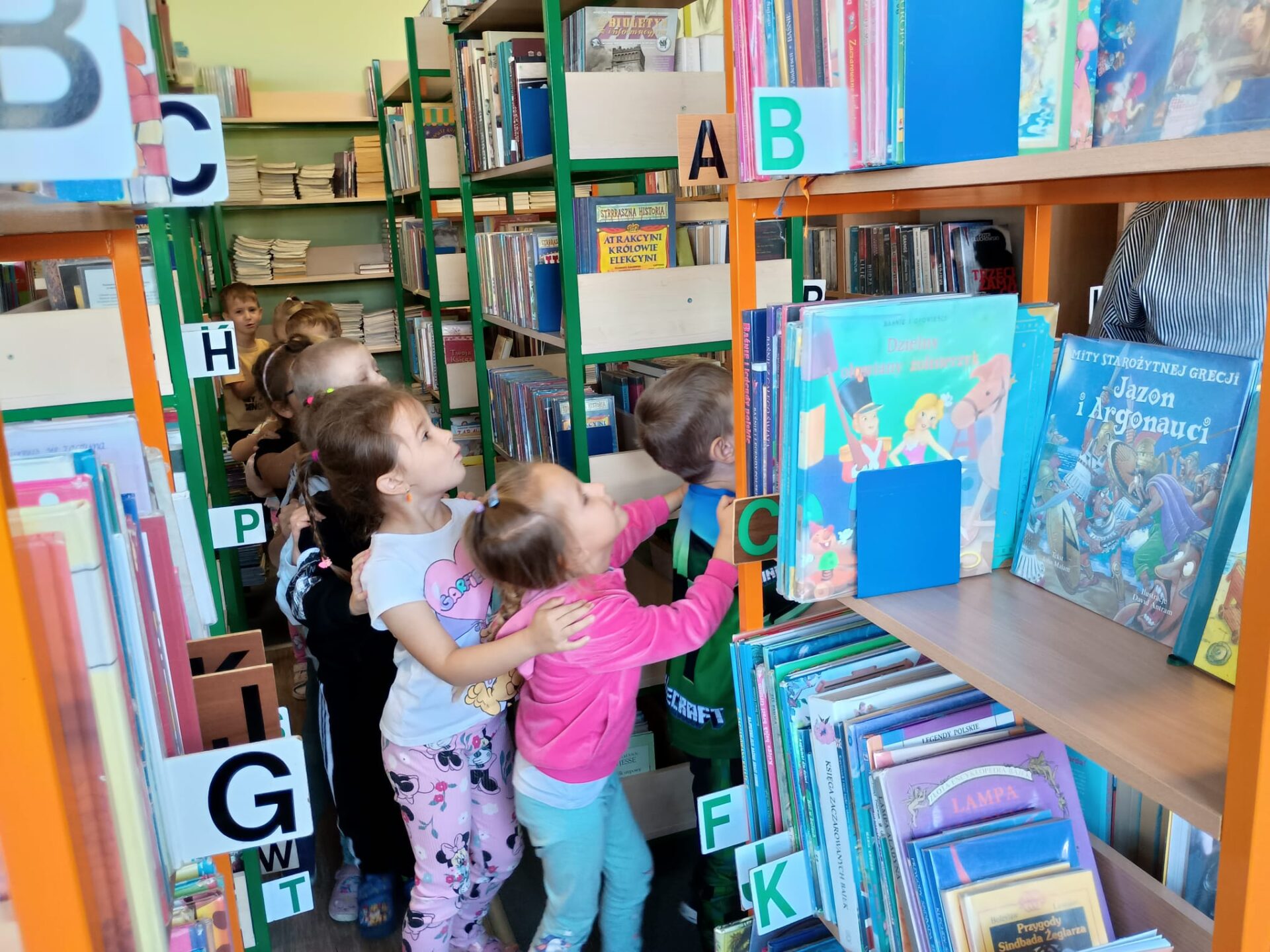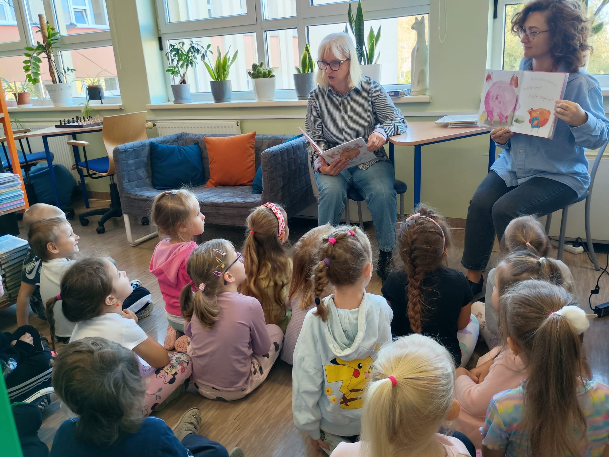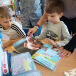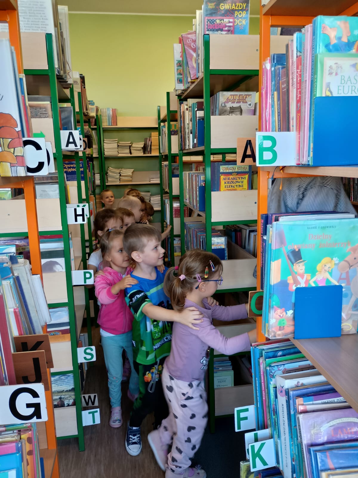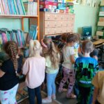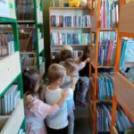 Grupa „FIOŁKI” tego dnia wybrała się do biblioteki szkolnej. Z wielką radością dzieci zapoznały się z magicznym miejscem. Pani bibliotekarka przeczytała dzieciom krótką bajeczkę pt.: „Kura, co tyła na diecie”. Przedszkolaki słuchały z zaciekawieniem, a po wysłuchaniu bajeczki odpowiadały na zadawane pytania i zagadki o zwierzętach. Następnie dzieci zwiedziły bibliotekę, zapoznały się z pracą bibliotekarza i z wielkim zainteresowaniem oglądały książki znajdujące się na półkach, ale szczególnie zainteresował ich dział dla najmłodszych. Spotkanie odbyło się w miłej atmosferze, a uśmiechów i wrażeń nie było końca.