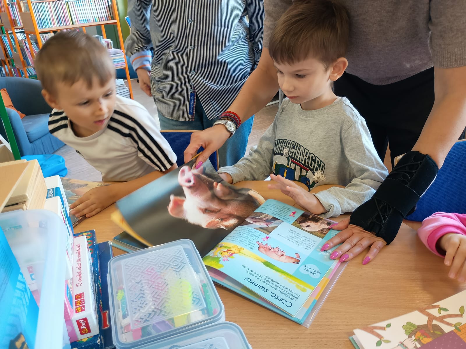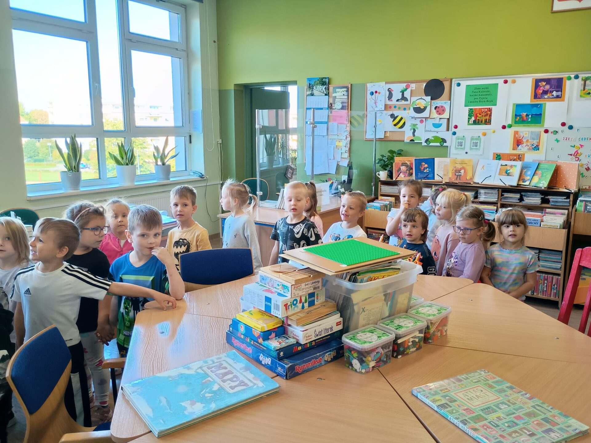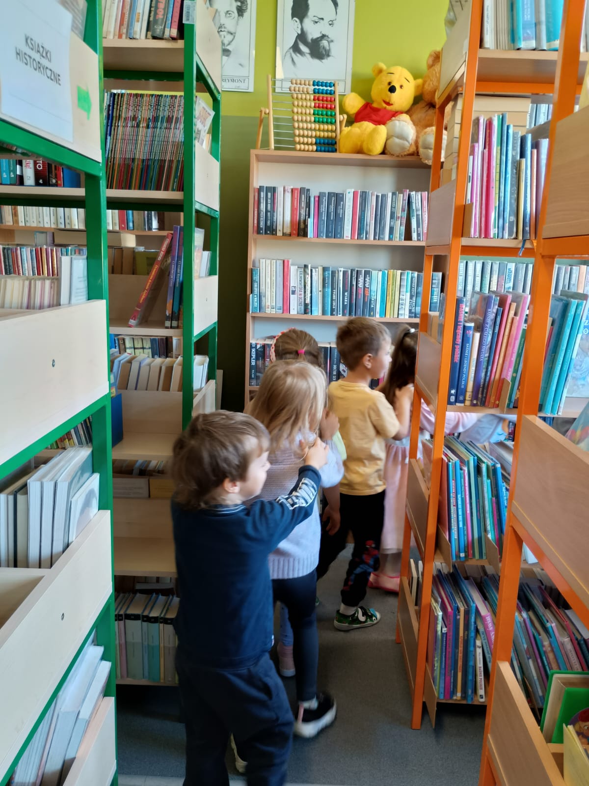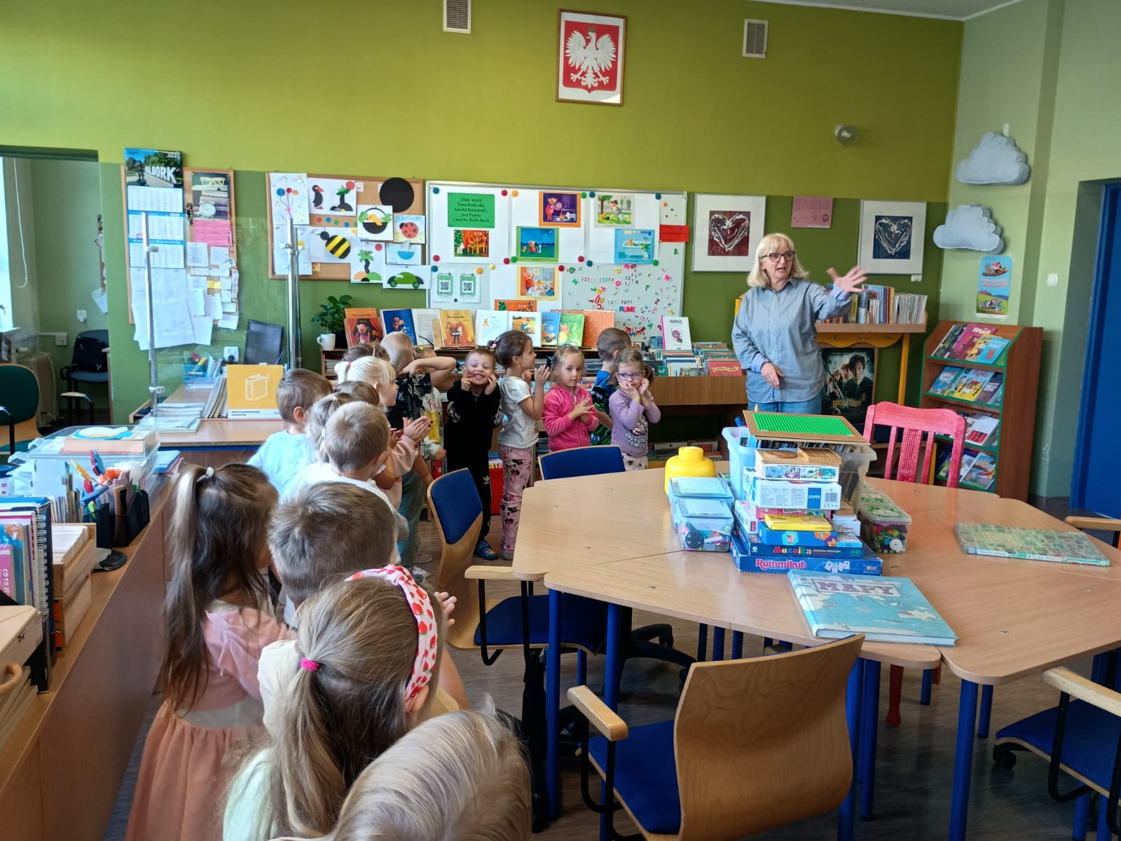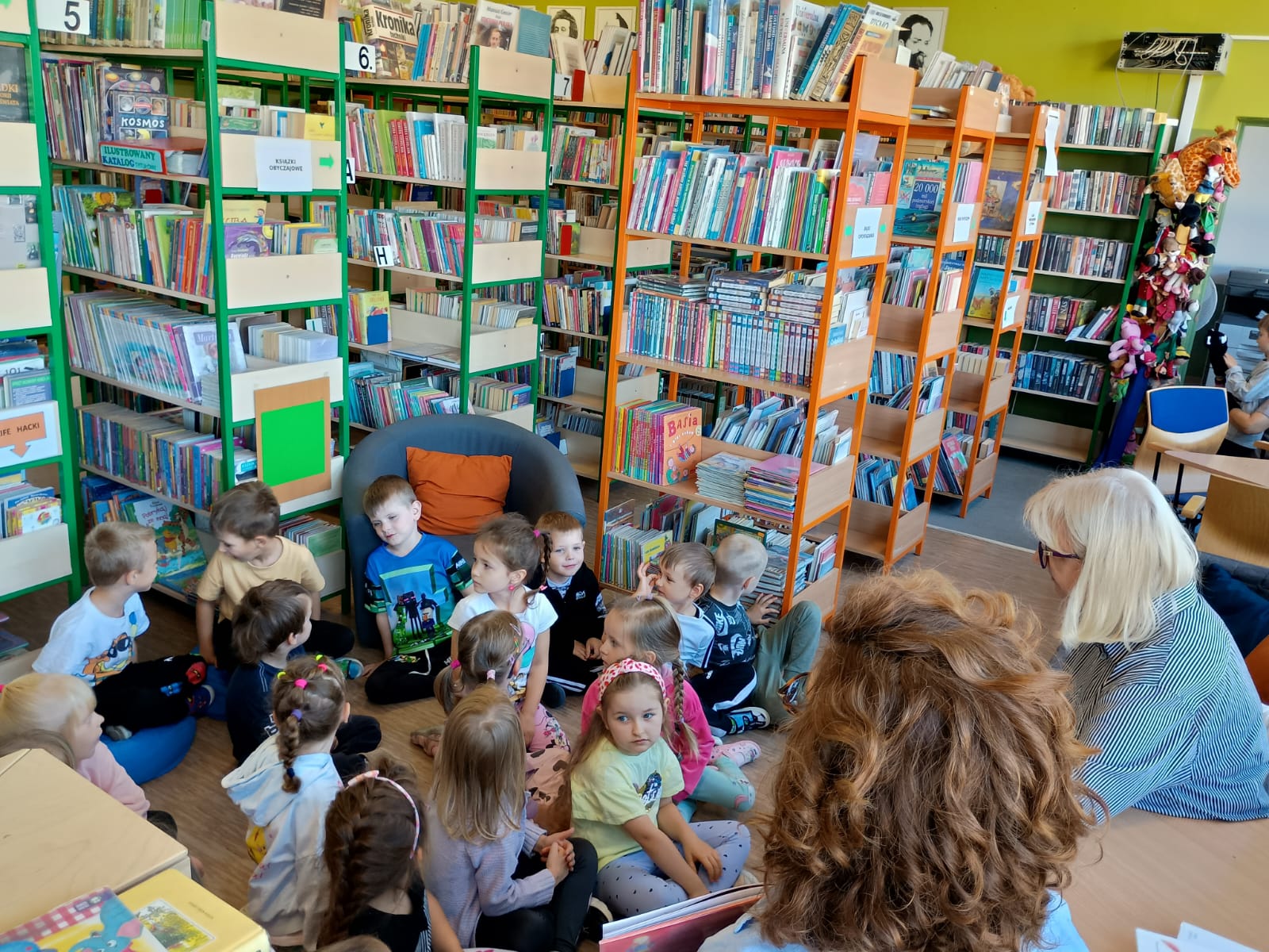 Grupa „FIOŁKI” tego dnia wybrała się do biblioteki szkolnej. Z wielką radością dzieci zapoznały się z magicznym miejscem. Pani bibliotekarka przeczytała dzieciom krótką bajeczkę pt.: „Kura, co tyła na diecie”. Przedszkolaki słuchały z zaciekawieniem, a po wysłuchaniu bajeczki odpowiadały na zadawane pytania i zagadki o zwierzętach. Następnie dzieci zwiedziły bibliotekę, zapoznały się z pracą bibliotekarza i z wielkim zainteresowaniem oglądały książki znajdujące się na półkach, ale szczególnie zainteresował ich dział dla najmłodszych. Spotkanie odbyło się w miłej atmosferze, a uśmiechów i wrażeń nie było końca.