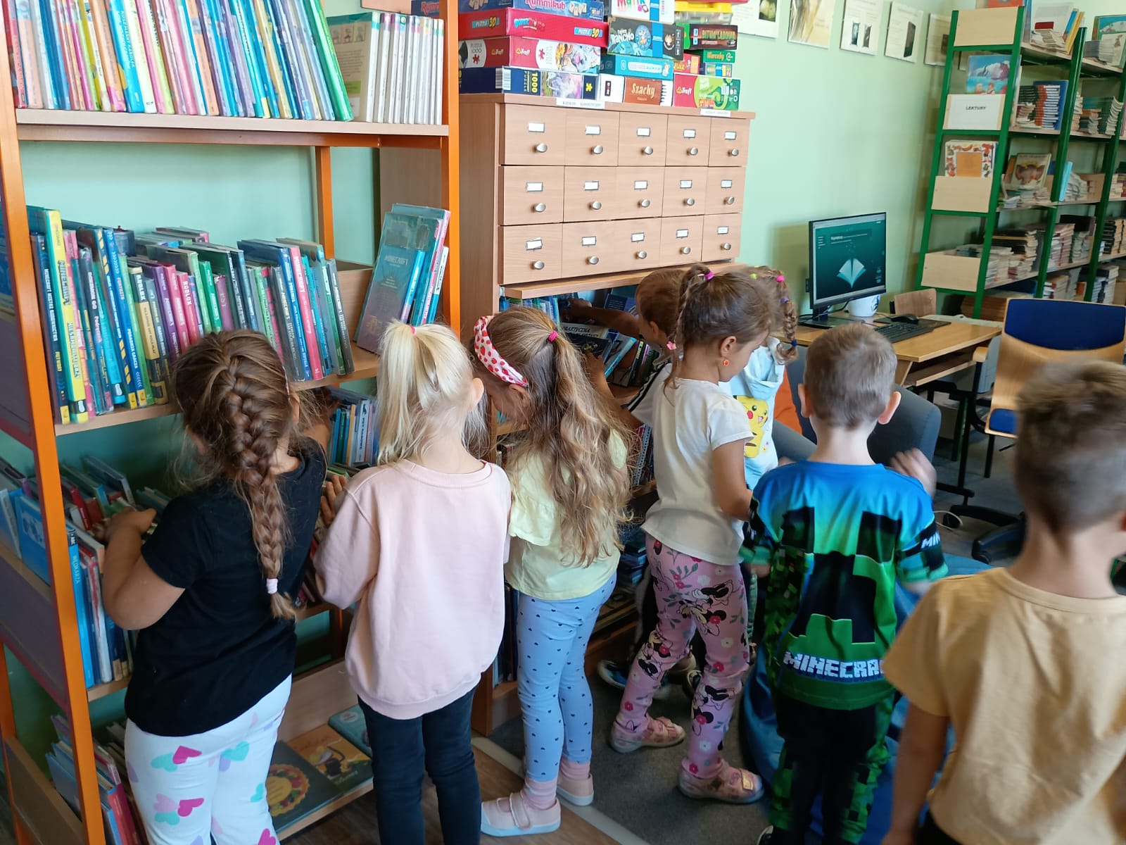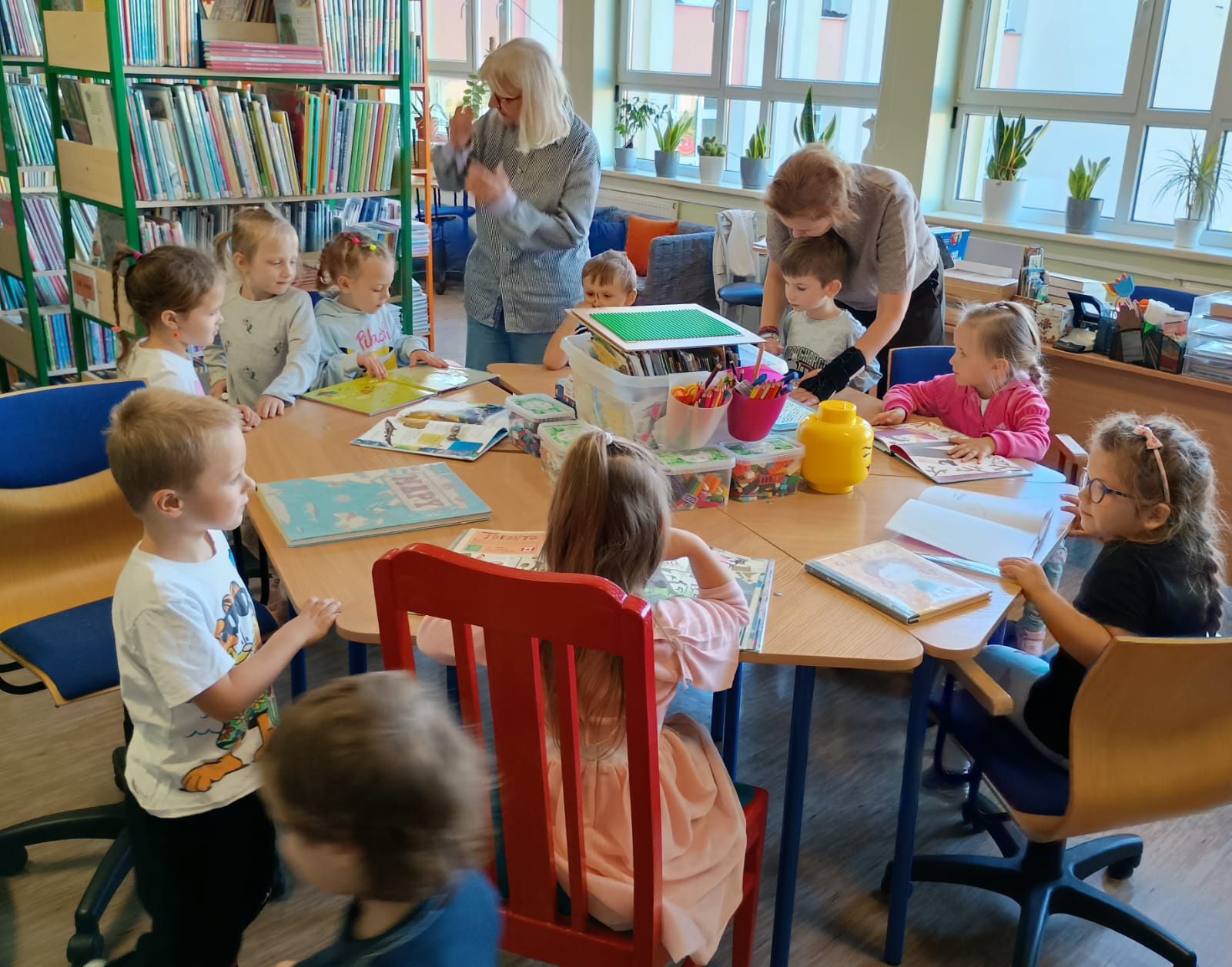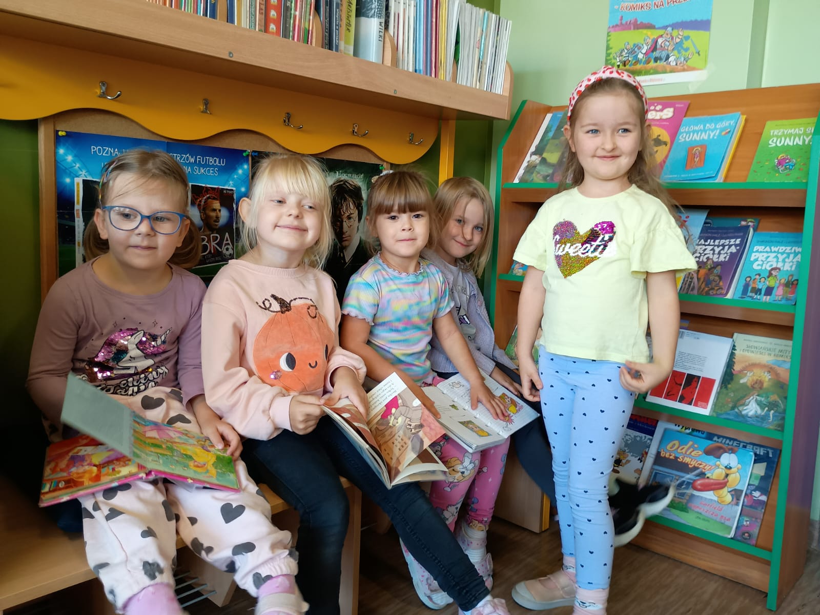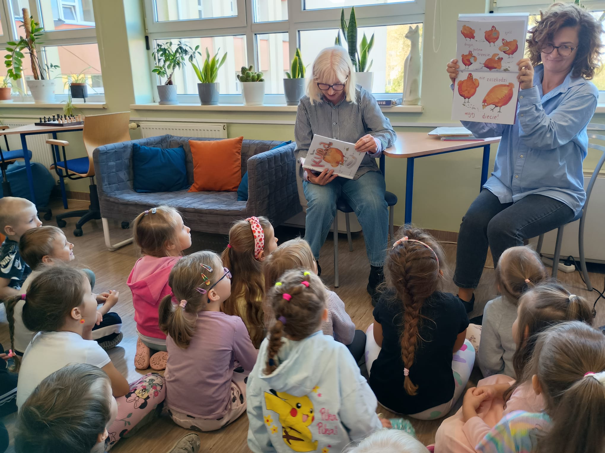 Grupa „FIOŁKI” tego dnia wybrała się do biblioteki szkolnej. Z wielką radością dzieci zapoznały się z magicznym miejscem. Pani bibliotekarka przeczytała dzieciom krótką bajeczkę pt.: „Kura, co tyła na diecie”. Przedszkolaki słuchały z zaciekawieniem, a po wysłuchaniu bajeczki odpowiadały na zadawane pytania i zagadki o zwierzętach. Następnie dzieci zwiedziły bibliotekę, zapoznały się z pracą bibliotekarza i z wielkim zainteresowaniem oglądały książki znajdujące się na półkach, ale szczególnie zainteresował ich dział dla najmłodszych. Spotkanie odbyło się w miłej atmosferze, a uśmiechów i wrażeń nie było końca.