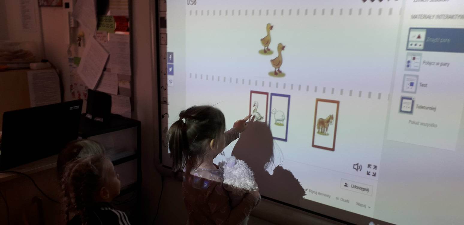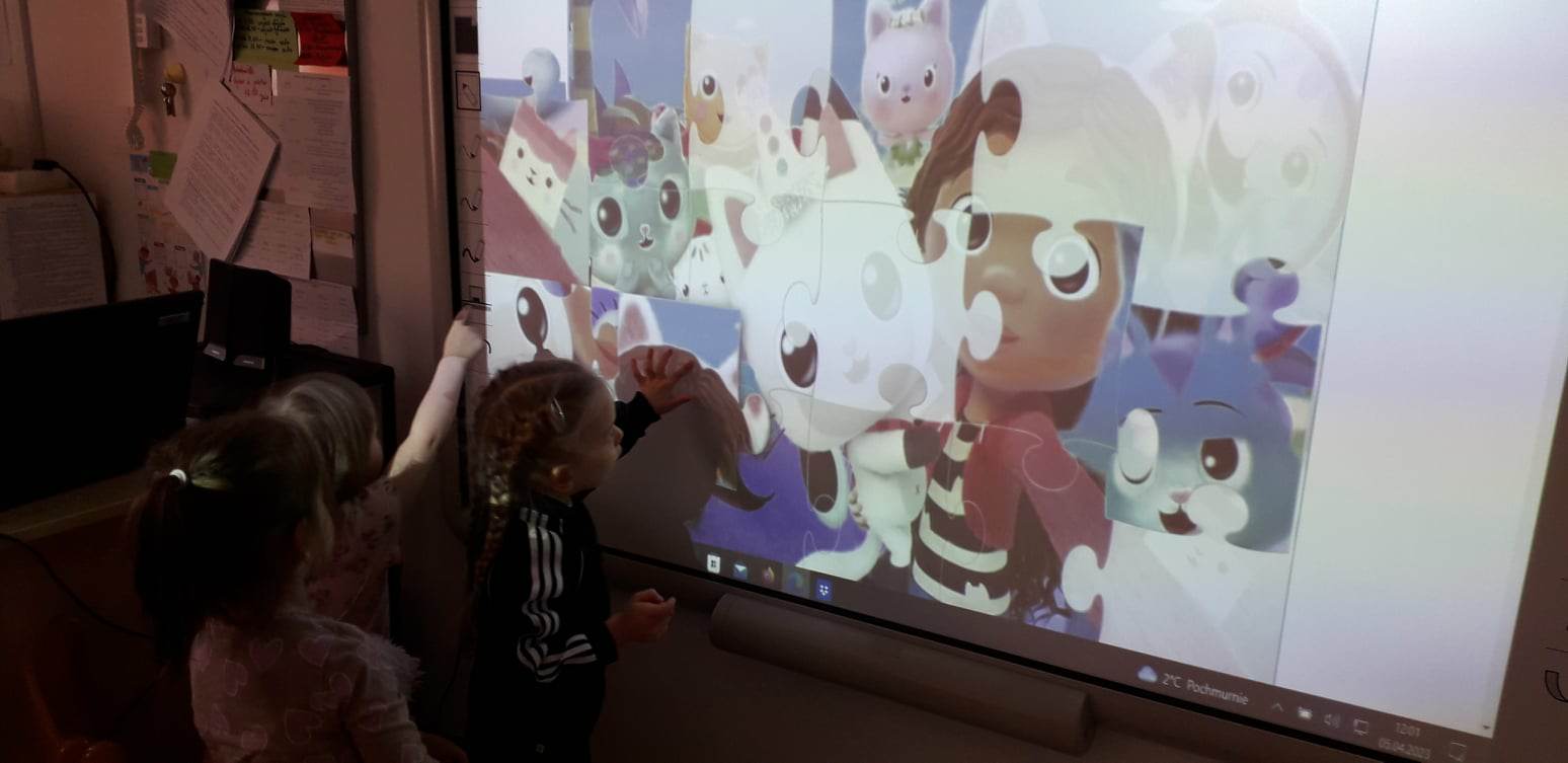 Podczas codziennych zajęć edukacyjnych przedszkolaki z grupy ,,Niezapominajki” korzystają z nowoczesnych zdobyczy techniki. Tablica interaktywna służy dzieciom do sprawdzania zdobytych wcześniej wiadomości i zdobywania nowych informacji. Tablica działa jak duży ekran, który jest obsługiwany za pomocą dotyku. Dzieci rysują, piszą, zaznaczają, przeciągają obrazy na wyznaczone miejsce. Przedszkolaki bardzo chętnie korzystają z tej pomocy, są aktywne i zaangażowane w wykonanie każdego zadania. Uczą się cierpliwości podczas czekania na swoją kolej, szybko zapamiętują nowe wiadomości. Oprócz wartości edukacyjnych praca z tablicą interaktywną daje dzieciom możliwość aktywnej rozrywki, pozwala poznać to, czego nie mogą zobaczyć w rzeczywistości, rozwija umiejętność wykonywania złożonych poleceń, które aktywizują myślenie abstrakcyjne, pozwala również samodzielnie rozwiązywać zadania z bezzwłoczną oceną, często w postaci dźwiękowej lub wzrokowo – ruchowej.