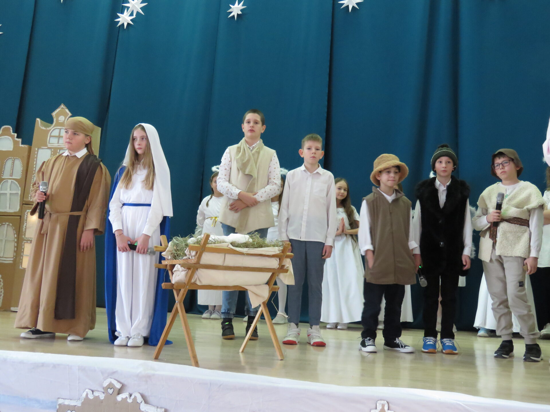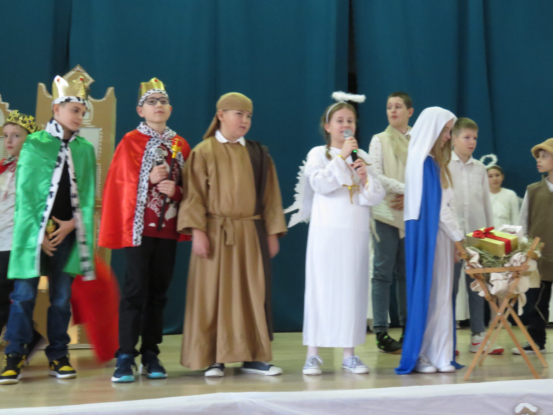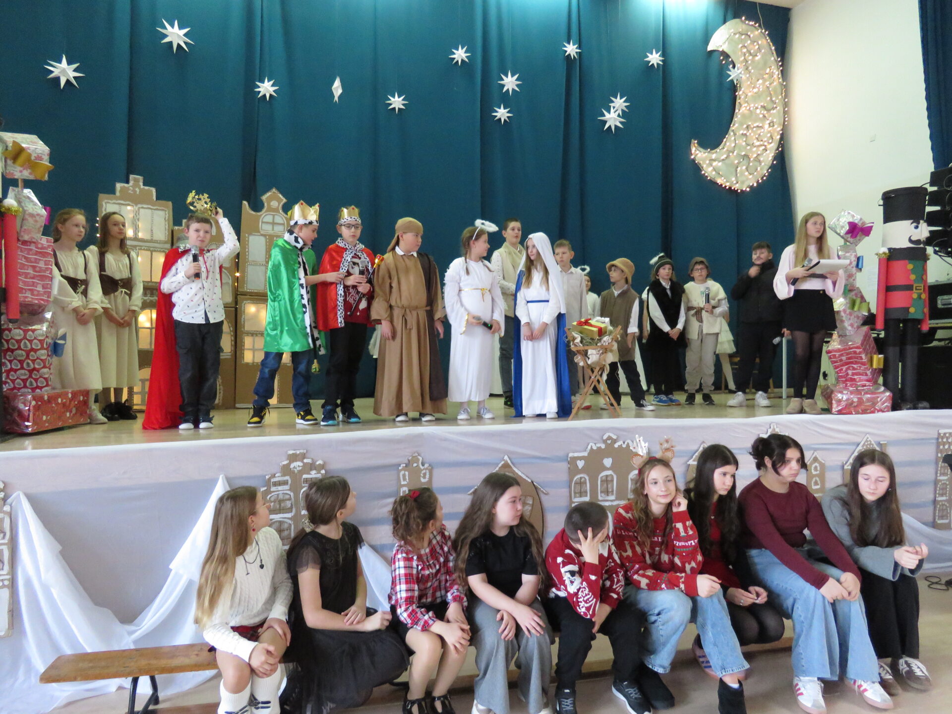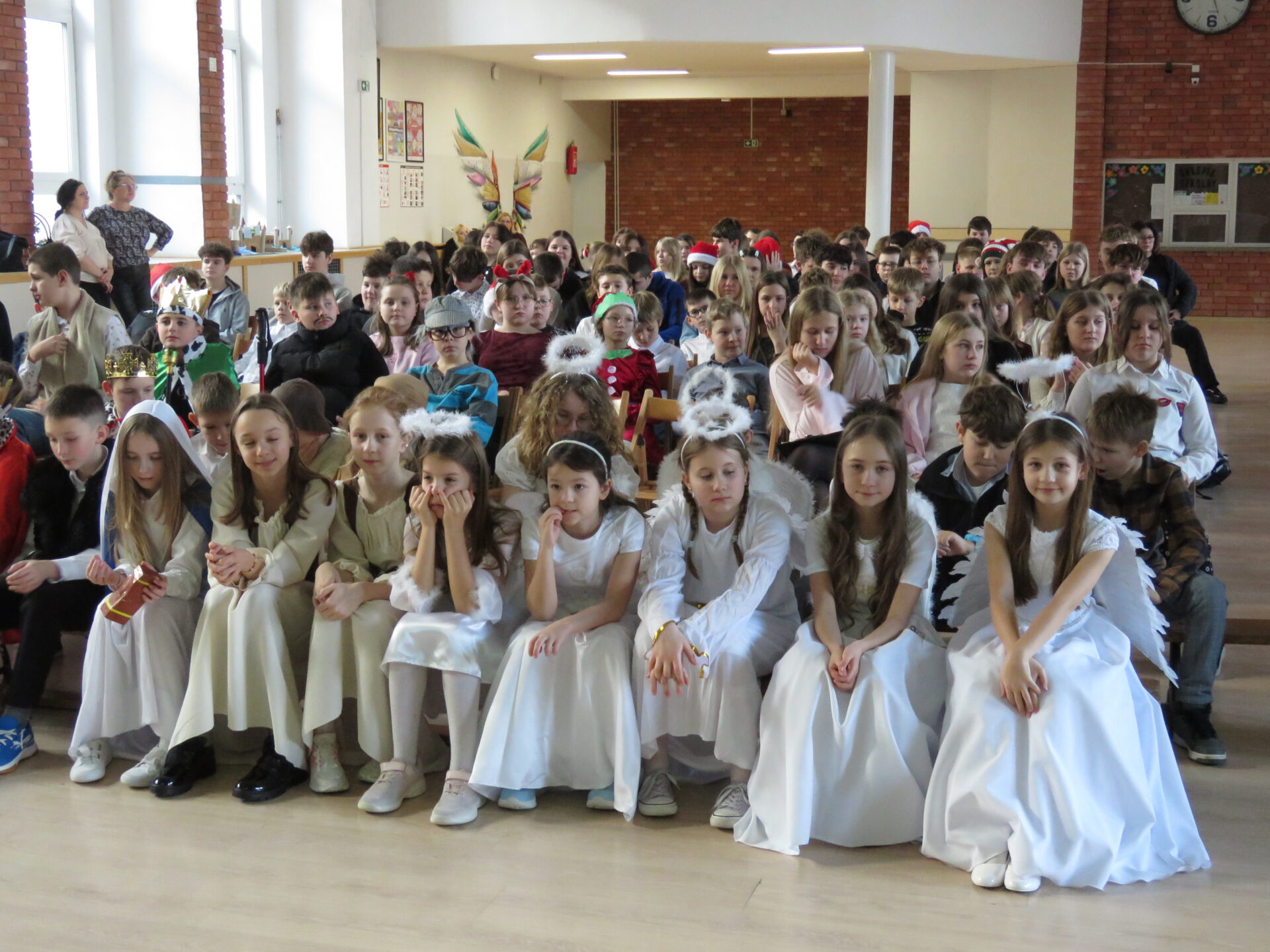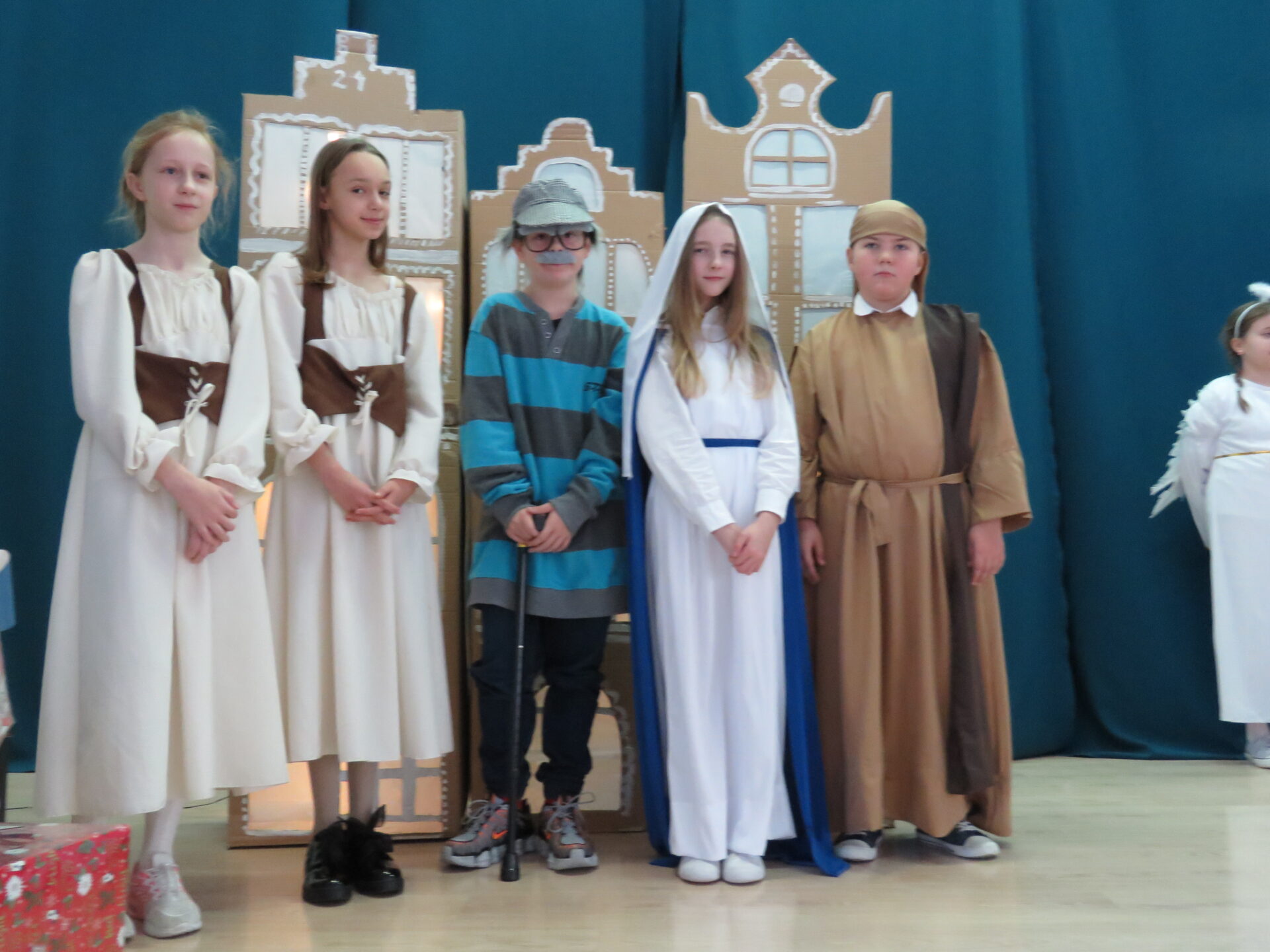 Grupa wiekowa klas 4-8 obejrzała dzisiaj spektakl teatralny przygotowany przez klasę 5d i 6c pod kierunkiem Pani Marioli Kulpy oraz Jasełka – spektakl słowno – muzyczny w wykonaniu dzieci klasy 4b. Uczniów przygotowała Pani Nela Żak. Kolędy i piosenki świąteczne usłyszeliśmy w wykonaniu szkolnego zespołu muzycznego pod kierunkiem Pani Mileny Wiśniewskiej.