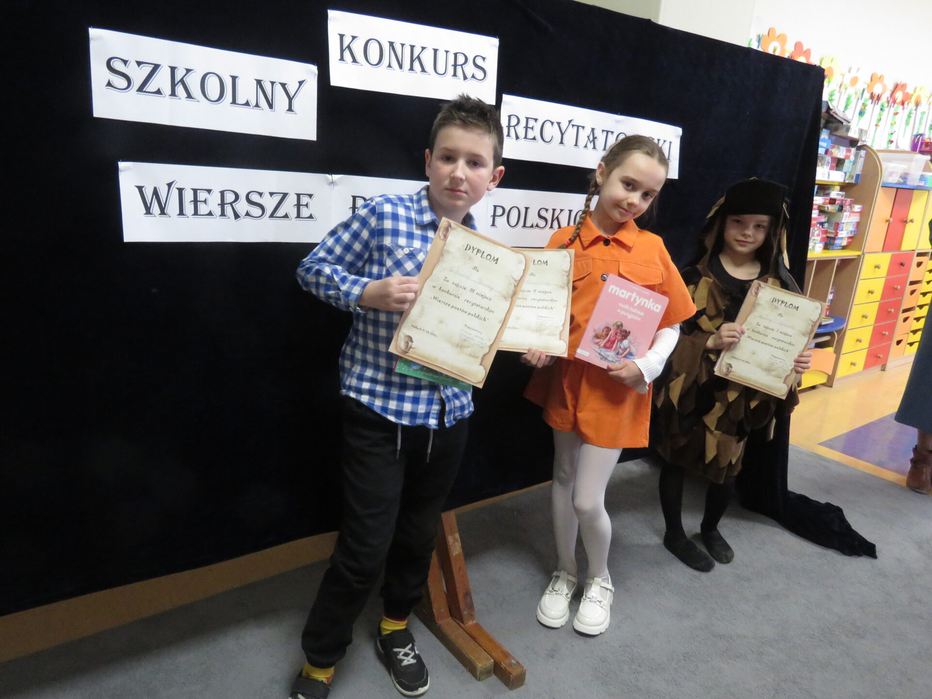 Za nami kolejne zmagania recytatorskie. Jak co roku 1 kwietnia odbył się konkurs recytatorski dla dzieci z klas młodszych. Wydarzenie to stanowiło nie tylko okazję do zaprezentowania talentów recytatorskich, ale było także wyrazem troski o piękno języka ojczystego i rozwijania wrażliwości na słowo mówione. Było wielu chętnych, którzy chcieli podzielić się swoimi umiejętnościami i z wielką przyjemnością słuchaliśmy wierszy w wykonaniu uczniów klas 1-3. Przed publicznością zaprezentowała się 19 uczestników. I choć oczywiście były miejsca na podium, jak w każdym konkursie, to nagrodzeni zostali wszyscy uczestnicy, ponieważ każdy wykazał się chęcią, odwagą, talentem a wszyscy razem sprawili, że konkurs ten stał się pięknym spektaklem poetyckim wierszy dla dzieci i nie tylko. Brawo !