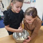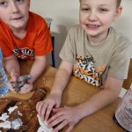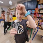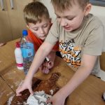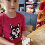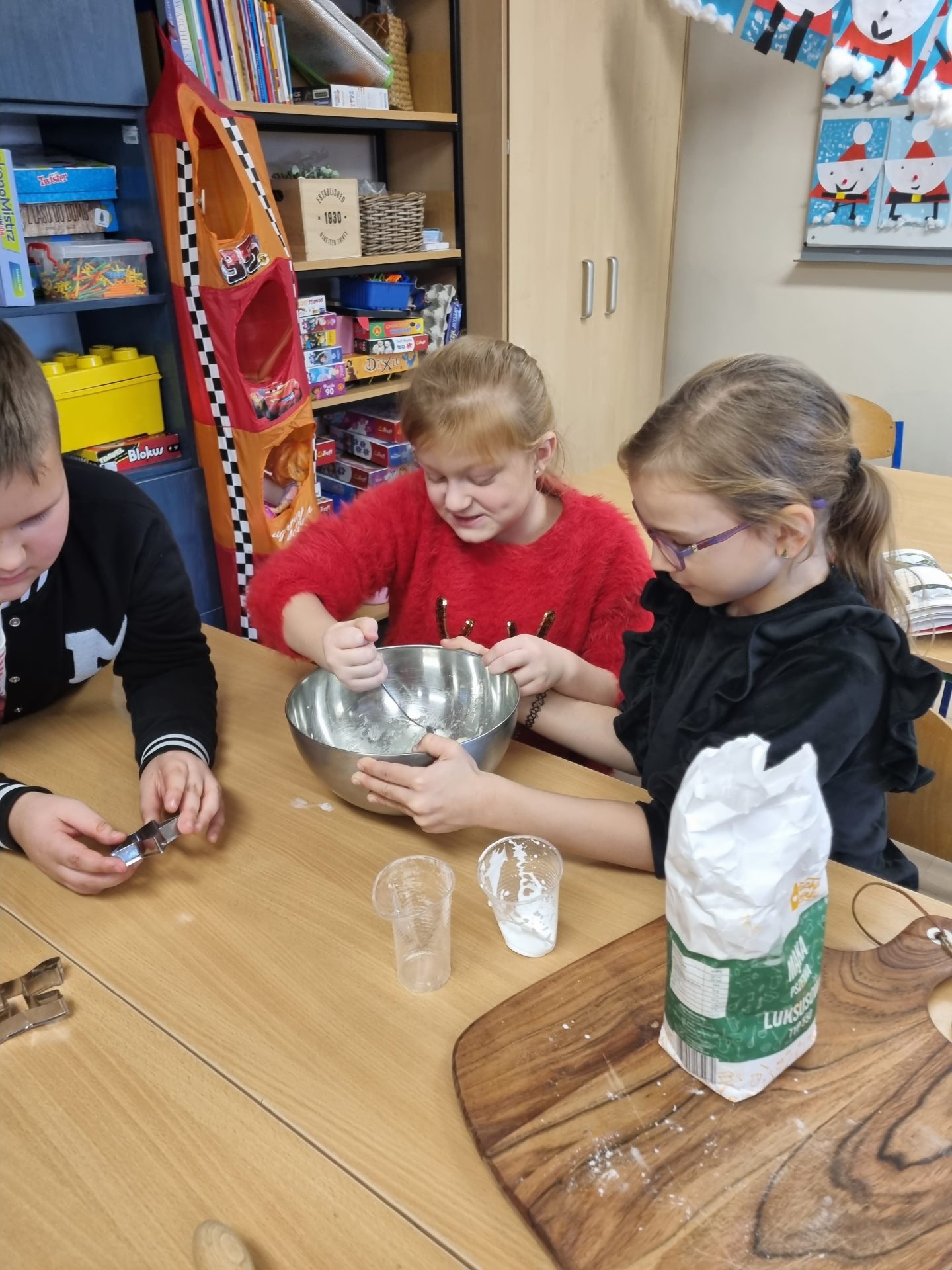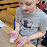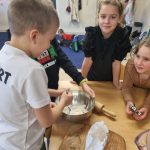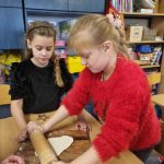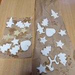 Inną ciekawą pracą, którą wykonywały dzieci były dekoracje z masy porcelanowej, która barwą i przenikalnością światła przypomina prawdziwą porcelanę. Masa porcelanowa jest prosta w wykonaniu i bardzo efektywna. Dzieci otrzymały przepis i samodzielnie odmierzały proporcje, następnie mieszały i wyrabiały masę. Wałkowały i wycinały za pomocą foremek świąteczne wzory, kształty, kiedy już każdy miał swoją zawieszkę wyciętą, uczniowie uporządkowali swoje stanowiska pracy i wspólnie przygotowaliśmy stoliki do kolejnego etapu czyli dekorowania za pomocą cekinów, brokatu oraz farb. W tej pracy każdy etap był dla dzieci fascynujący, a dzieci już dopytywały, kiedy będziemy mogli powtórzyć zajęcia. Masy plastyczne niezwykle pobudzają kreatywność i wyobraźnię dzieci, rozwijają umiejętności manualne, trenując motorykę małą i przede wszystkim są świetną zabawą dla dzieci oraz stanowią znakomitą okazję do współpracy w zespole.