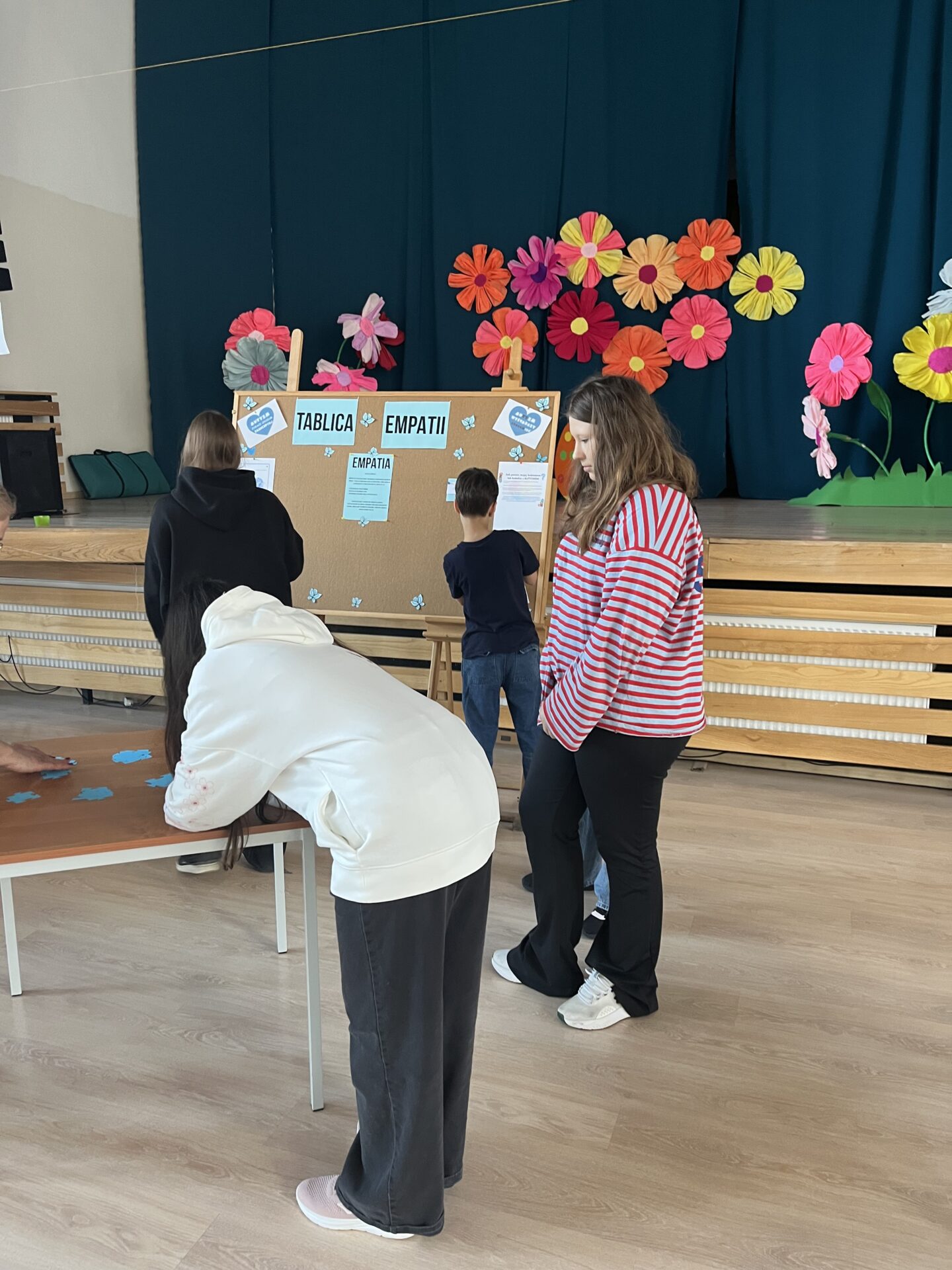 Dodatkowo na auli przez dostępna była „Tablica Empatii”. Uczniowie przypinali do niej papierowe puzzle, na których zapisywali swoje pomysły na to, jak wspierać osoby, które czują się przytłoczone, a także sposoby radzenia sobie z trudnymi emocjami. Powstała w ten sposób wyjątkowa przestrzeń pełna życzliwości, dobrych rad i pozytywnych komunikatów. Tablica stała się symbolem współpracy oraz dowodem na to, że nawet drobne gesty mogą mieć ogromne znaczenie.