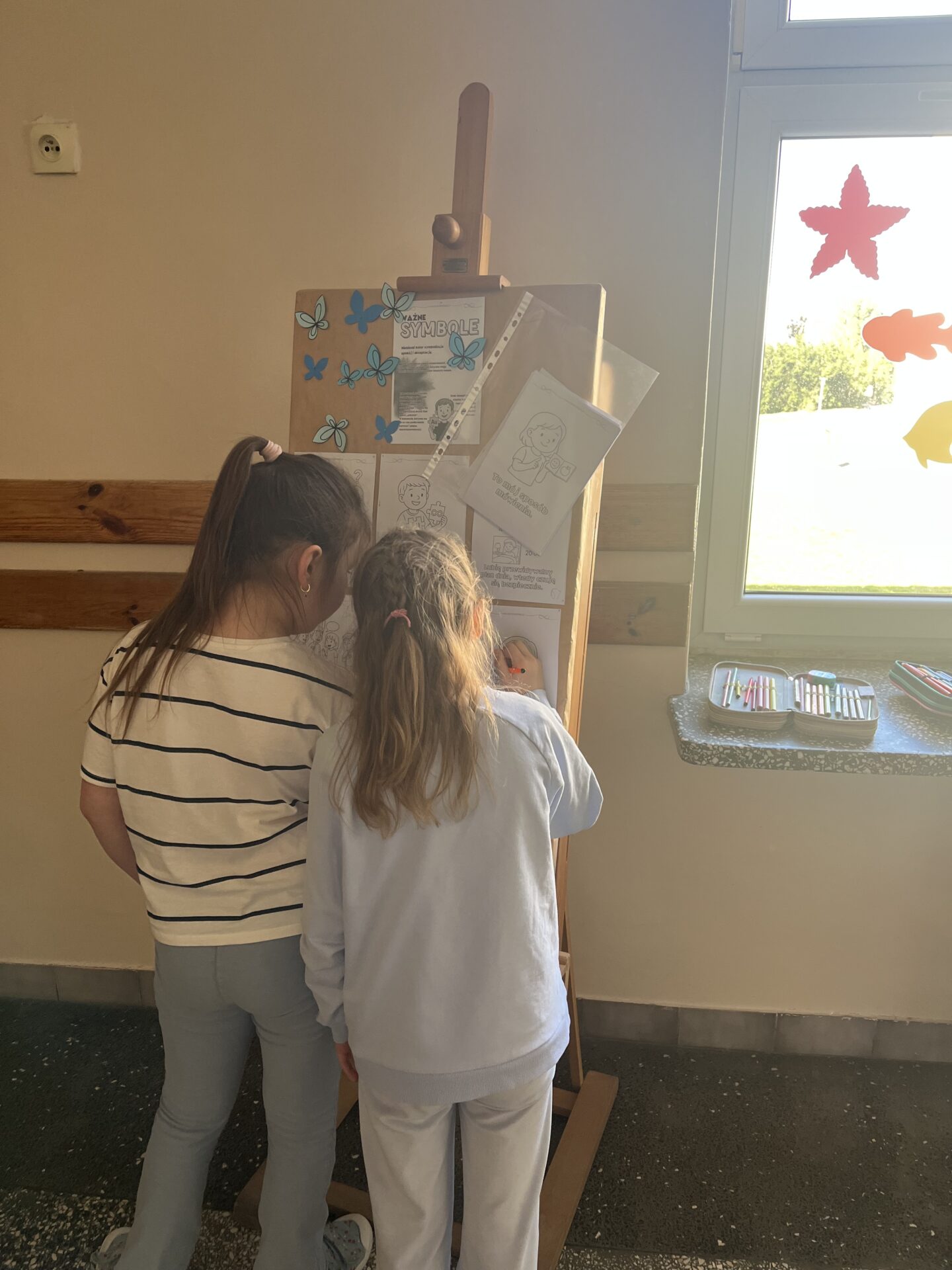 Dla uczniów klas 1–3 przygotowano interaktywną gazetkę edukacyjną. Na korytarzach pojawiły się sztalugi z kolorowankami i materiałami informacyjnymi, dzięki którym najmłodsi mogli poprzez zabawę poznawać najważniejsze informacje dotyczące spektrum autyzmu. Taka forma nauki pozwoliła dzieciom w przystępny i angażujący sposób zrozumieć, czym jest autyzm oraz jak okazywać wsparcie i akceptację innym.
