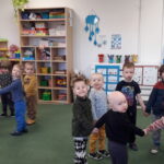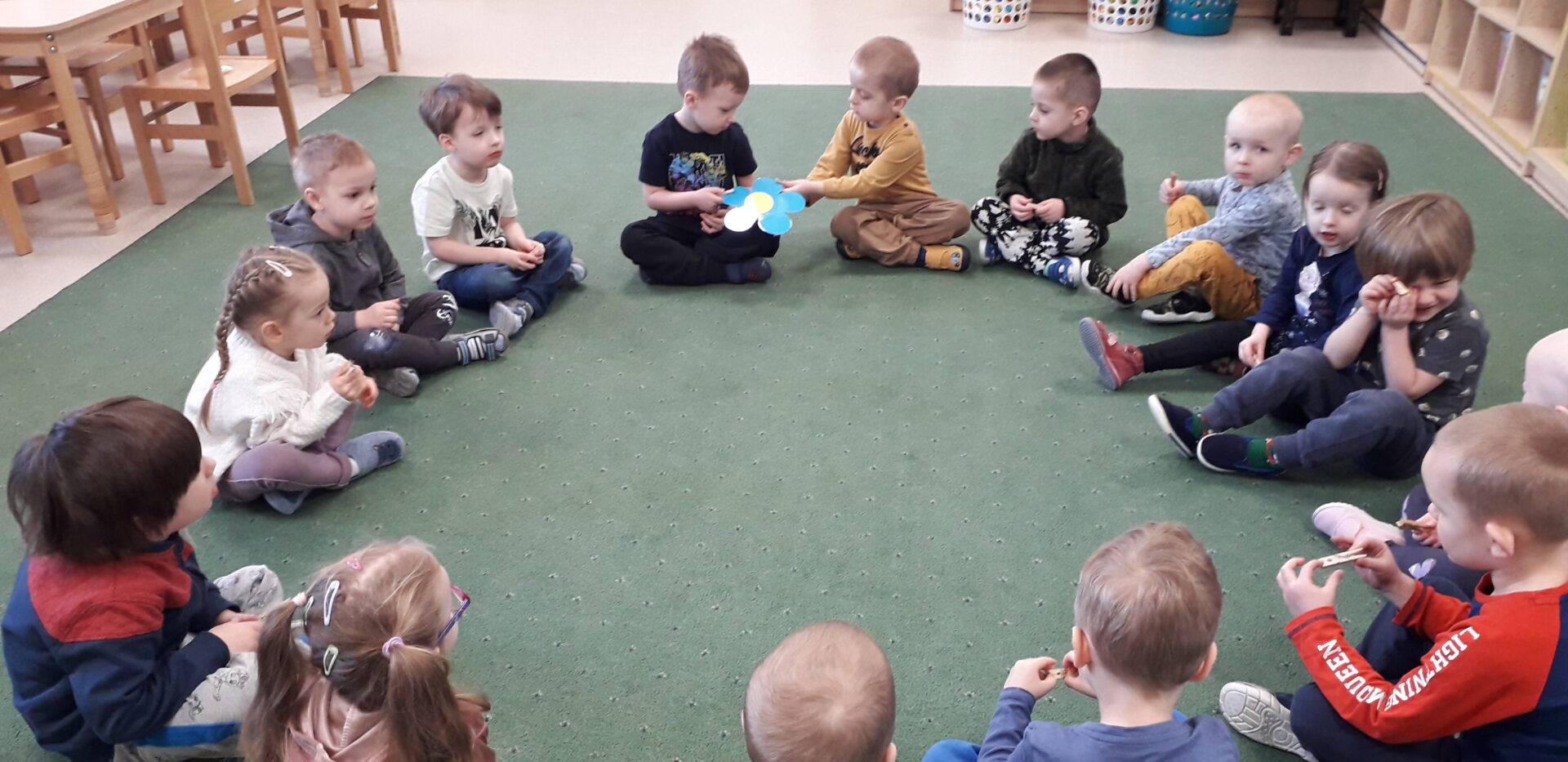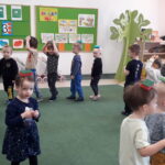 Zadaniem dzieci było podawanie koledze lub koleżance za pomocą klamerki symbolu grupy – niezapominajki. Następnie przyszedł czas na poranną gimnastykę z wykorzystaniem nietypowego środka dydaktycznego – małej gąbeczki. Zamiast informacji słownej przedszkolaki otrzymały wskazówki w formie kart aktywności fizycznej oraz obrazków z instrukcją ustawiania się. Również podczas zabawy muzycznej dzieci nie korzystały z typowego instrumentu perkusyjnego, a jego odpowiednika – woreczka z papierową kulką w środku.