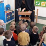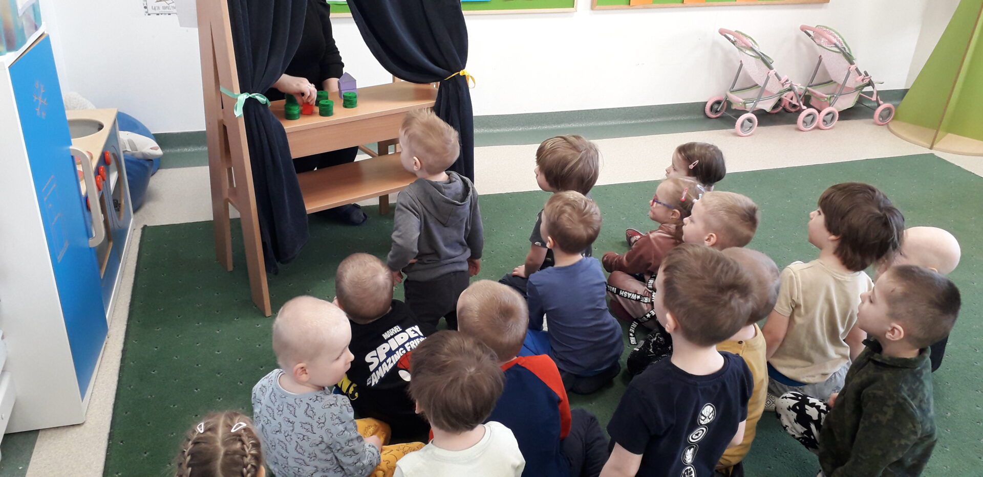 Zwieńczeniem nietypowych zajęć było przedstawienie ,,Czerwony Kapturek”, podczas którego tradycyjne pacynki zostały zastąpione drewnianymi klockami symbolizującymi występujące w spektaklu postaci. Po obejrzeniu przedstawienia, każde dziecko miało okazję wypowiedzieć się do ,,mikrofonu” wykonanego z owiniętego folią aluminiową wałka do ciasta.