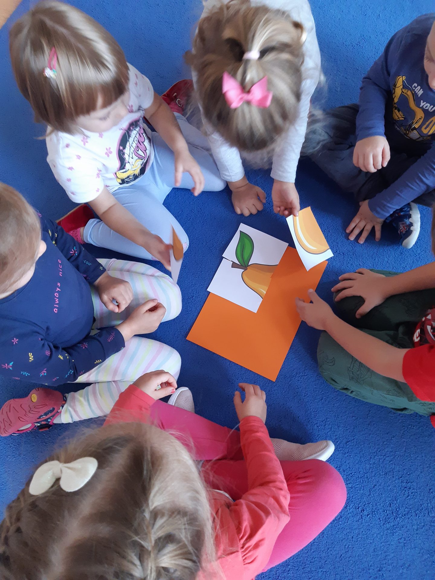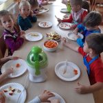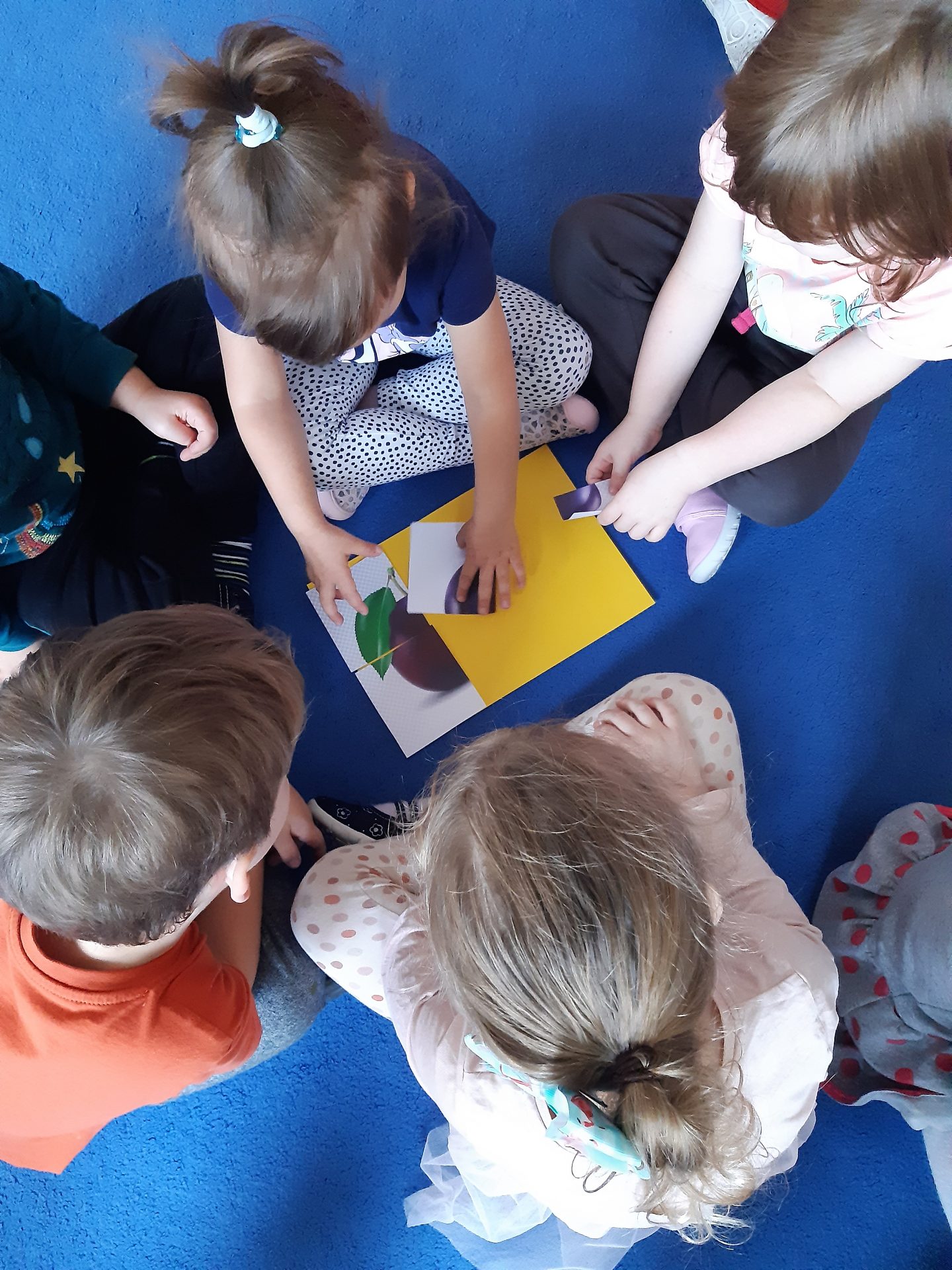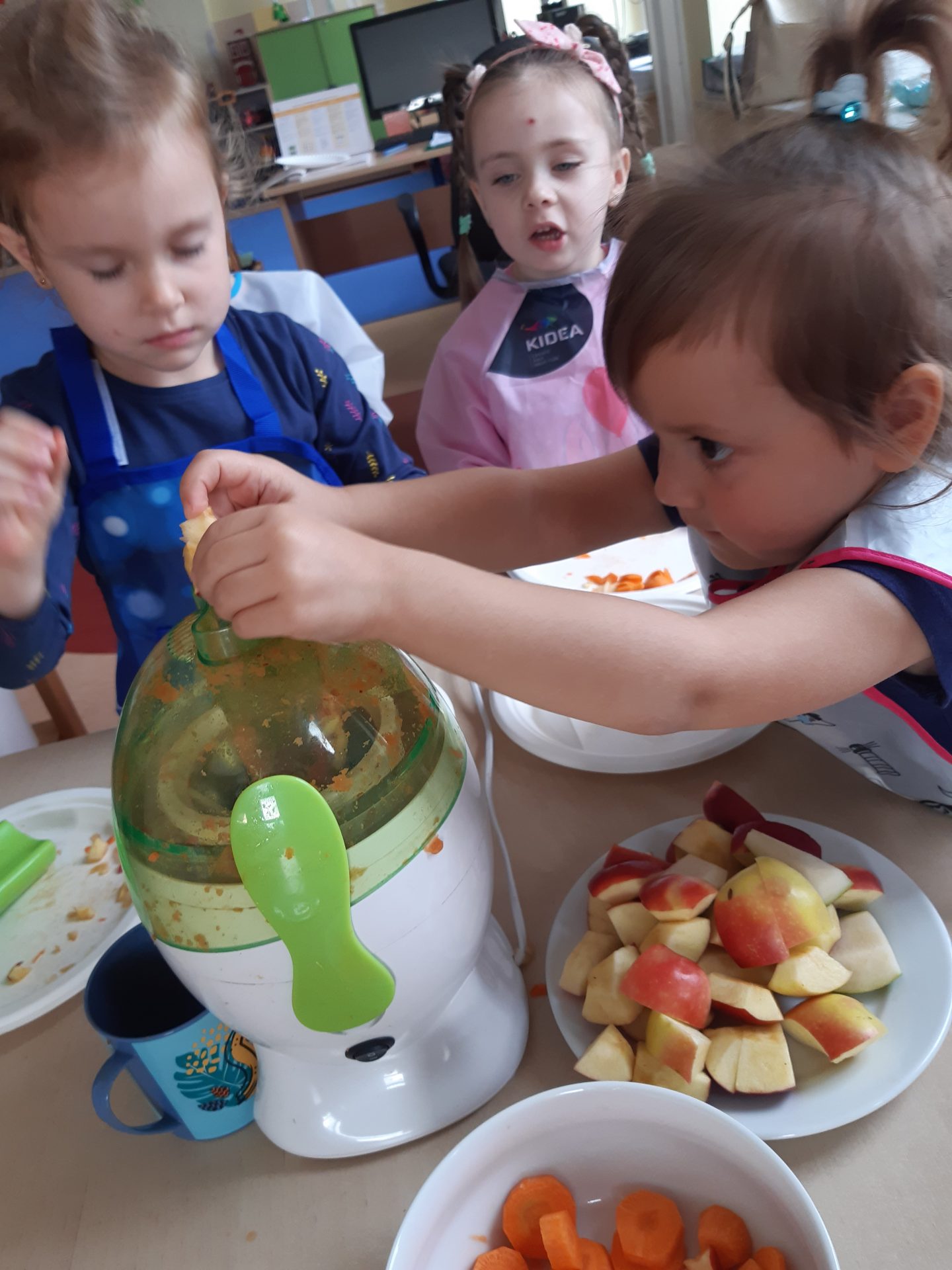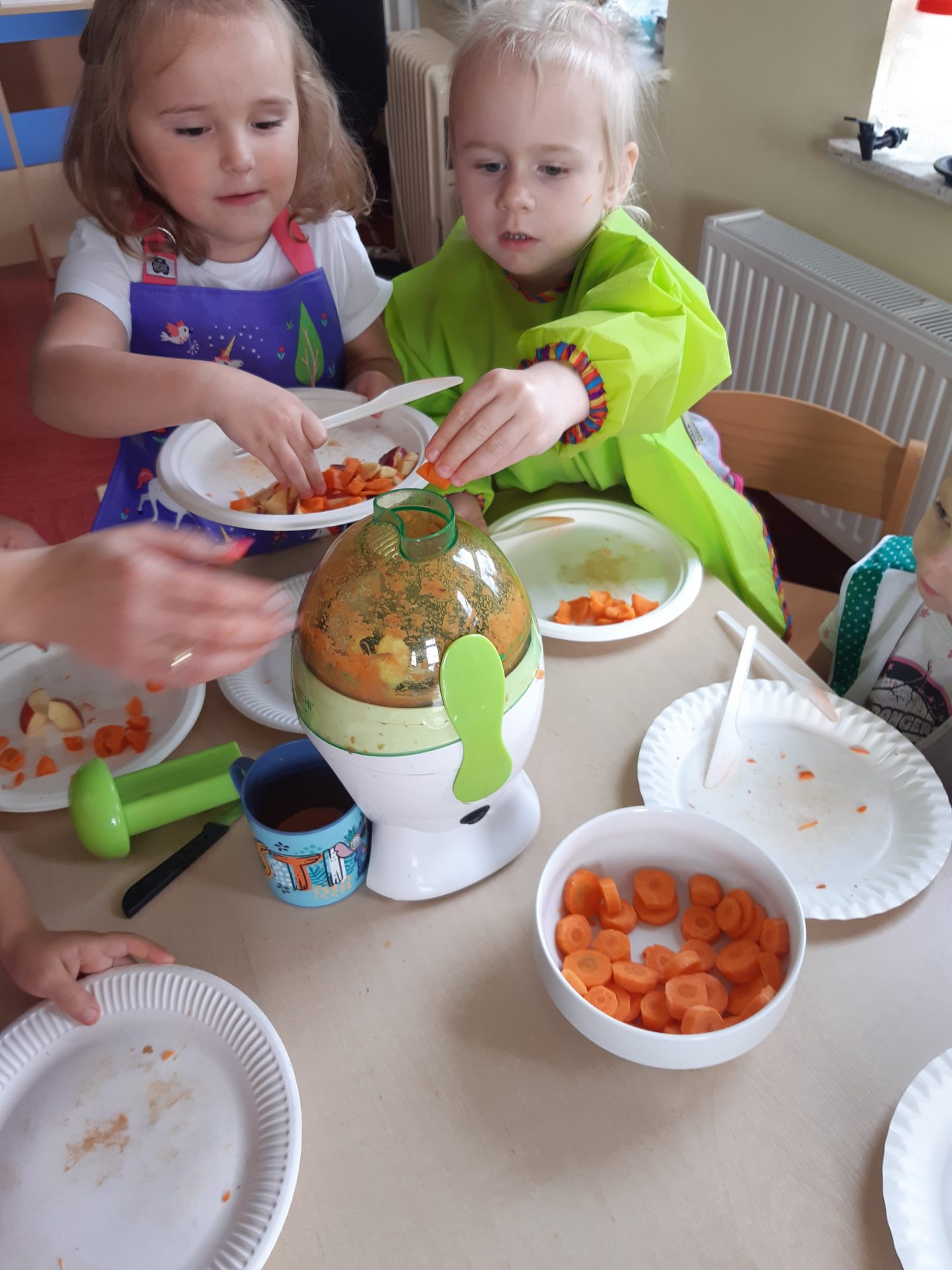 Grupa „Motylki” w minionym tygodniu skupiła się na zrozumieniu znaczenia zdrowego odżywiania, kształtowała w sobie postawę prozdrowotną, a szczególną uwagę zwróciła na rozpoznawaniu owoców i warzyw ich walorów zdrowotnych, oraz miejsca, w którym rosną czyli: sadzie i ogrodzie. Dzieci klasyfikowały i eksponowały za pomocą dwóch zbiorów owoce i warzywa, przeliczały je poprawnie, oceniały czego jest więcej, a czego mniej, dzieliły wyrazy na sylaby i określały liczbę sylab. Rozpoznawały owoce lub warzywa za pomocą zmysłu dotyku i smaku. W celu zapamiętania popularnych owoców, dzieci zostały podzielone na trzy grupy, i z pociętego obrazka na cztery części miały za zadanie ułożyć owoc, nazwać go i opowiedzieć o nim kilka słów, np. jaki ma kolor, jaki ma smak, gdzie rośnie? Doskonaliły prawidłowe trzymanie nożyczek, wycinając historyjkę obrazkową i za pomocą kodu kropkowego układały w odpowiedniej kolejności przyklejając ją na czystą kartkę. Nauczyły się pięknie śpiewać słowa piosenki” W starym ogrodzie”, a także ilustrować ruchem jej tekst oraz tańczyć w parach. Zapoznały się ze sprzętem jakim jest sokowirówka, poznały jej zastosowanie oraz zasady przestrzegania zasad bezpiecznego korzystania z urządzeń elektrycznych, które zostało dokładnie omówione przez nauczyciela. Następnie umyły ręce, założyły fartuszki i samodzielnie z użyciem noża plastikowego pokroiły jabłko i marchewkę. Z pomocą Pań zrobiły sok owocowy, który potem mogły spróbować, zwracając uwagę na kulturalne zachowanie się przy stole, używając także magicznych słów: „proszę”, „dziękuję”.