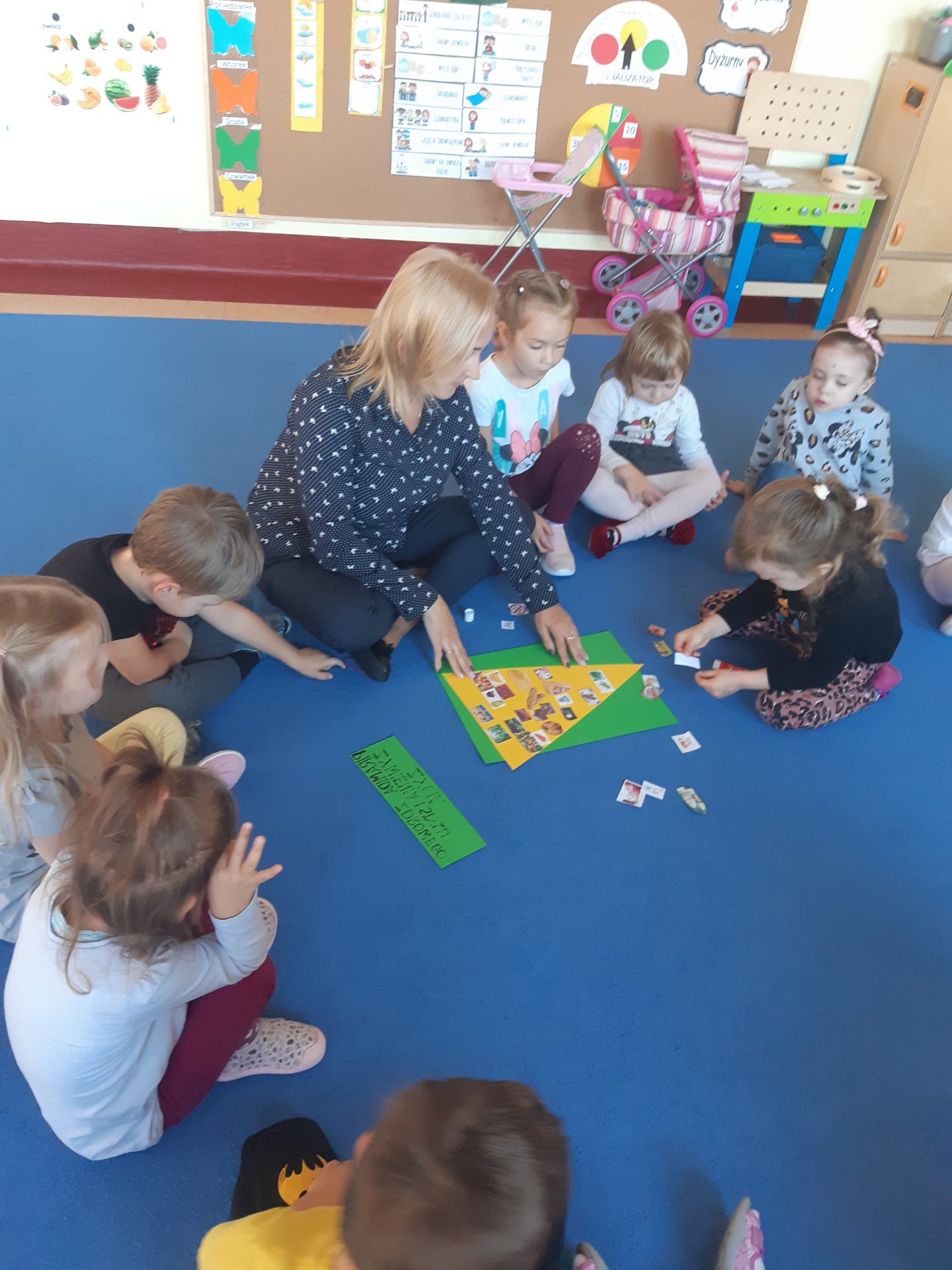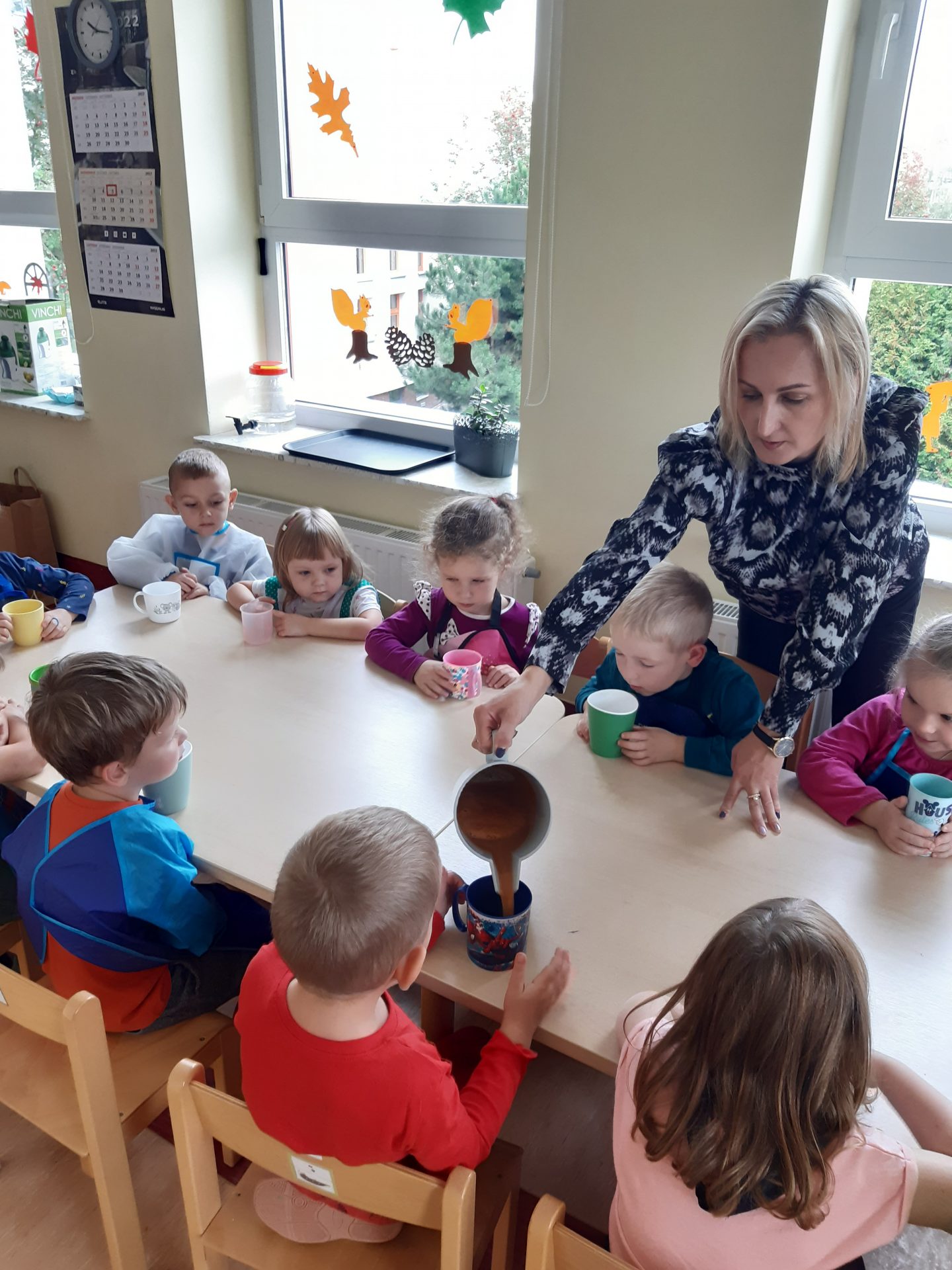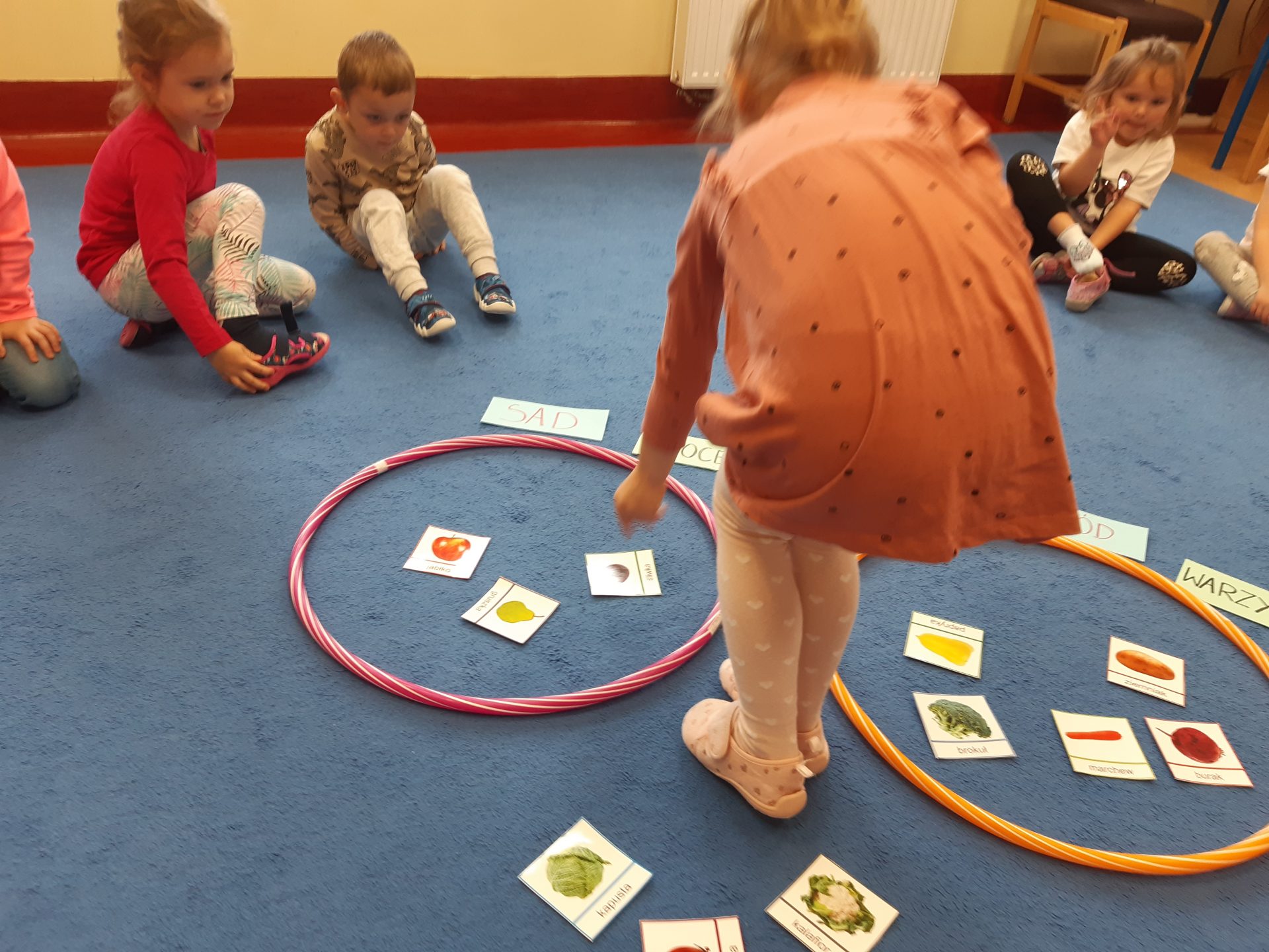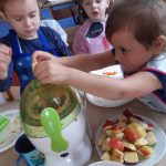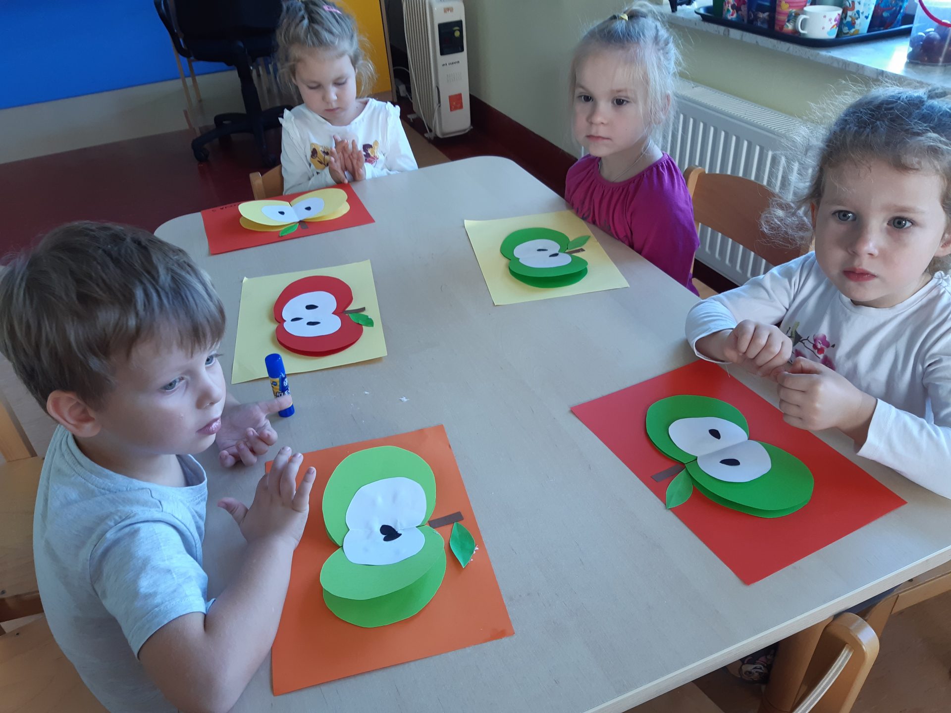 Grupa „Motylki” w minionym tygodniu skupiła się na zrozumieniu znaczenia zdrowego odżywiania, kształtowała w sobie postawę prozdrowotną, a szczególną uwagę zwróciła na rozpoznawaniu owoców i warzyw ich walorów zdrowotnych, oraz miejsca, w którym rosną czyli: sadzie i ogrodzie. Dzieci klasyfikowały i eksponowały za pomocą dwóch zbiorów owoce i warzywa, przeliczały je poprawnie, oceniały czego jest więcej, a czego mniej, dzieliły wyrazy na sylaby i określały liczbę sylab. Rozpoznawały owoce lub warzywa za pomocą zmysłu dotyku i smaku. W celu zapamiętania popularnych owoców, dzieci zostały podzielone na trzy grupy, i z pociętego obrazka na cztery części miały za zadanie ułożyć owoc, nazwać go i opowiedzieć o nim kilka słów, np. jaki ma kolor, jaki ma smak, gdzie rośnie? Doskonaliły prawidłowe trzymanie nożyczek, wycinając historyjkę obrazkową i za pomocą kodu kropkowego układały w odpowiedniej kolejności przyklejając ją na czystą kartkę. Nauczyły się pięknie śpiewać słowa piosenki” W starym ogrodzie”, a także ilustrować ruchem jej tekst oraz tańczyć w parach. Zapoznały się ze sprzętem jakim jest sokowirówka, poznały jej zastosowanie oraz zasady przestrzegania zasad bezpiecznego korzystania z urządzeń elektrycznych, które zostało dokładnie omówione przez nauczyciela. Następnie umyły ręce, założyły fartuszki i samodzielnie z użyciem noża plastikowego pokroiły jabłko i marchewkę. Z pomocą Pań zrobiły sok owocowy, który potem mogły spróbować, zwracając uwagę na kulturalne zachowanie się przy stole, używając także magicznych słów: „proszę”, „dziękuję”.
