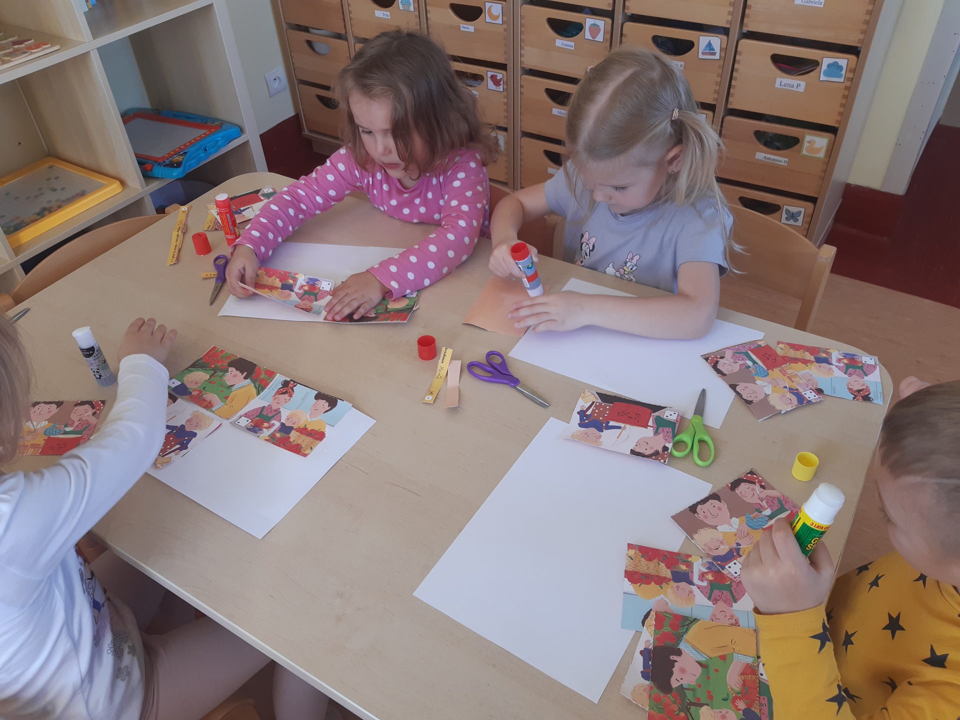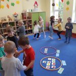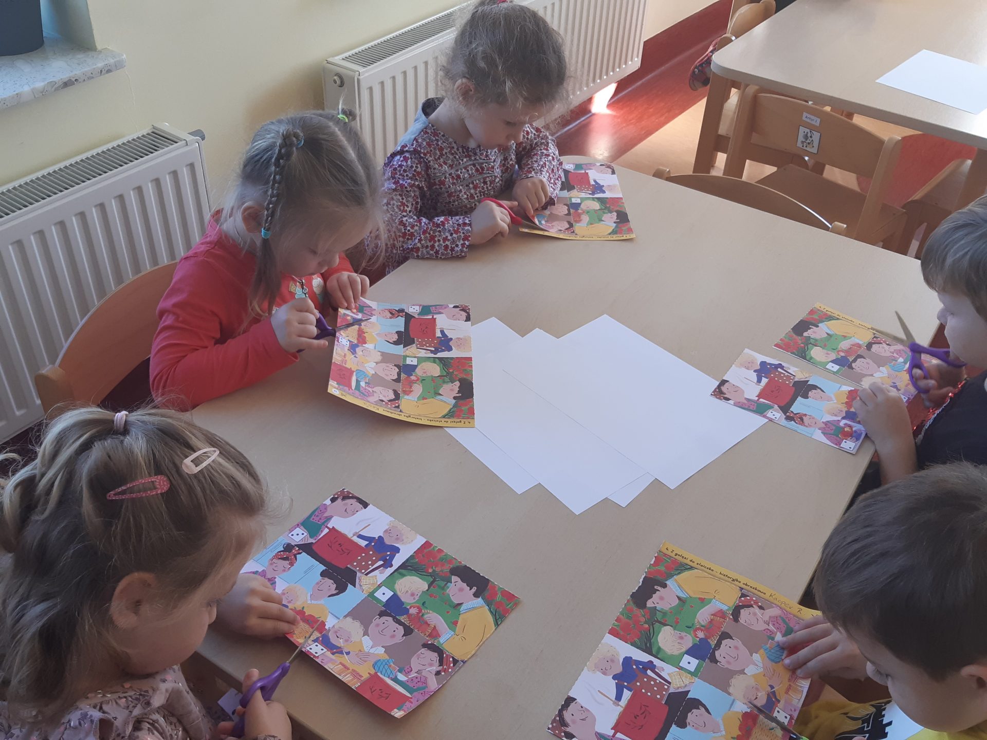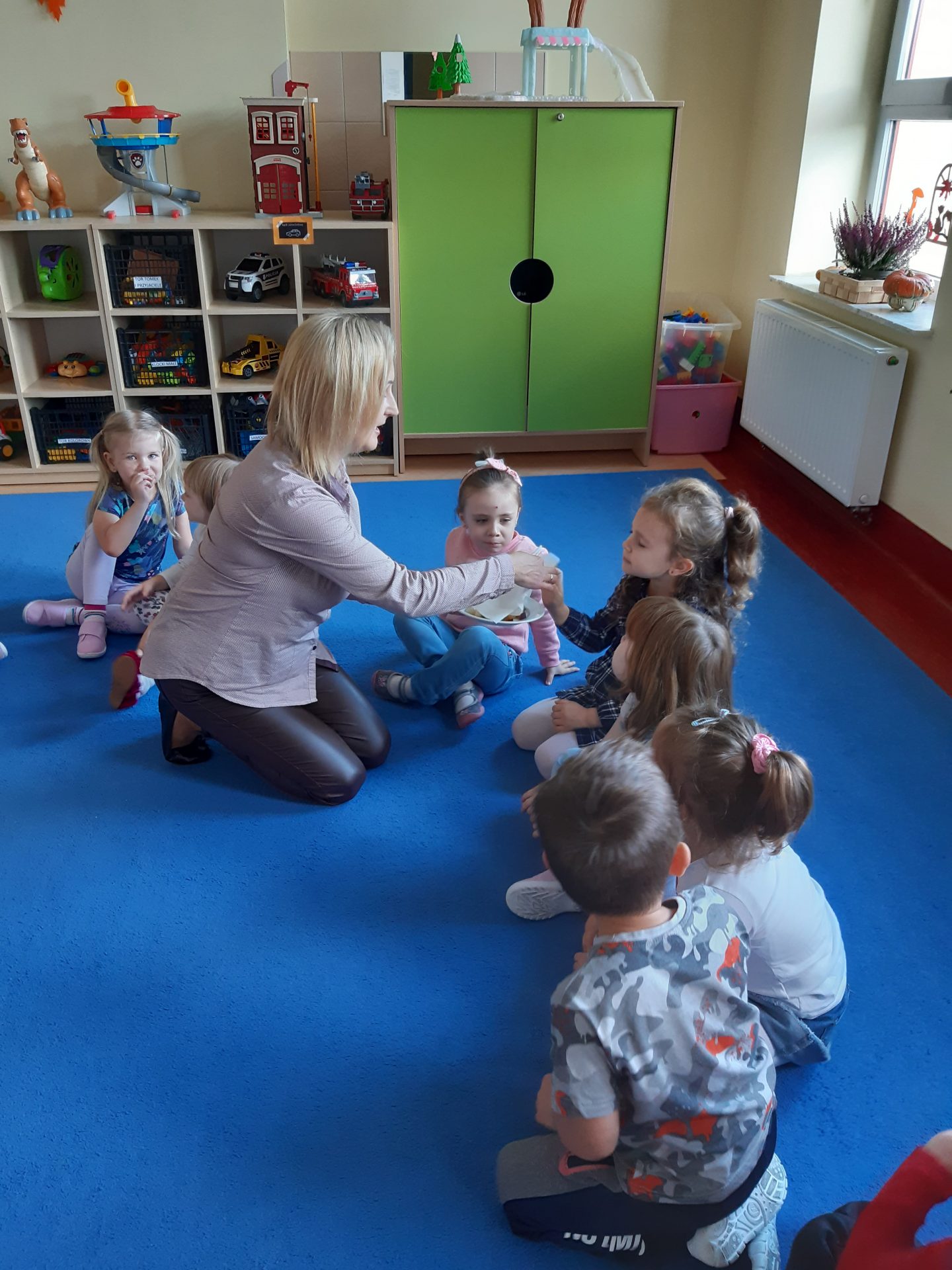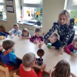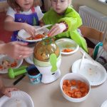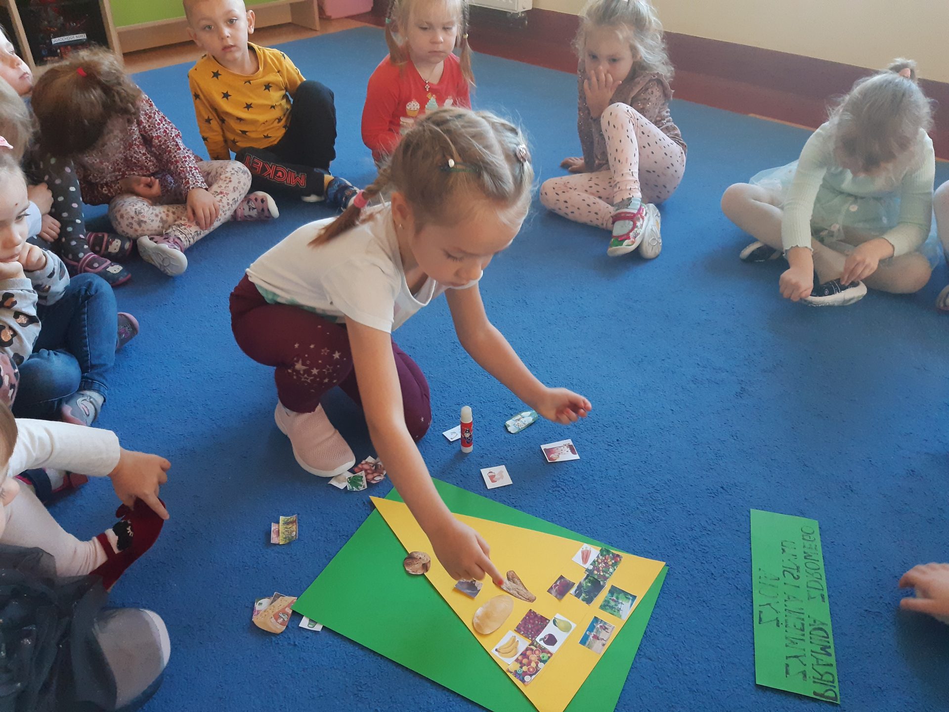 Grupa „Motylki” w minionym tygodniu skupiła się na zrozumieniu znaczenia zdrowego odżywiania, kształtowała w sobie postawę prozdrowotną, a szczególną uwagę zwróciła na rozpoznawaniu owoców i warzyw ich walorów zdrowotnych, oraz miejsca, w którym rosną czyli: sadzie i ogrodzie. Dzieci klasyfikowały i eksponowały za pomocą dwóch zbiorów owoce i warzywa, przeliczały je poprawnie, oceniały czego jest więcej, a czego mniej, dzieliły wyrazy na sylaby i określały liczbę sylab. Rozpoznawały owoce lub warzywa za pomocą zmysłu dotyku i smaku. W celu zapamiętania popularnych owoców, dzieci zostały podzielone na trzy grupy, i z pociętego obrazka na cztery części miały za zadanie ułożyć owoc, nazwać go i opowiedzieć o nim kilka słów, np. jaki ma kolor, jaki ma smak, gdzie rośnie? Doskonaliły prawidłowe trzymanie nożyczek, wycinając historyjkę obrazkową i za pomocą kodu kropkowego układały w odpowiedniej kolejności przyklejając ją na czystą kartkę. Nauczyły się pięknie śpiewać słowa piosenki” W starym ogrodzie”, a także ilustrować ruchem jej tekst oraz tańczyć w parach. Zapoznały się ze sprzętem jakim jest sokowirówka, poznały jej zastosowanie oraz zasady przestrzegania zasad bezpiecznego korzystania z urządzeń elektrycznych, które zostało dokładnie omówione przez nauczyciela. Następnie umyły ręce, założyły fartuszki i samodzielnie z użyciem noża plastikowego pokroiły jabłko i marchewkę. Z pomocą Pań zrobiły sok owocowy, który potem mogły spróbować, zwracając uwagę na kulturalne zachowanie się przy stole, używając także magicznych słów: „proszę”, „dziękuję”.