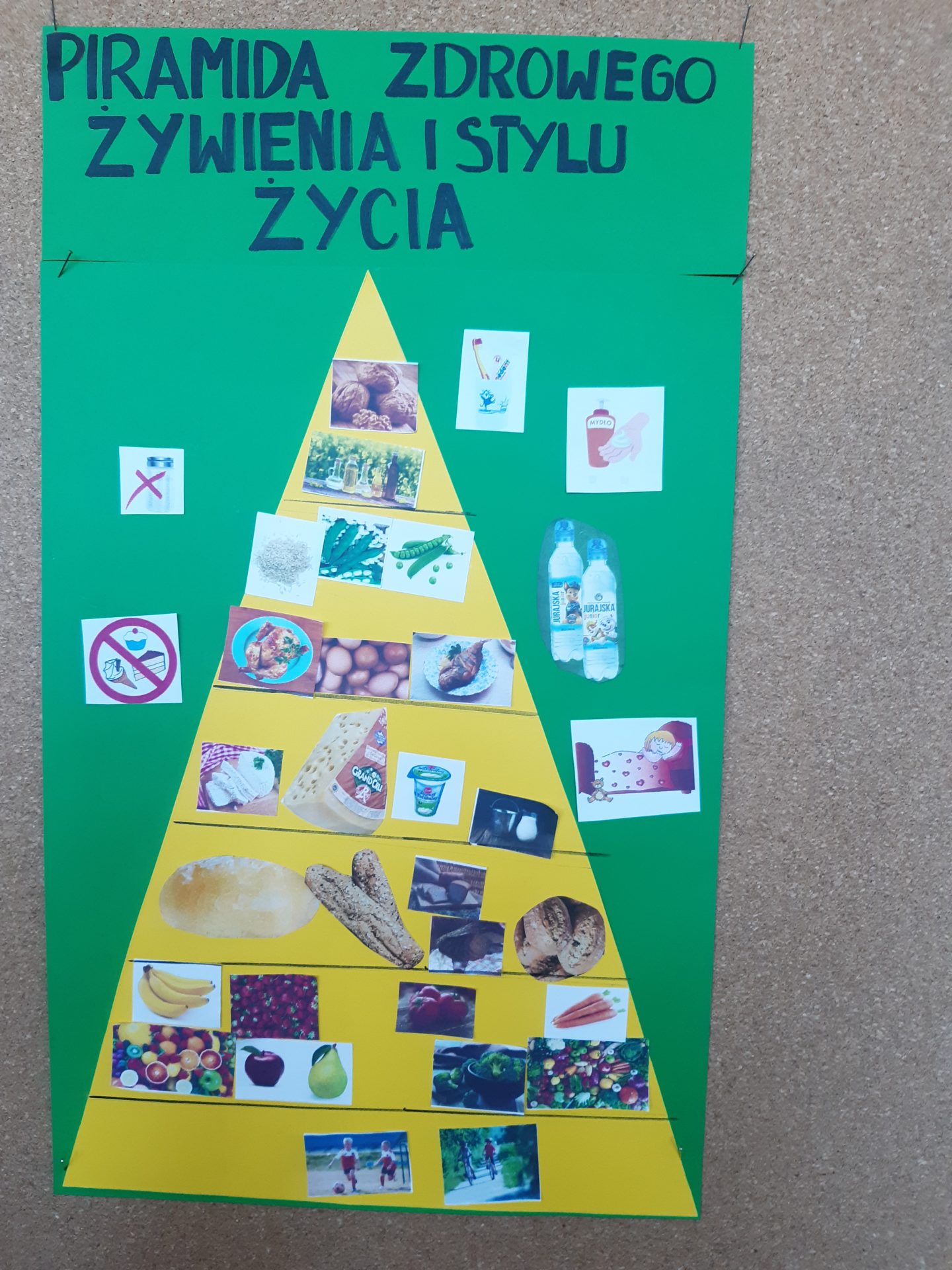 Podsumowaniem całego tygodnia było wykonanie „Piramidy zdrowego żywienia i stylu życia”. Najpierw zostały omówione zasady zdrowego i racjonalnego odżywiania ,poznanie składników odżywczych, jaką pełnią funkcję w organizmie, w jakich produktach jest ich najwięcej, a następnie przełożenie tego na ilustrację.