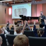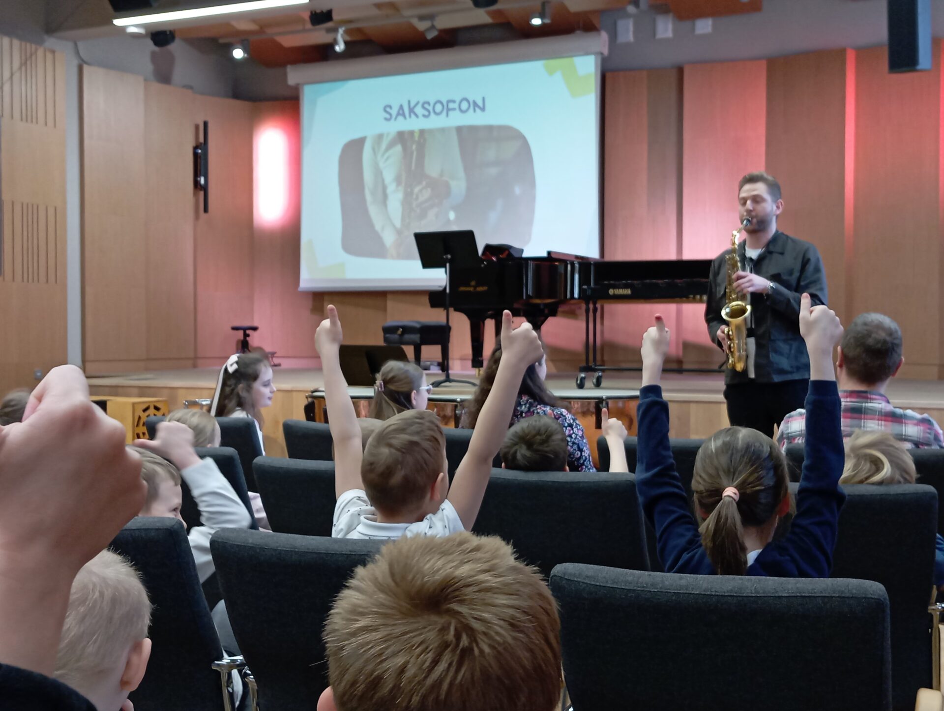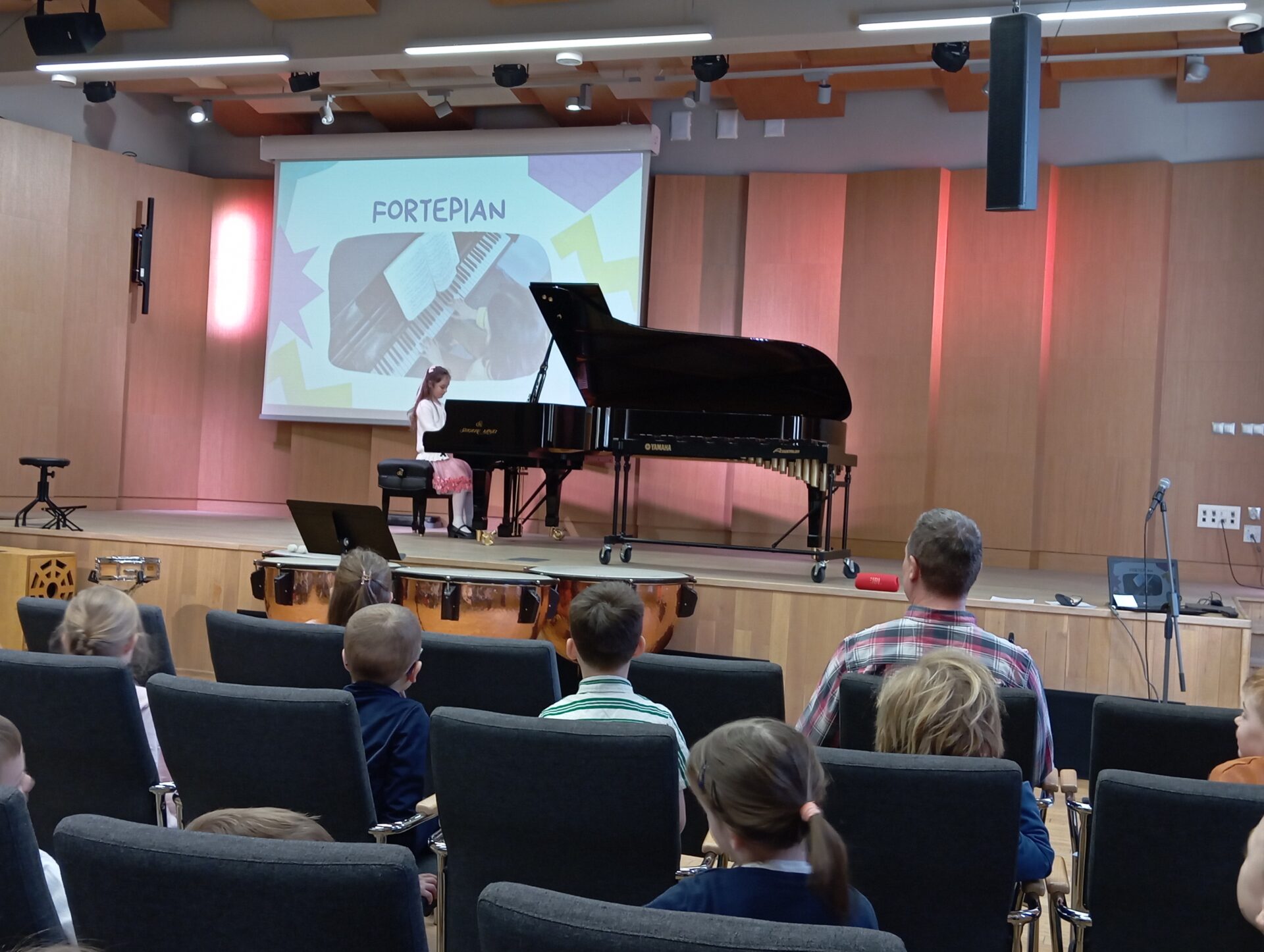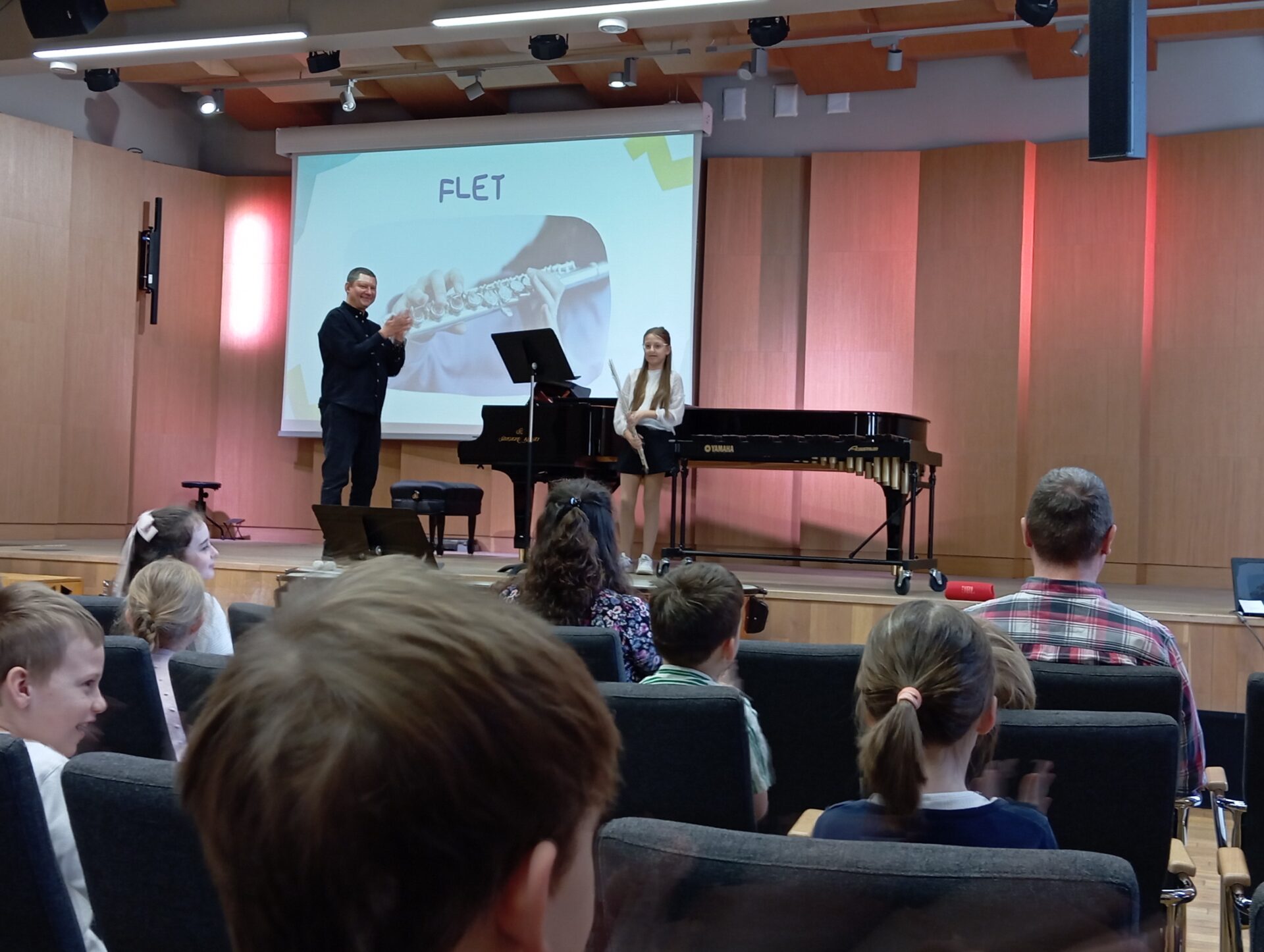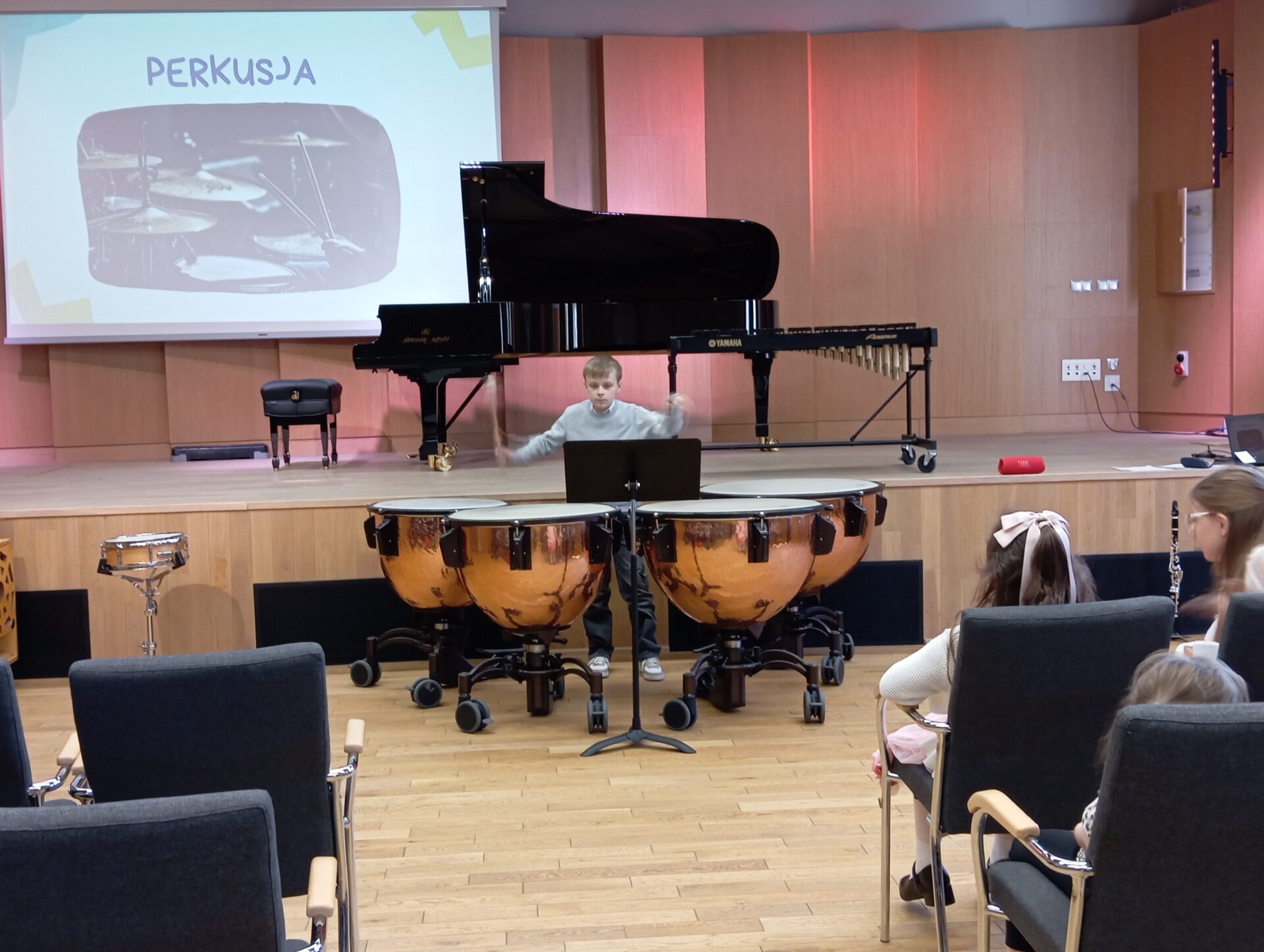 Sala koncertowa wypełniła się nie tylko dźwiękami, ale przede wszystkim dziecięcą ciekawością! Podczas spotkania nauczyciele oraz uczniowie szkoły w niezwykle barwny sposób opowiadali o swoich instrumentach. Dowiedzieliśmy się, dlaczego wiolonczela ma „nóżkę”, jak powstaje dźwięk w trąbce i czy fortepian faktycznie ma w środku małe młoteczki.