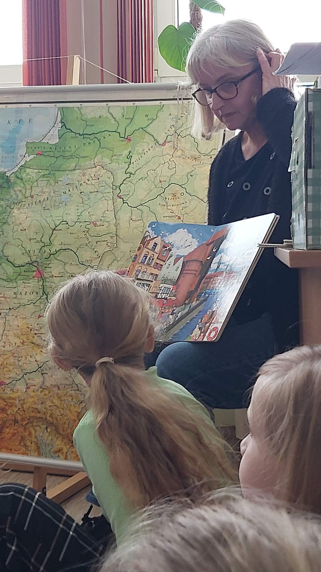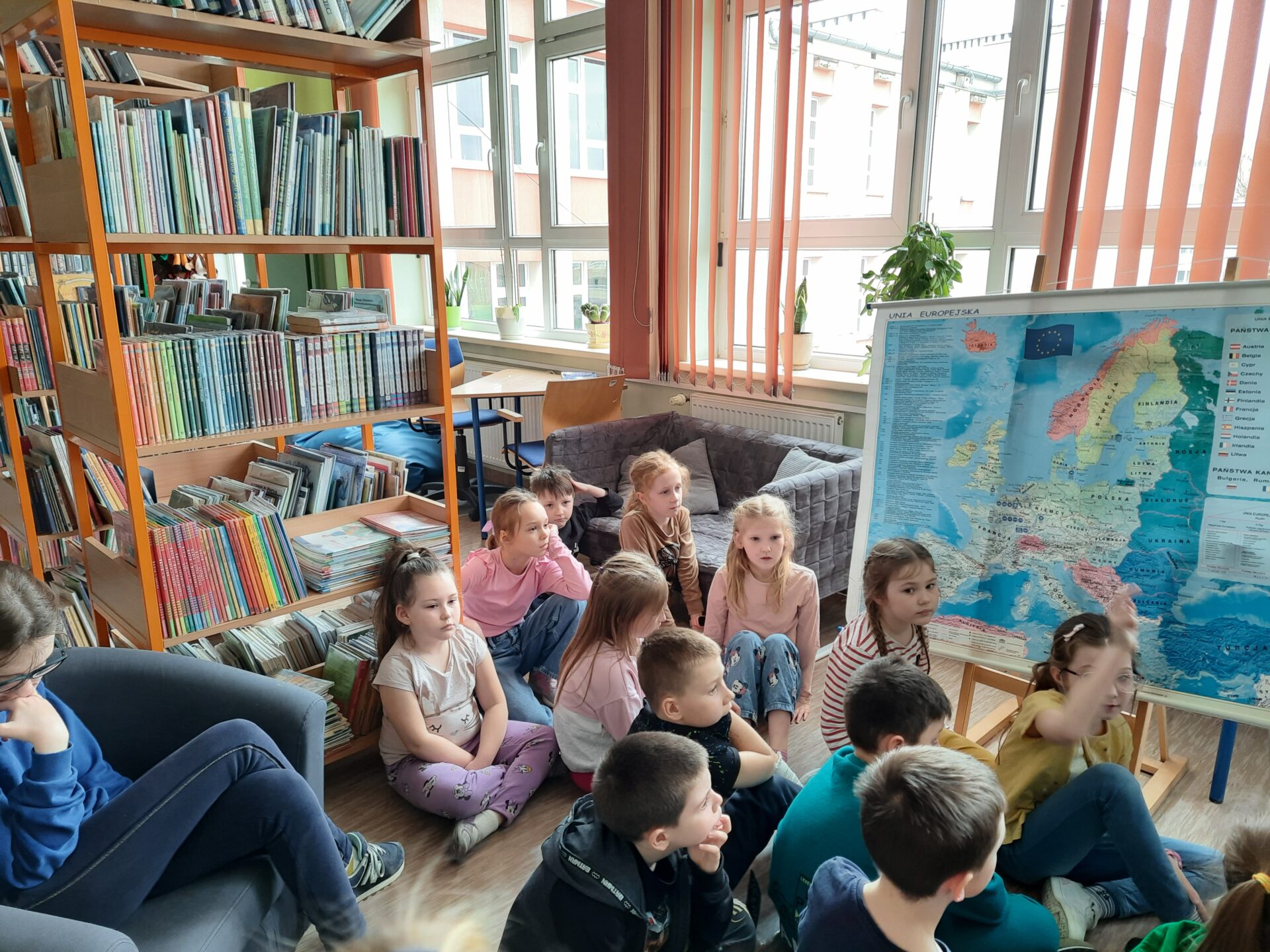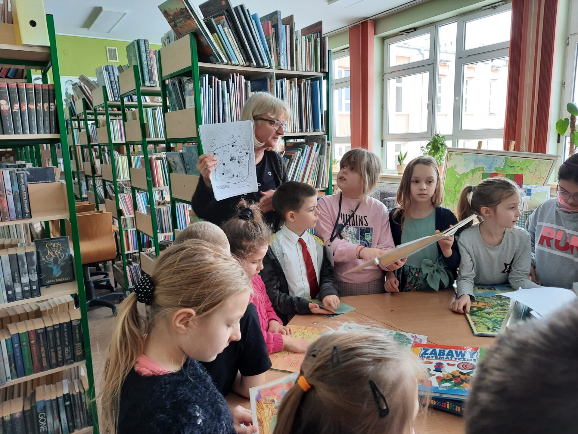 Podczas pierwszej wizyty Pani bibliotekarka – Beata Olińska zaproponowała młodym czytelnikom podróż śladem polskich legend. Uczniowie z wielkim zainteresowaniem słuchali opowieści o Warsie i Sawie, Panu Twardowskim, Smoku Wawelskim, Bazyliszku oraz Księciu Popielu, którego zjadły myszy….Wielkim zainteresowaniem cieszyła się mapa Polski, na której uczniowie wyszukiwali miejsca, gdzie toczyła się akcja wybranych opowieści.