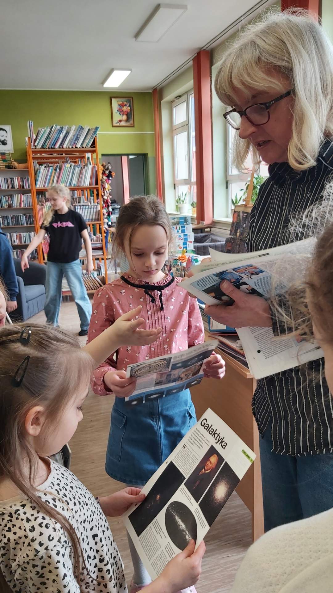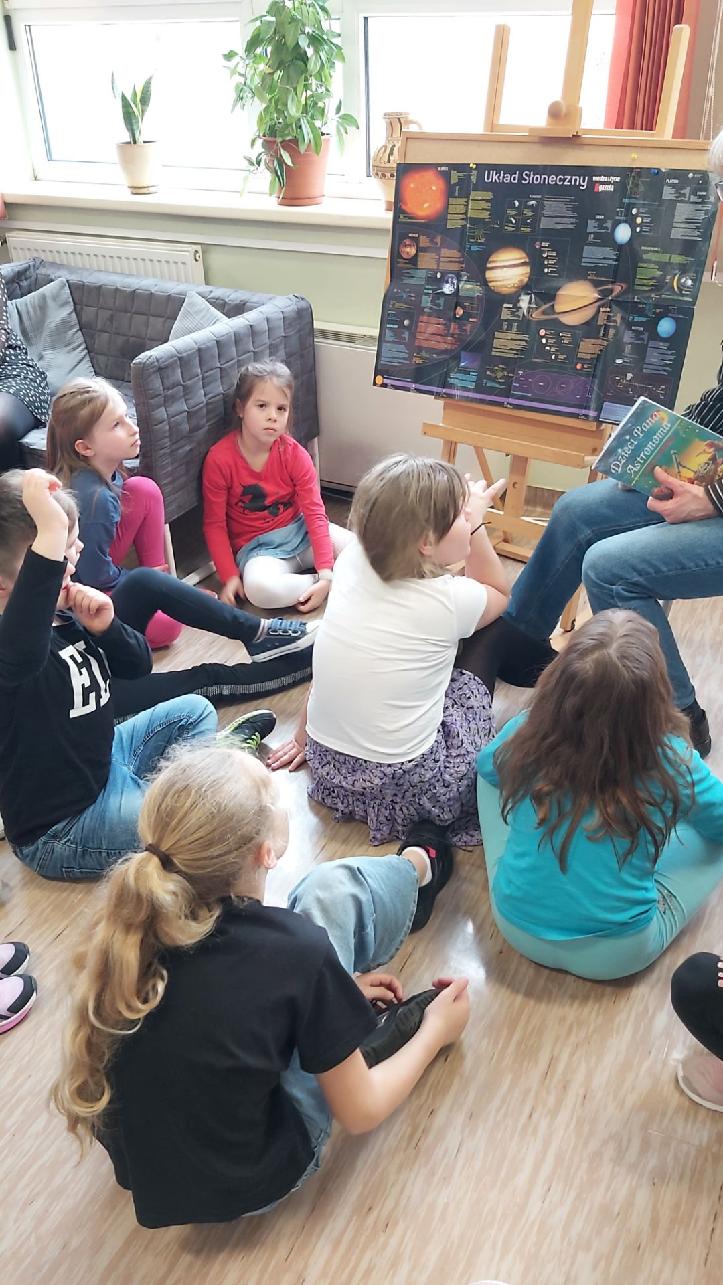 Tematem kolejnego spotkania były podróże w kosmos. Uczniowie poznali wiele ciekawostek na temat przestrzeni kosmicznej i ciał niebieskich. Pani Beata zaprezentowała plansze, na których uczniowie rozpoznawali znane im gwiazdozbiory, planety i przeróżne ciała niebieskie.