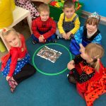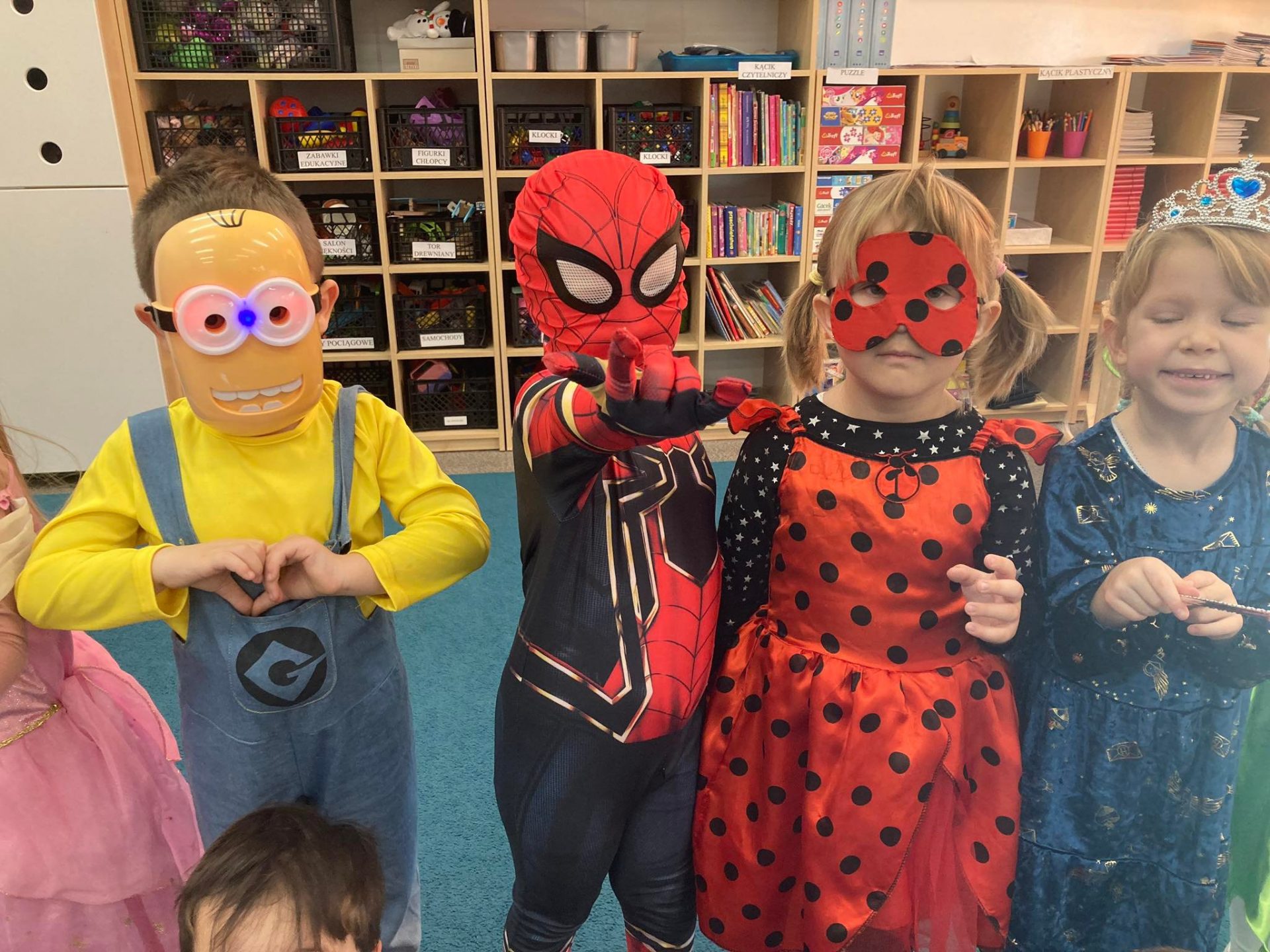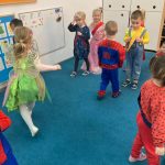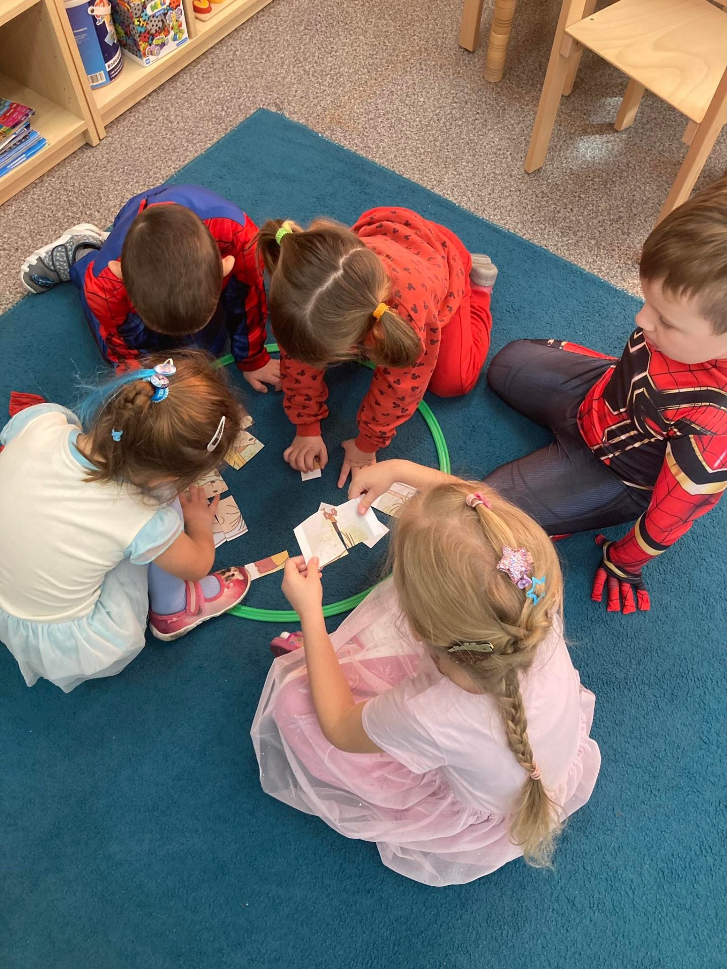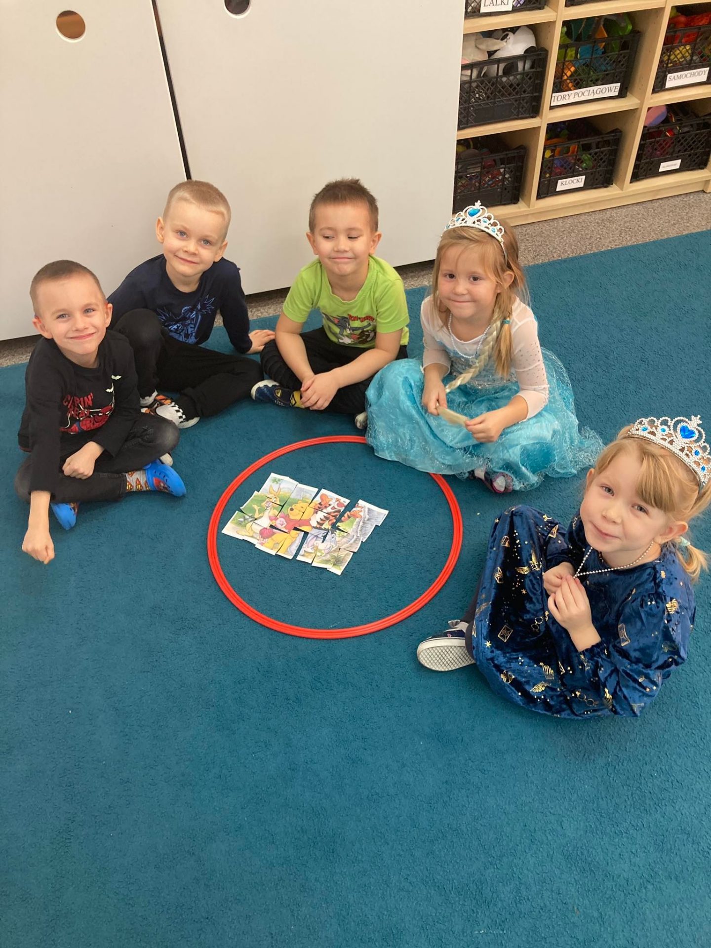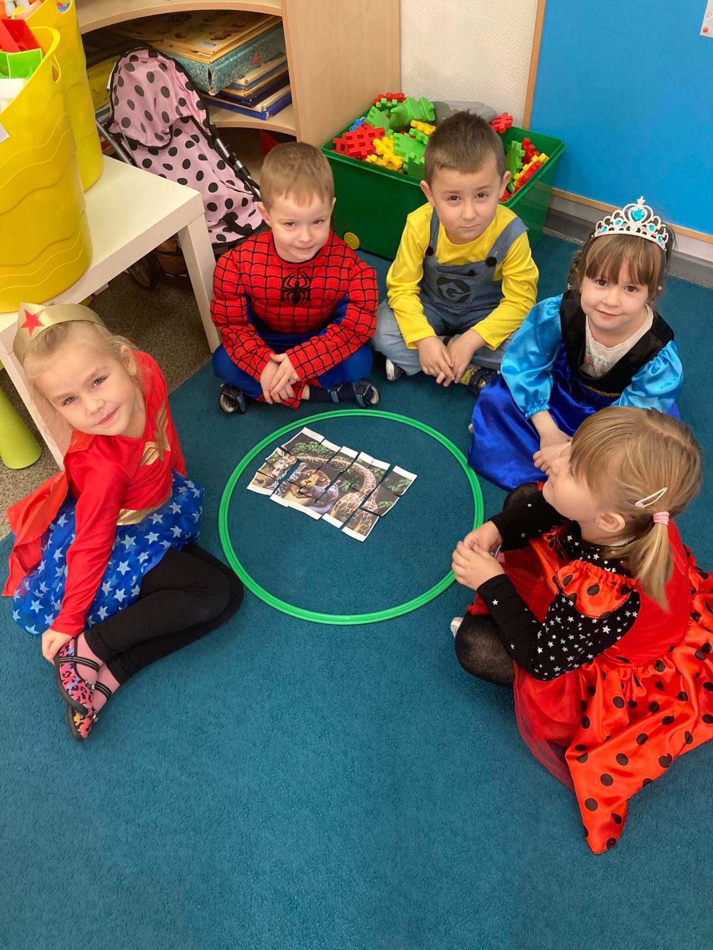 W czwartek 3 listopada grupa przedszkolna „Słoneczniki” obchodziła w swoim gronie „Dzień Postaci z Bajek”. W tym dniu dzieci pojawiły się w przedszkolu w bajkowych strojach i koszulkach, o których z radością opowiadały i prezentowały sobie nawzajem. W ramach zajęć przedszkolaki uczestniczyły między innymi w zabawie „Zatrute jabłko”, podczas której siedząc w kręgu podawały sobie jabłko z rąk do rąk w rytm muzyki.