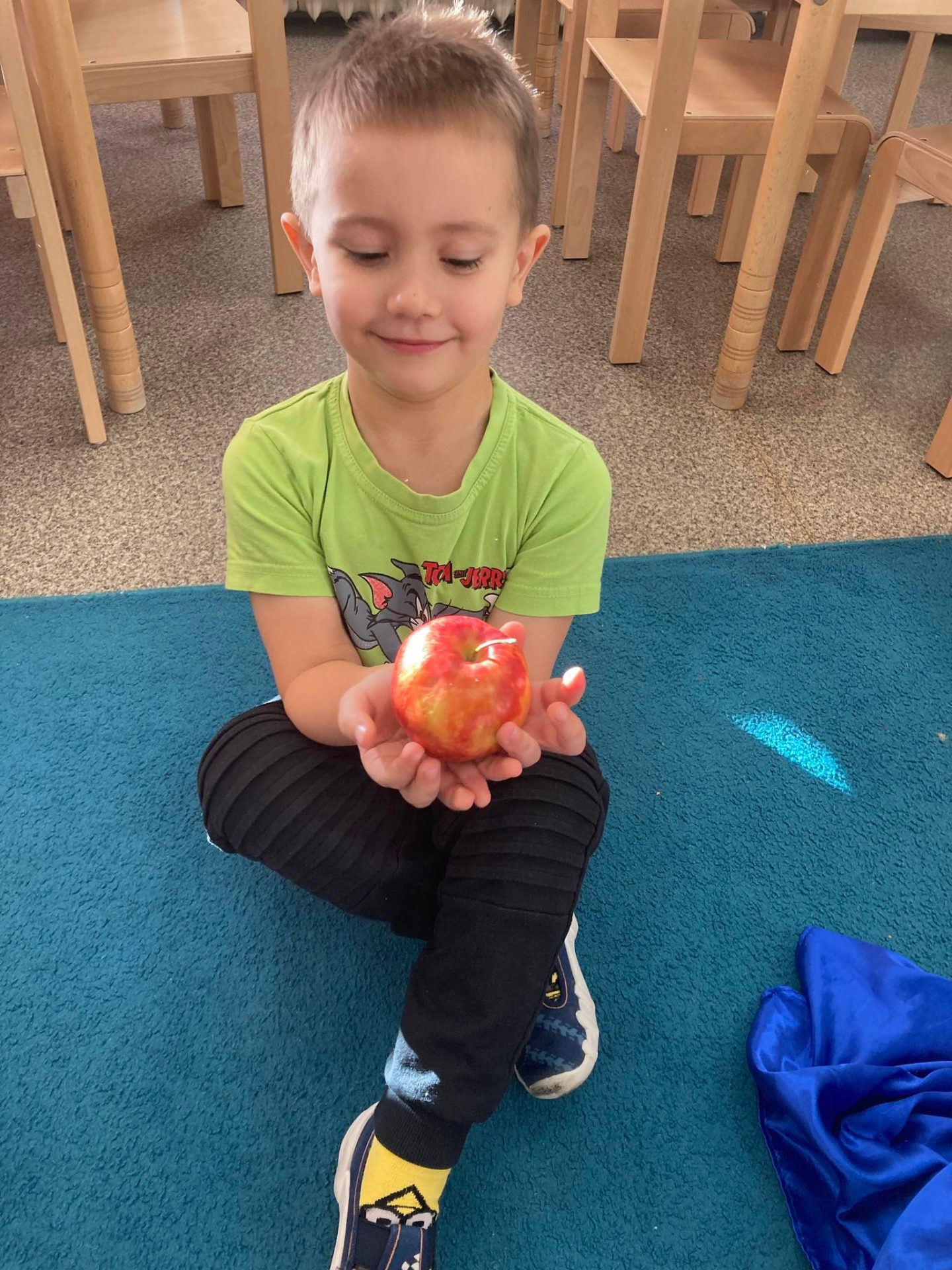 Na przerwę w muzyce dziecko, które pozostało z owocem w ręku zapadało w głęboki sen niczym Królewna Śnieżka. Ta zabawa przyniosła dzieciom wiele śmiechu i zachęciła ich do dalszej zabawy. Przedszkolaki brały również udział w zabawie ruchowej „Uwaga, wilk!” z podziałem na zespoły, układały bajkowe puzzle i odgadywały ich tytuły, malowały farbami oraz tańczyły z balonami do bajkowych przebojów.