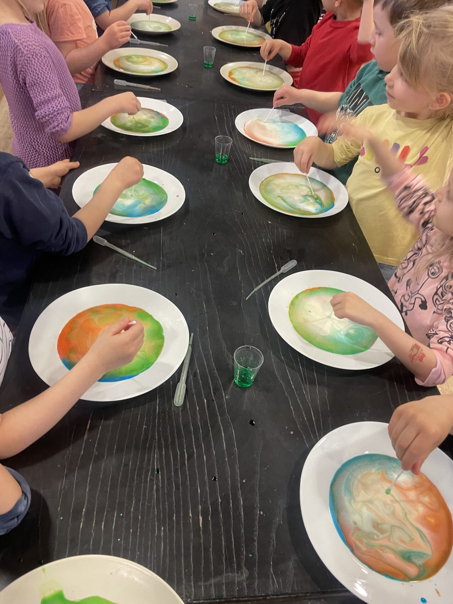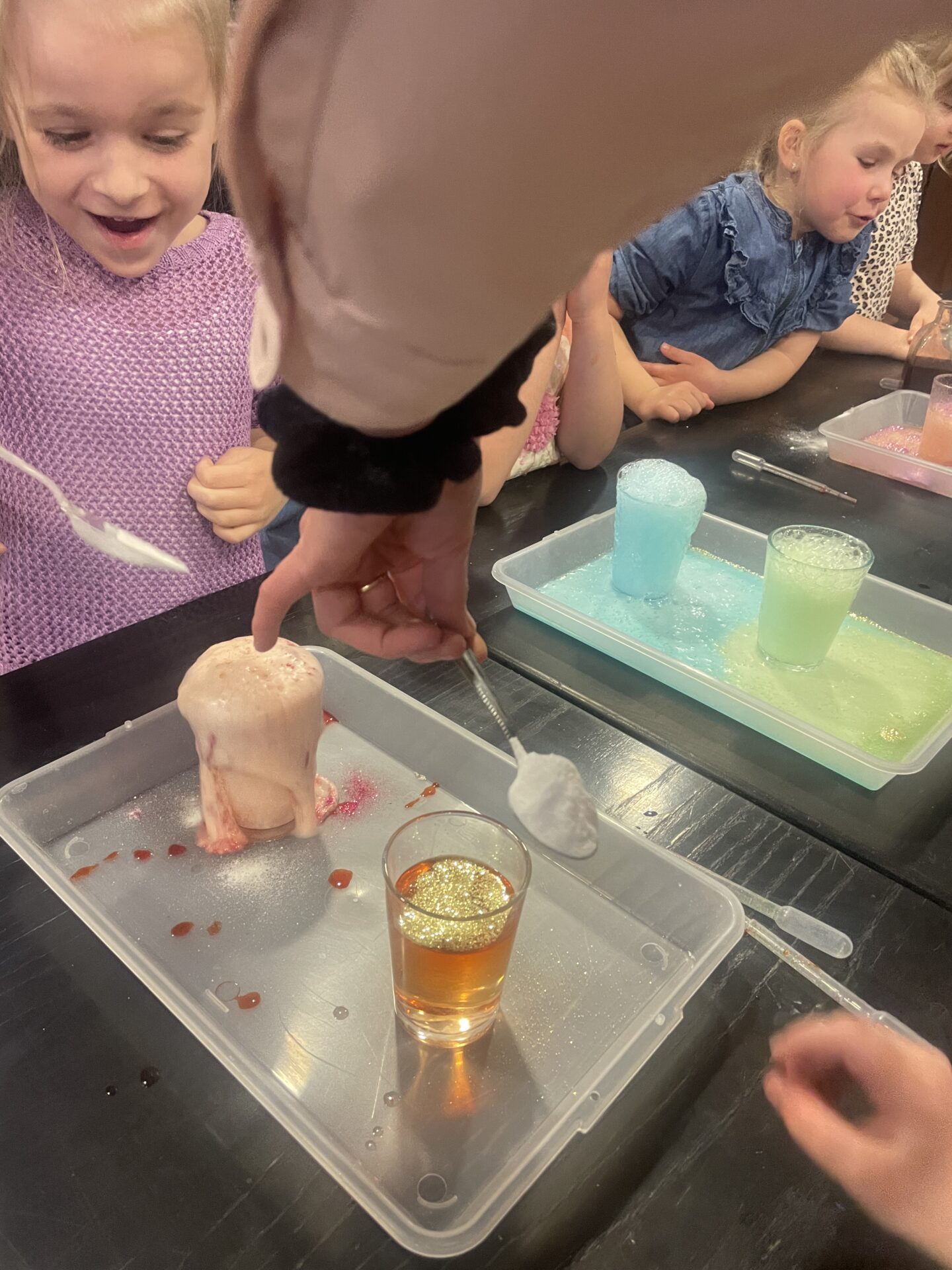 Każde dziecko mogło indywidualnie lub wraz z całą grupą wykonać kilka eksperymentów, których efekt za każdym razem okazał się spektakularny. Przedszkolaki wykonały takie eksperyment, jak: „kolorowe mleko”, „wulkan”, czy „lampa z lawą”. Każdy uczestnik otrzymał niezbędne do wykonania doświadczeń przyrządy oraz składniki. Nie zabrakło również eksperymentów z balonami! Dzieci z zaciekawieniem oglądały pokaz pompowania baloników z wykorzystaniem octu i sody, a także starały się umieścić wykałaczki w balonie bez jego przebijania.