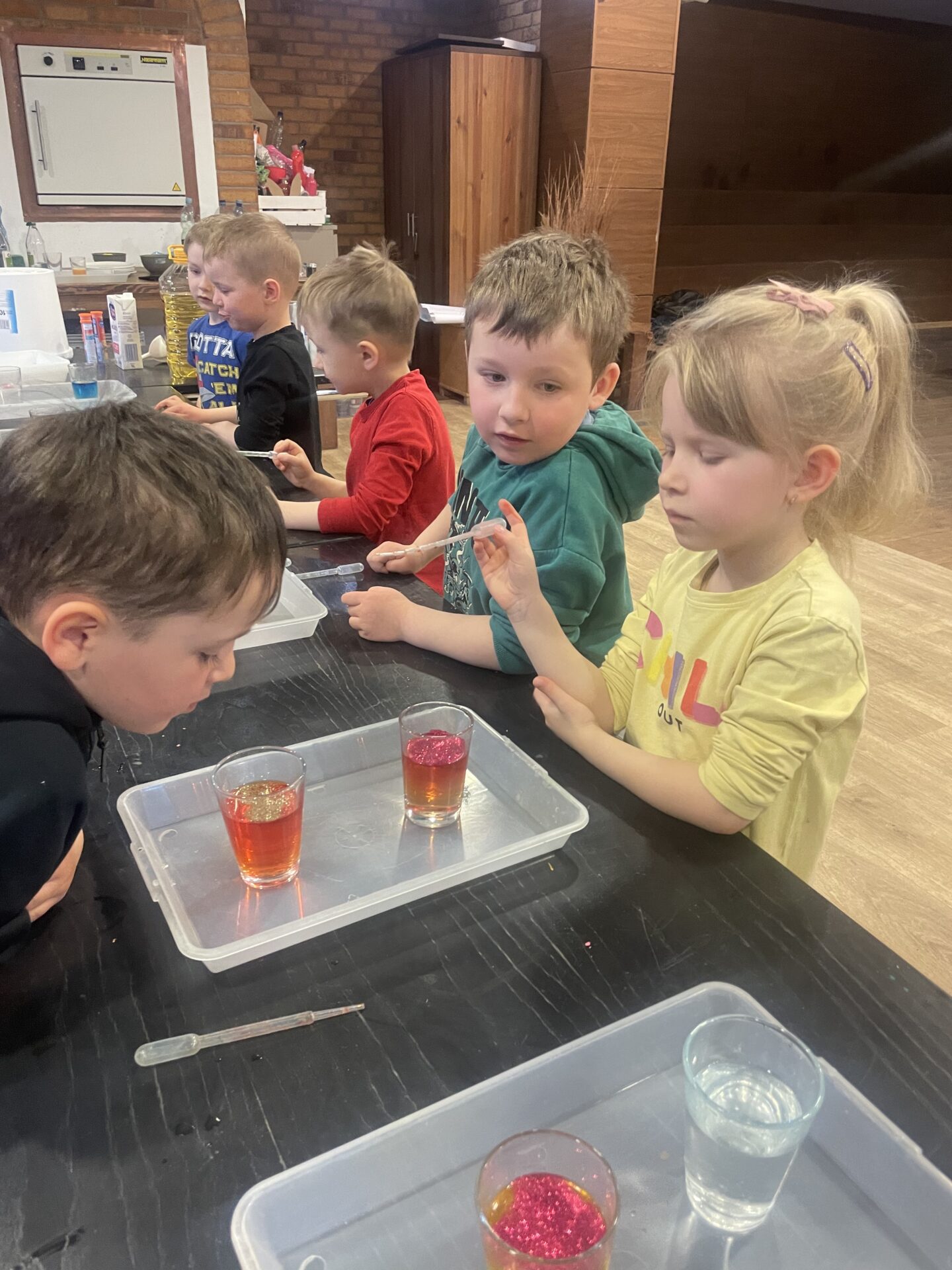 Przedszkolaki uważnie słuchały instrukcji oraz wyjaśnień osób prowadzących zajęcia, a następnie, w pełnym skupieniu wykonywały wszystkie eksperymenty. Całe zajęcia odbyły się pod bacznym okiem wychowawczyń oraz pań prowadzących, dzięki czemu były w pełni bezpieczną zabawą dla dzieci. Przedszkolaki były zachwycone zajęciami i uczestniczyły w nich z wielkim zainteresowaniem.