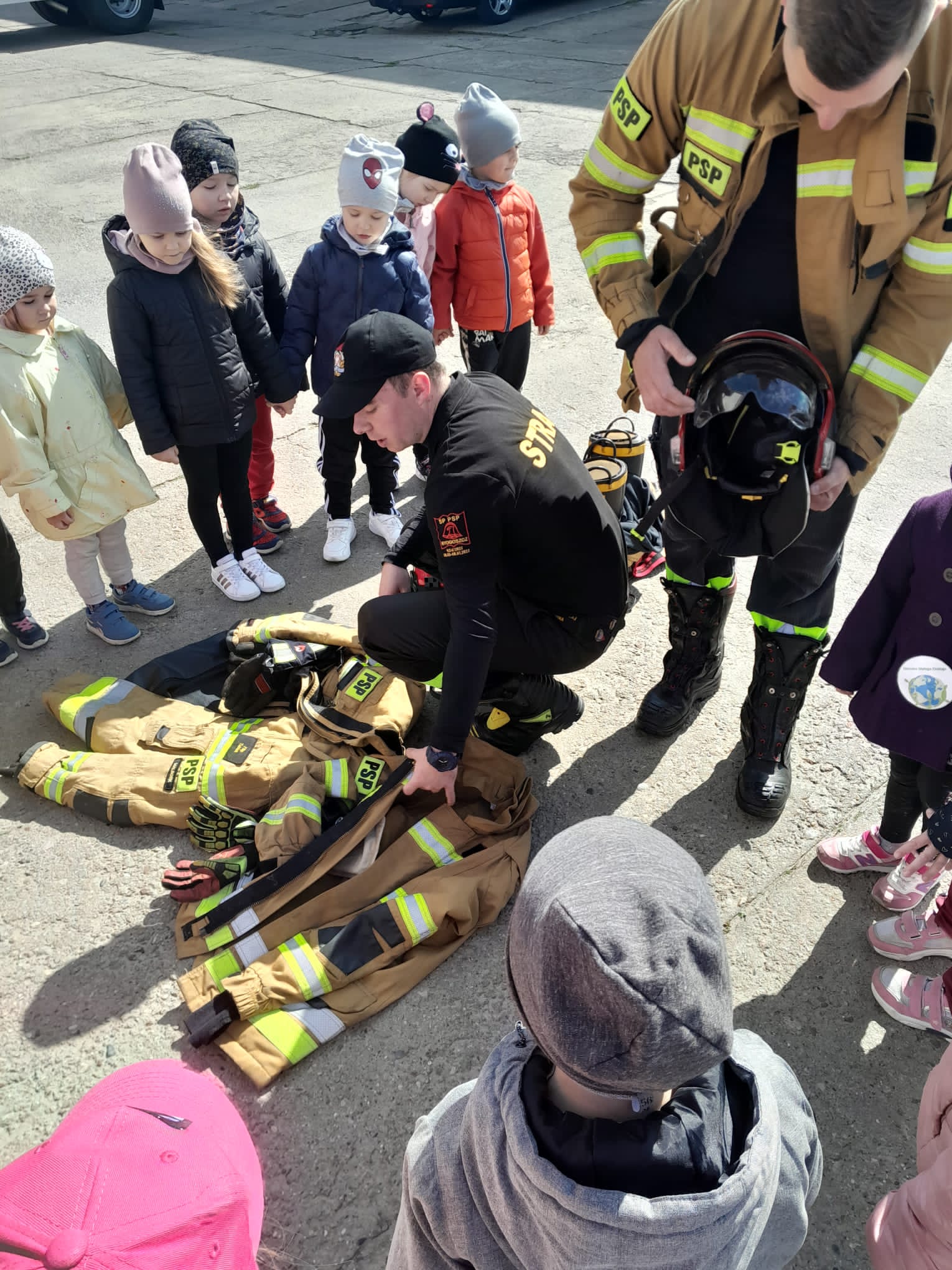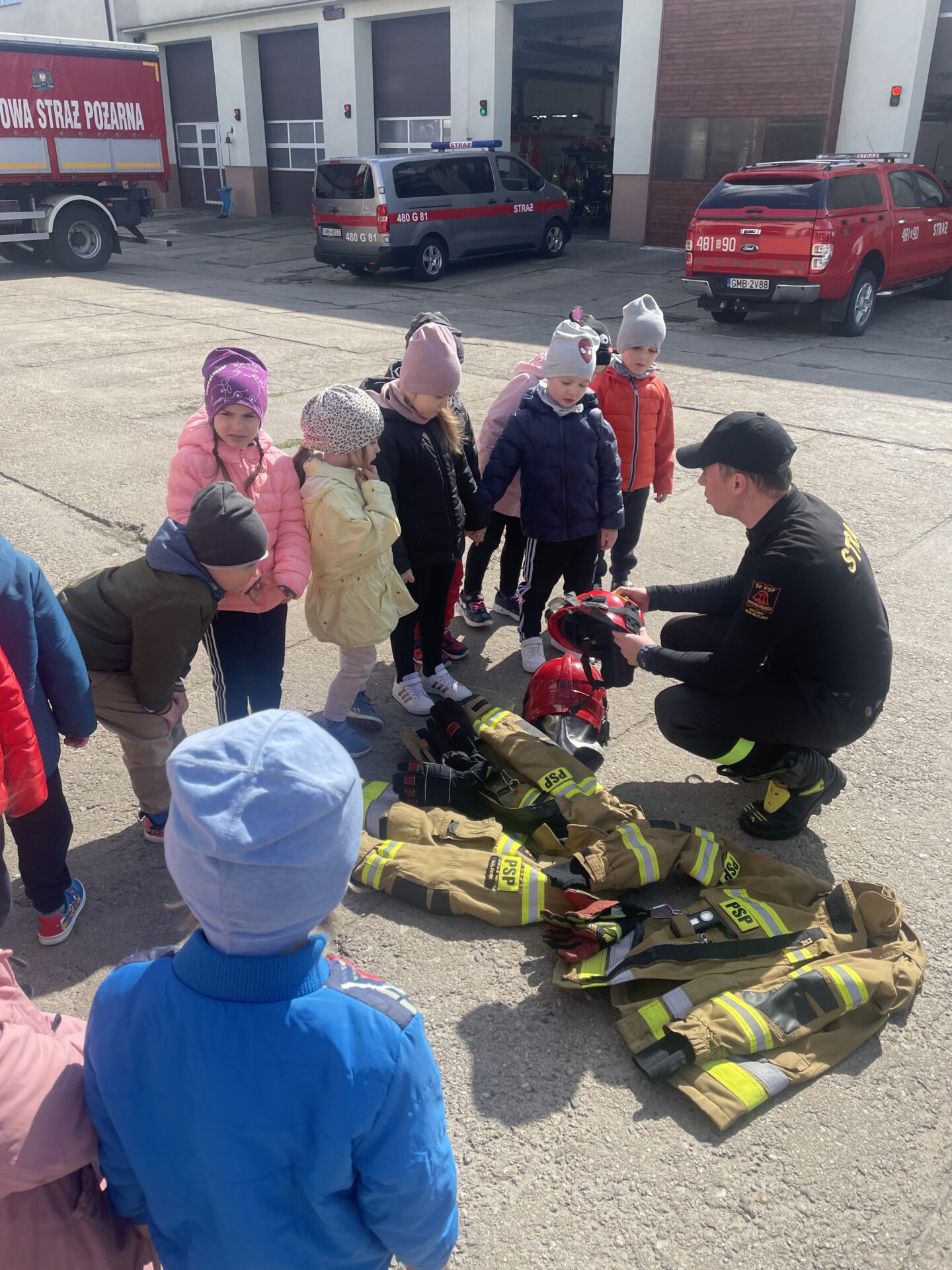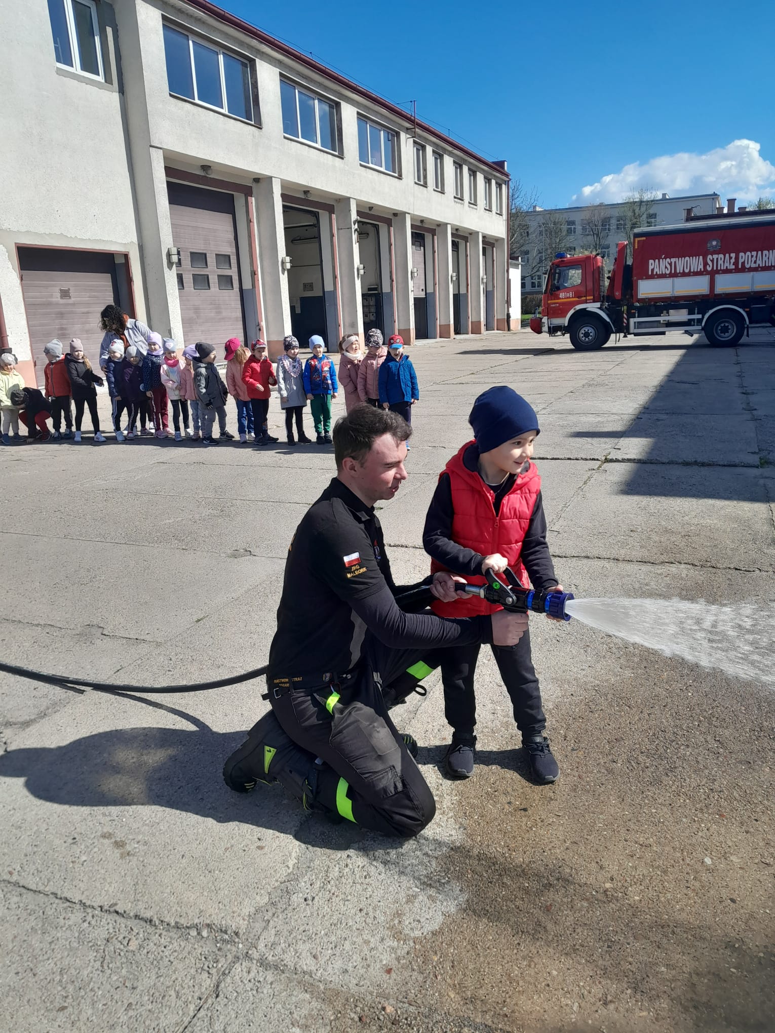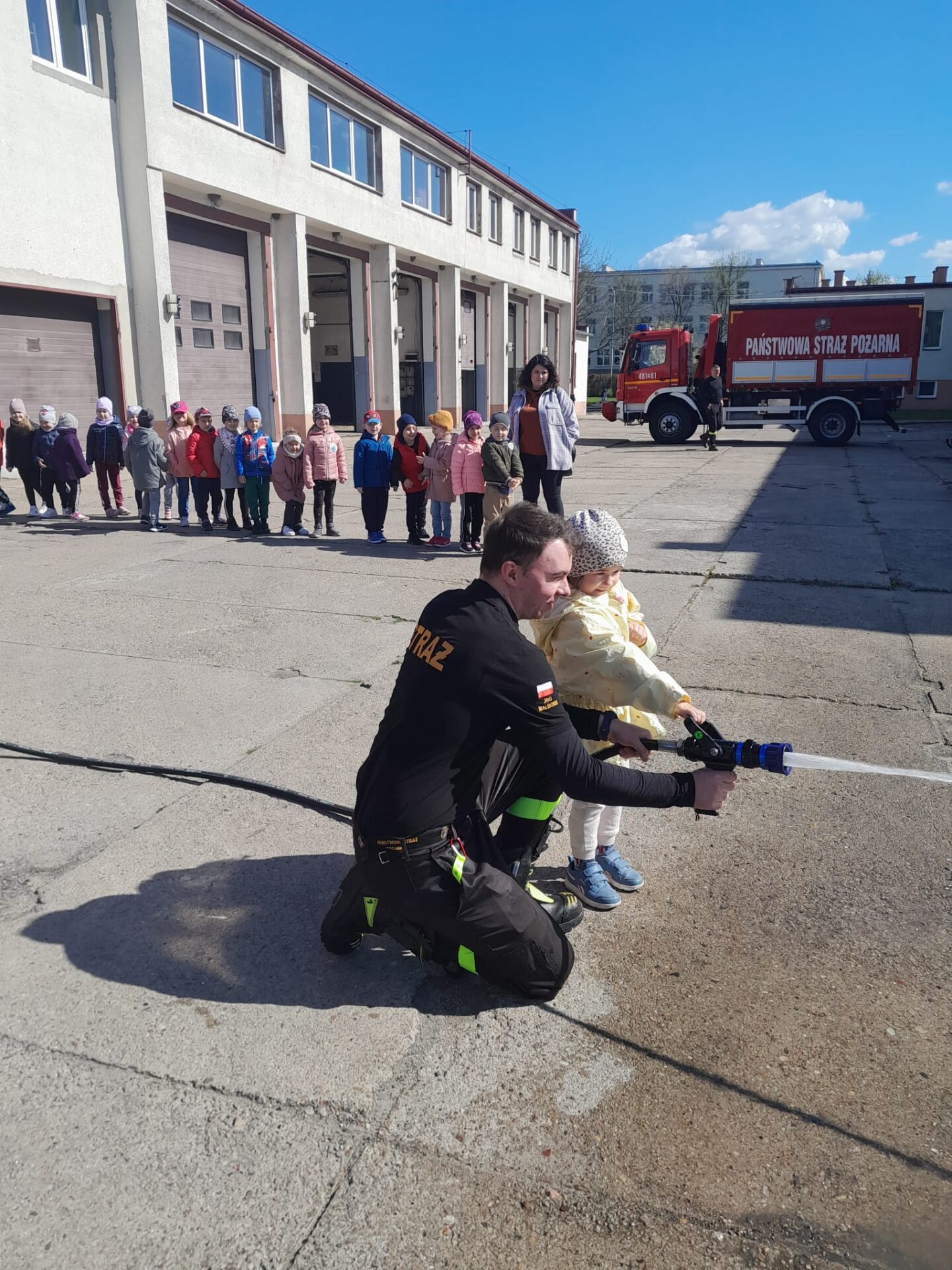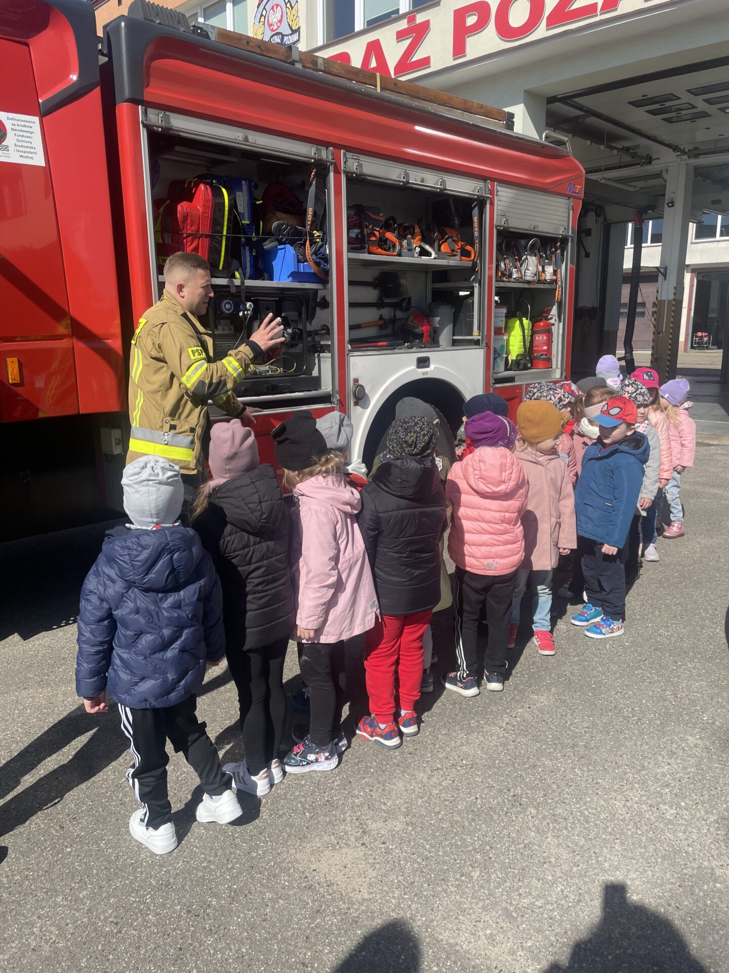 W piątek 28 kwietnia 2023r. przedszkolaki z grupy „Słoneczniki” wybrały się z Panią Natalią na wycieczkę do Komendy Powiatowej Państwowej Straży Pożarnej w Malborku. Dzięki życzliwości Panów Strażaków dzieci mogły z bliska obejrzeć wozy strażackie oraz sprzęt pożarniczy. W trakcie rozmowy ze strażakami przedszkolaki dowiedziały się dużo na temat pracy strażaka, która na co dzień wymaga od niego dużo odwagi, siły oraz ogólnej sprawności. Przedszkolaki dowiedziały się, że strażak pomaga nie tylko w czasie pożaru, ale także wspomaga policję i inne służby ratownicze podczas wypadków drogowych oraz wodnych. Dzieci miały możliwość obserwacji obsługi poszczególnych narzędzi i sprzętów, poznały przeznaczenie i działanie hydrantu, a także obejrzały dokładnie cały strój strażaka.