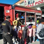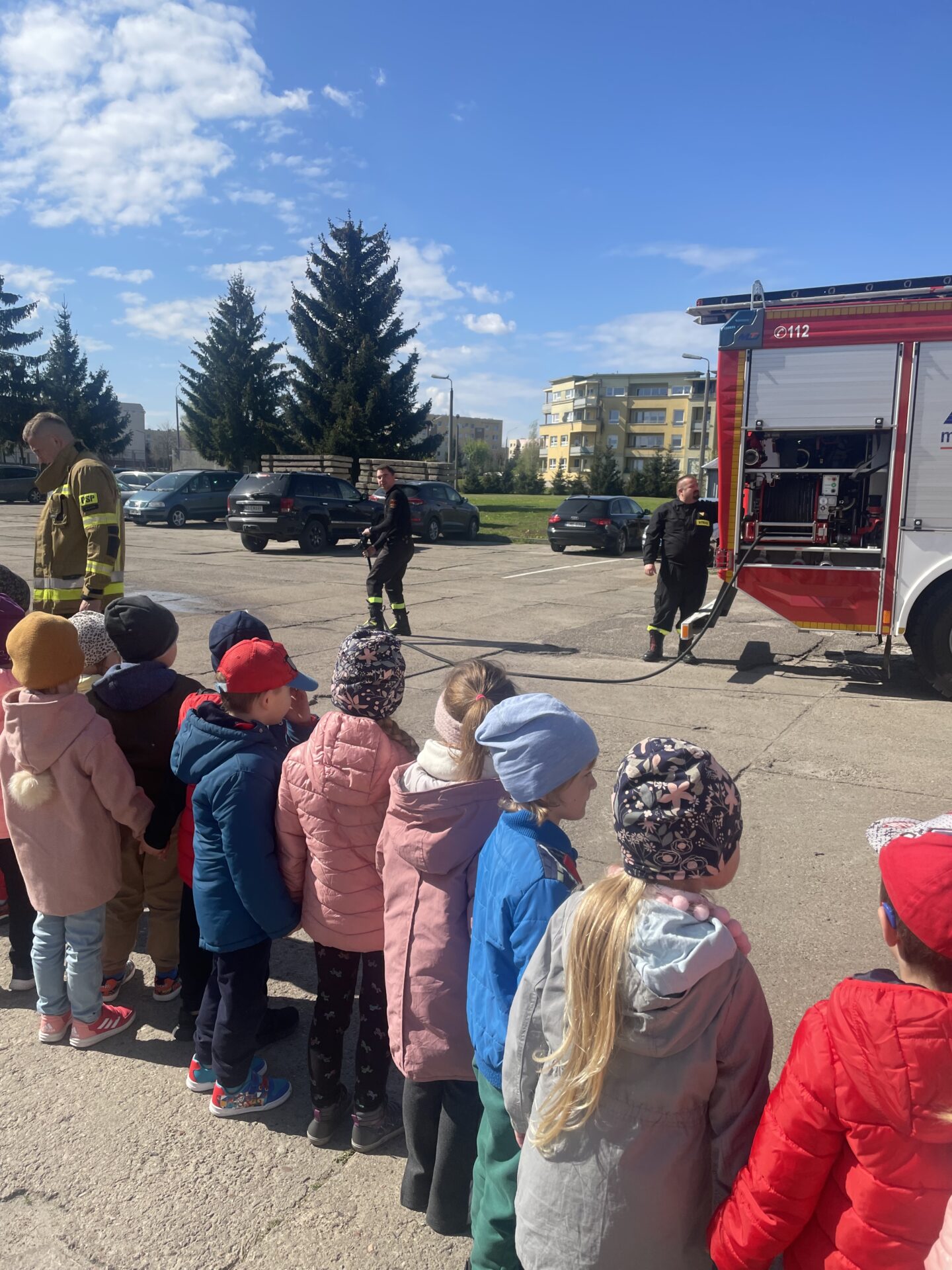 Słoneczniki oglądały różnorodne samochody, wozy strażackie, łódki oraz quady. Z zaciekawieniem oglądały pokaz przejazdu wozów strażackich z włączoną syreną alarmową. Wielką atrakcją dla wszystkich była możliwość trzymania i lania wodą z węża strażackiego. Strażacy przypomnieli dzieciom, w jakich okolicznościach można wezwać straż pożarną, a dzieci utrwaliły numery alarmowe – 112 i 998. Ponadto, Panowie Strażacy opowiedzieli o zasadach przygotowania sprzętu oraz wozu strażackiego przed akcją ratunkową. Od tej pory wszystkie dzieci pamiętają, że bardzo ważne jest, aby każdy wóz strażacki po każdej akcji był zawsze zatankowany wodą oraz paliwem do pełna. Tylko wtedy, dzięki szybkim i sprawnym działaniom strażaków, pomoc dla osób potrzebujących będzie mogła nadejść najszybciej jak to możliwe.