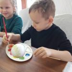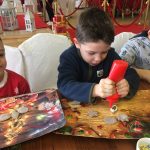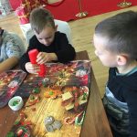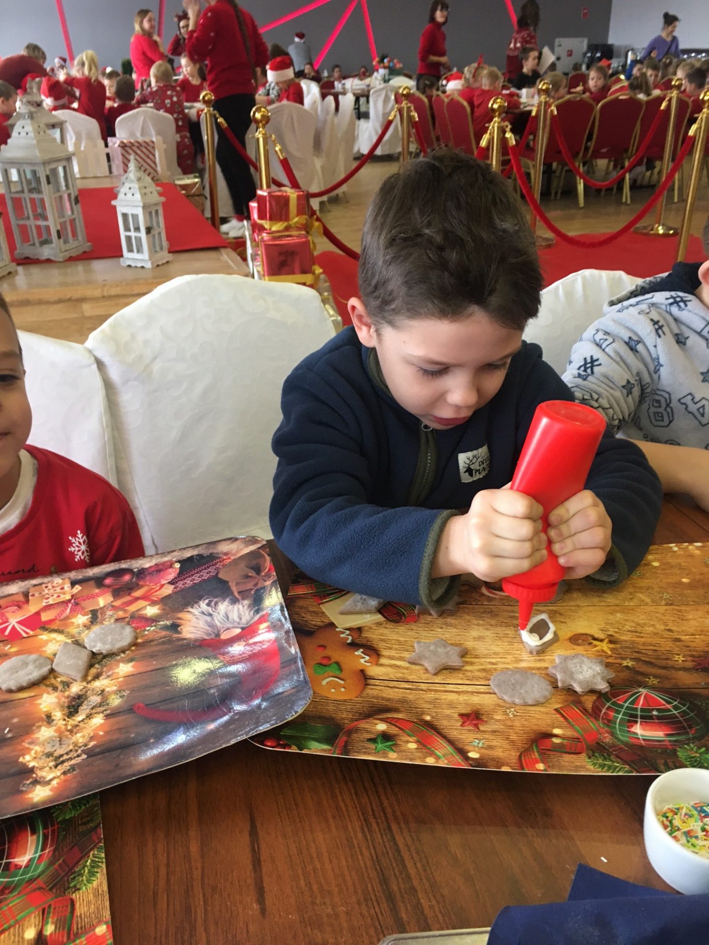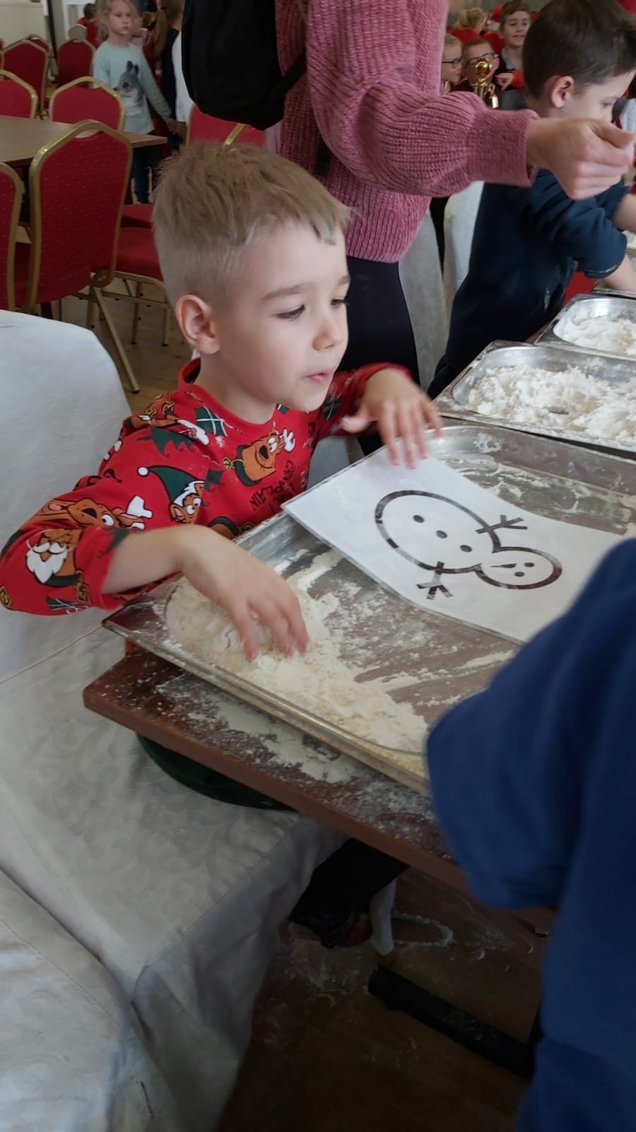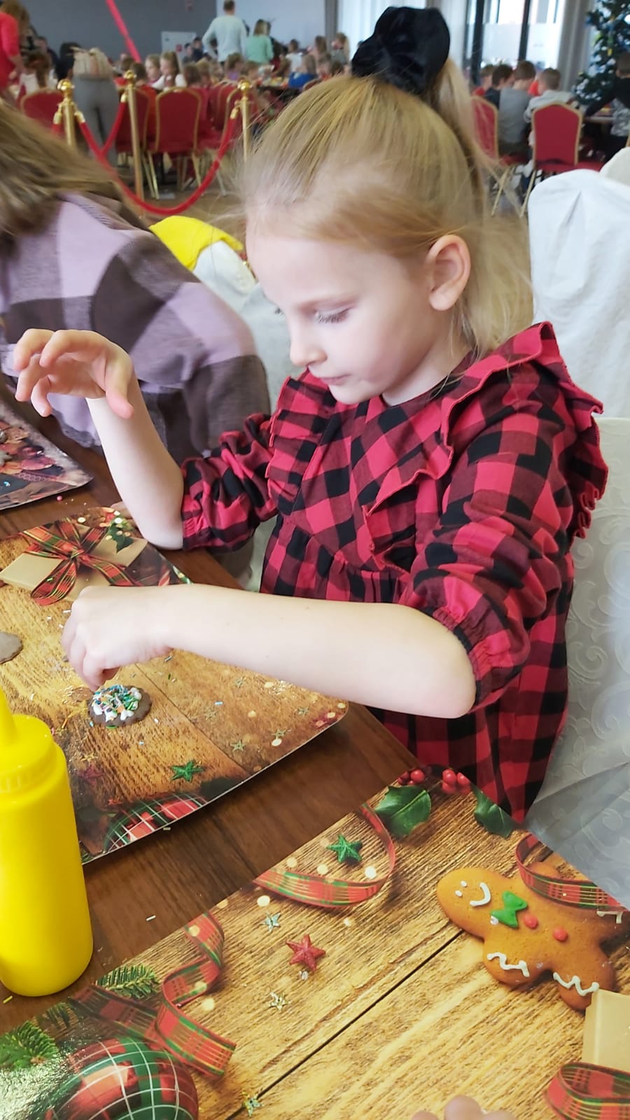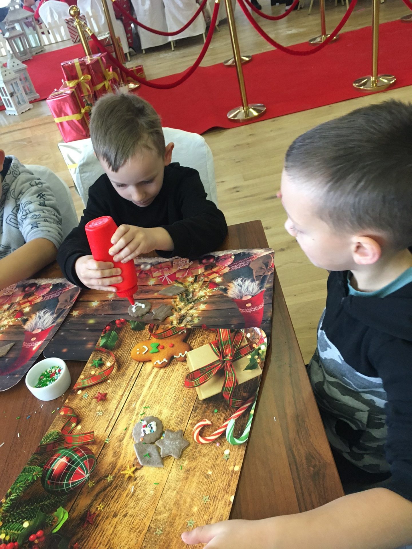 Święta tuż tuż… Dlatego też zerówkowicze z grupy „Fiołki” rozpoczęli swój tydzień od udziału w świątecznych warsztatach w Gościńcu nad Wisłą. Na dzieci czekało mnóstwo atrakcji, m.in. pisanie listów do Świętego Mikołaja, dekorowanie pierniczków, ozdabianie bombek, świąteczne kolorowanki, klejenie łańcuchów na choinkę, zabawy na dmuchańcu i inne. Przedszkolaki były zachwycone, jednak z niecierpliwością wyczekiwały spotkania z wyjątkowym gościem, na którego czekają cały rok. Każde z dzieci mogło zamienić kilka słów ze Świętym Mikołajem i zrobić sobie pamiątkowe zdjęcie. Radości nie było końca. Dzisiejsza wizyta z pewnością na długo zapadnie w naszej pamięci.