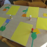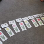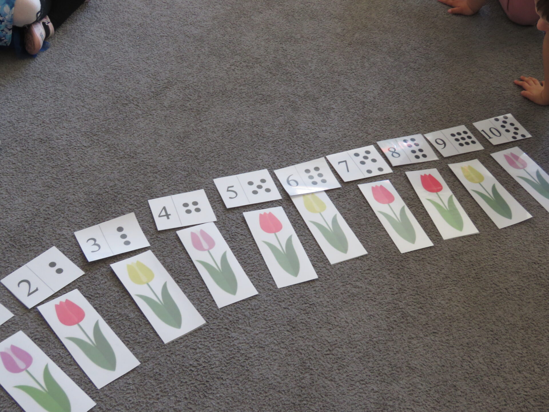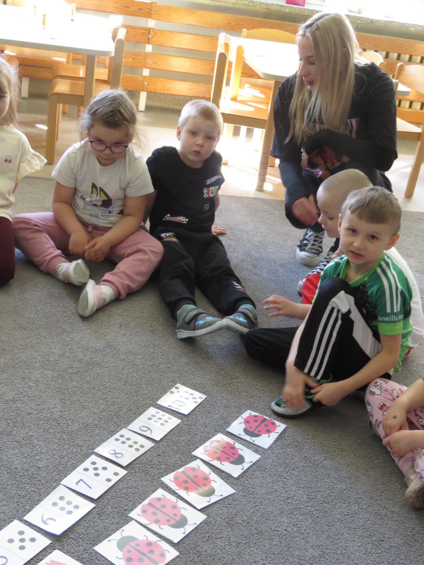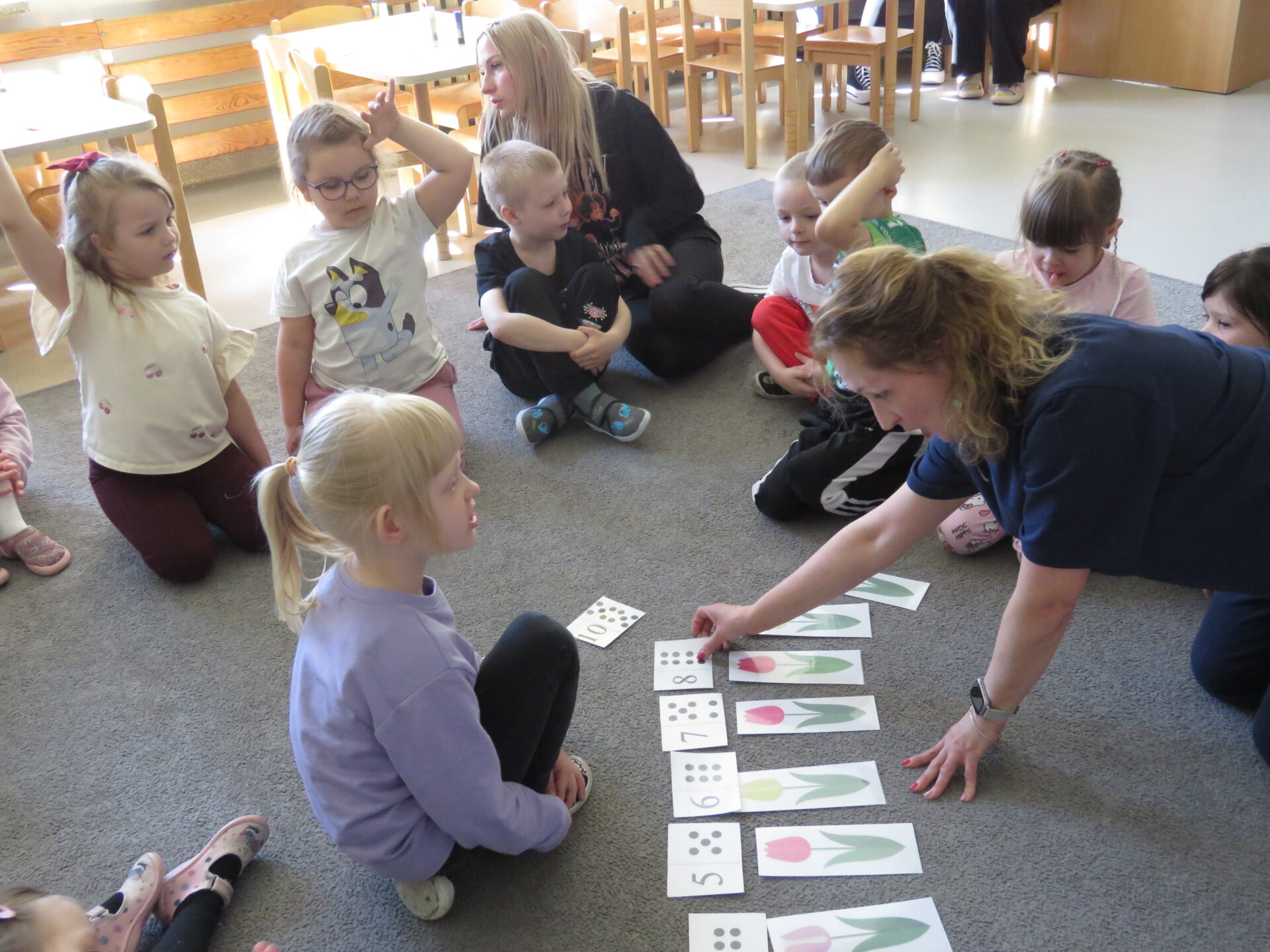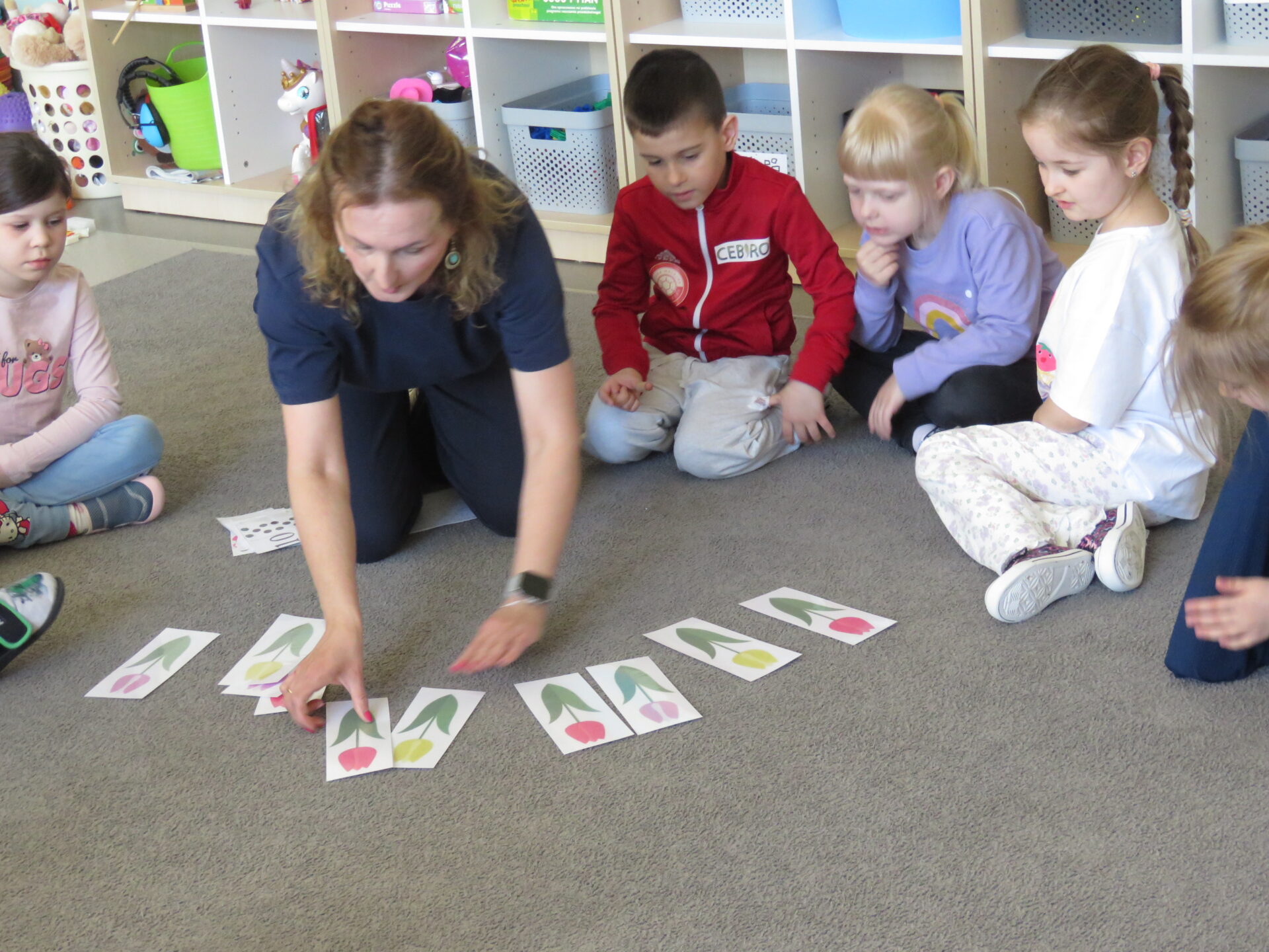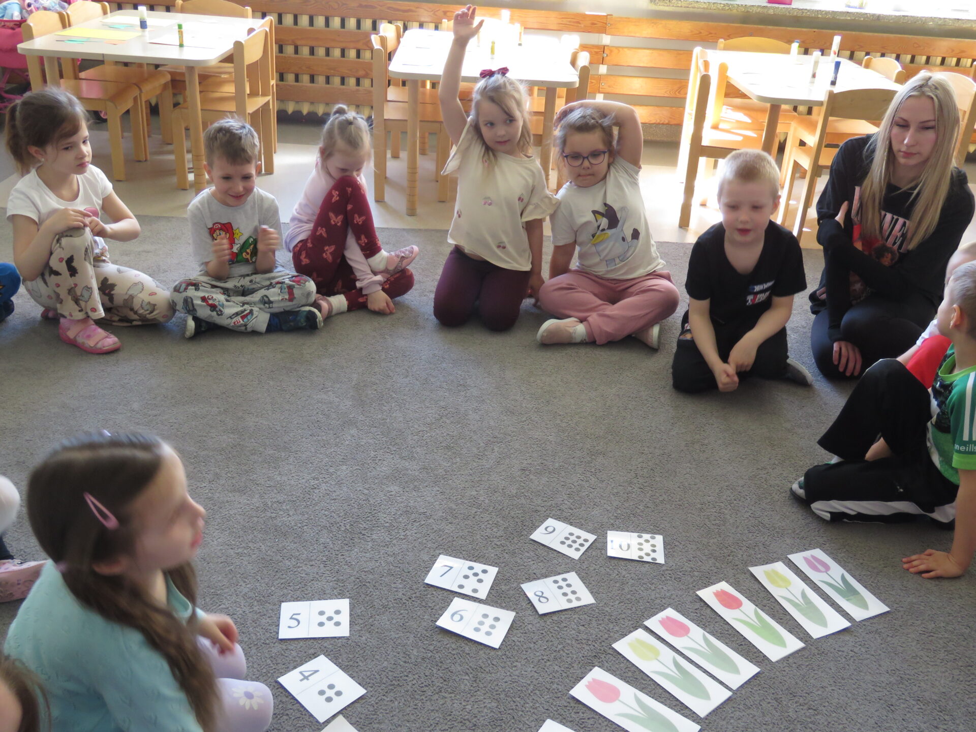 Nauczycielka po rozłożeniu na dywanie tulipanów, poprosiła o policzenie ich razem i ułożenie graficznego obraz danej liczby. Następnie zabrała 5 tulipanów, zostawiła 5 kwiatów i dodała 5 biedronek. Zadała kolejne pytanie: ile mamy wszystkich elementów?, czy jest więcej kwiatów czy biedronek?, o ile więcej?